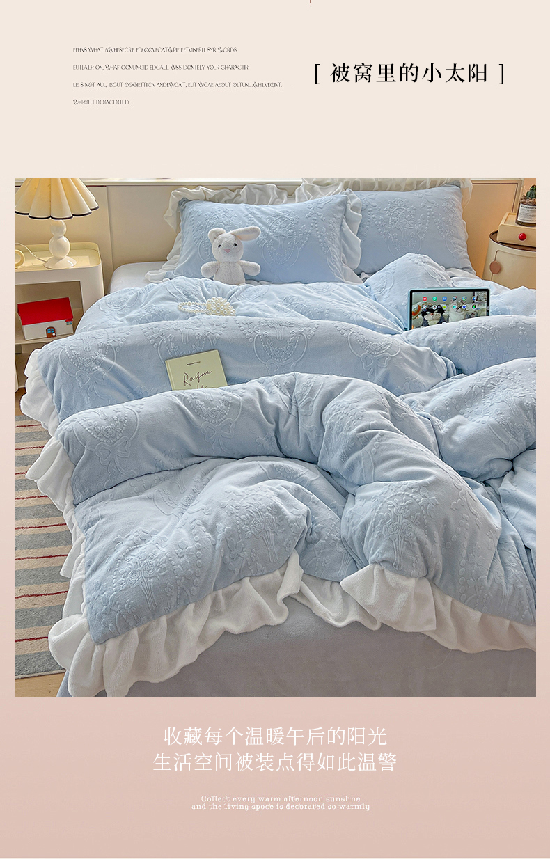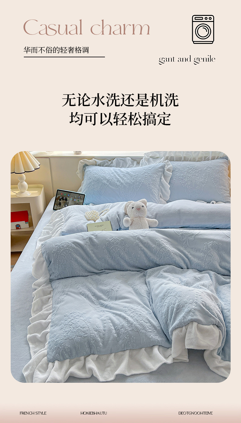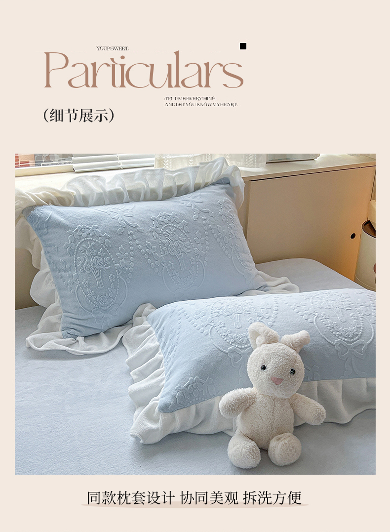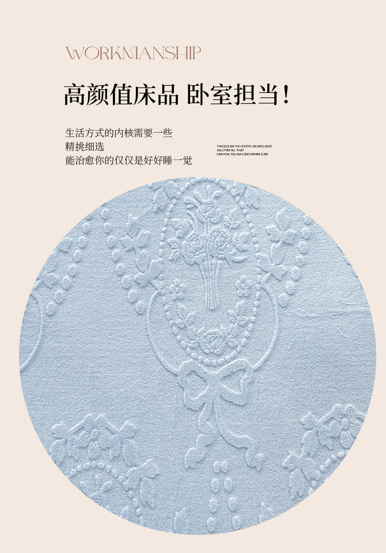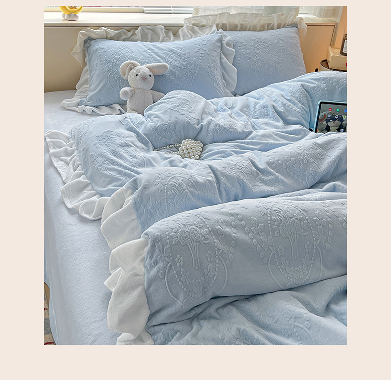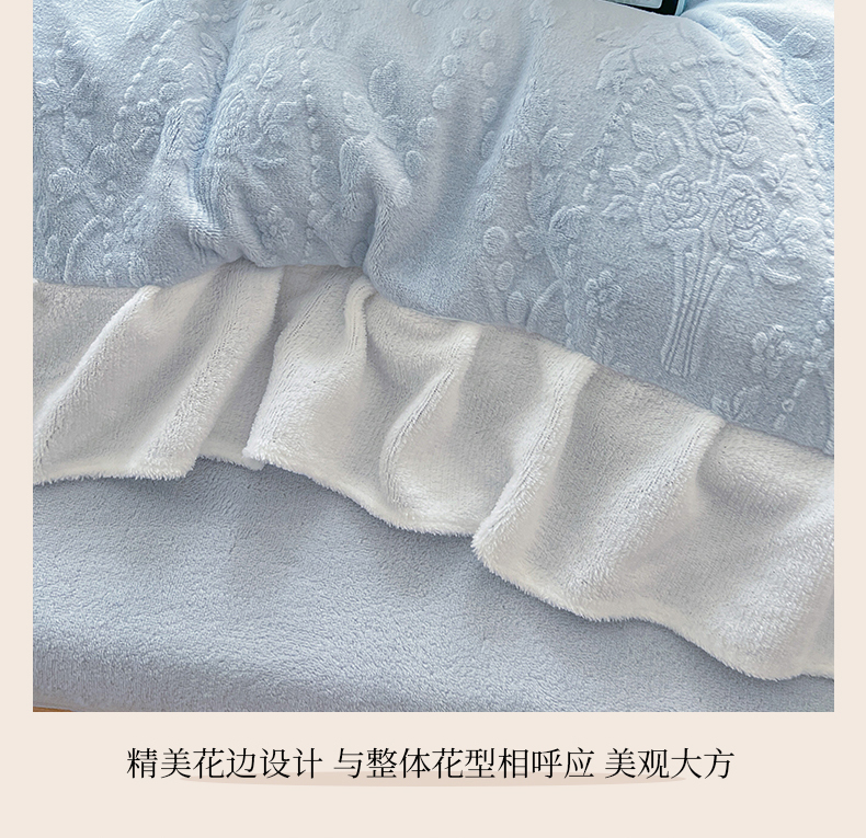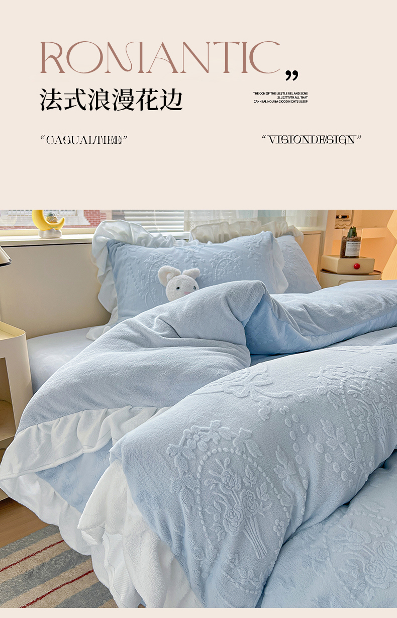 当前位置: 91家纺网 > 商品网购 > 床品套件 > 四件套 > 牛奶绒四件套 > 亿梵家居 2025新款法式花边款A类5D牛奶绒立体雕花四件套(提供买家秀) 花边款 手捧花-天空蓝