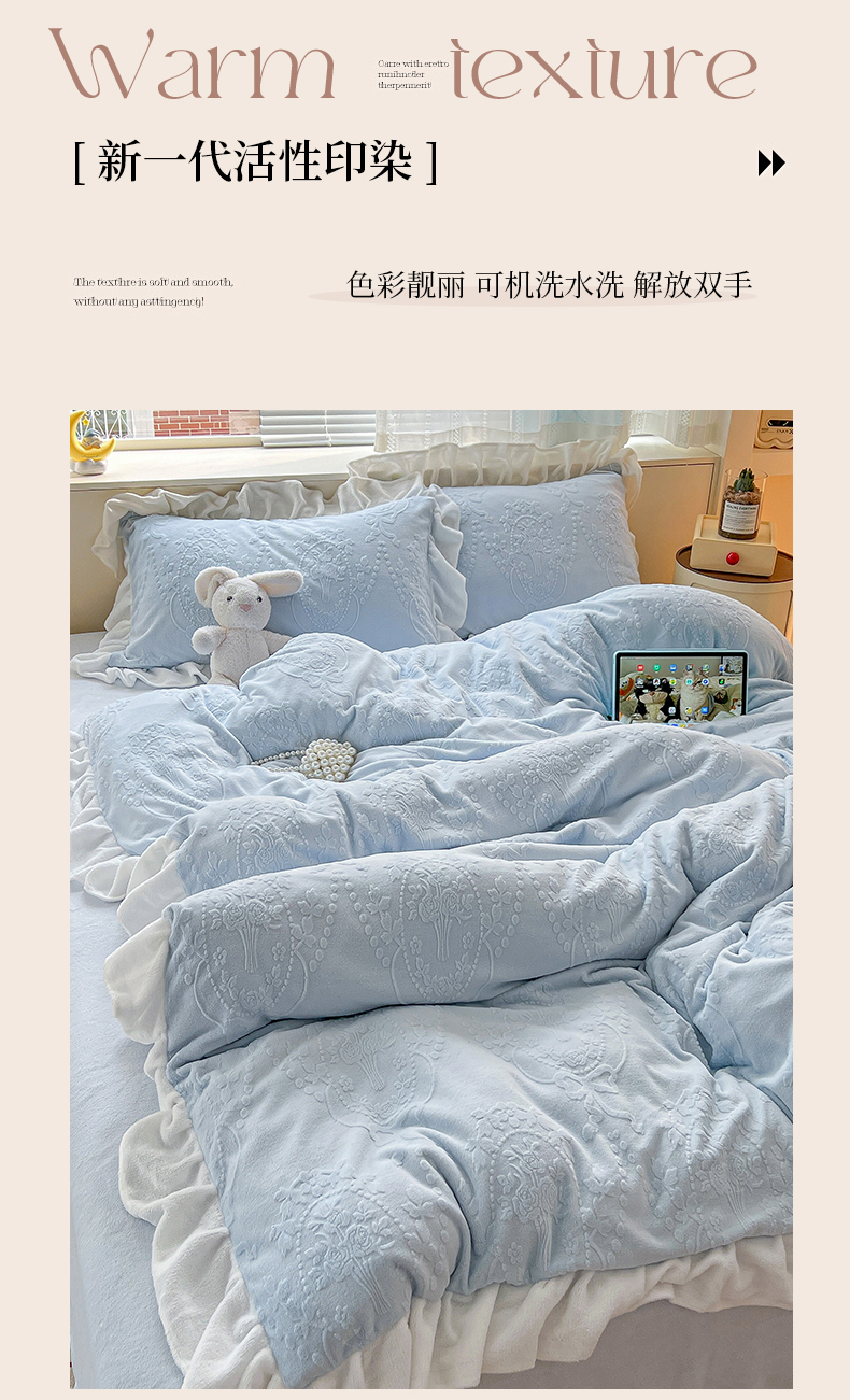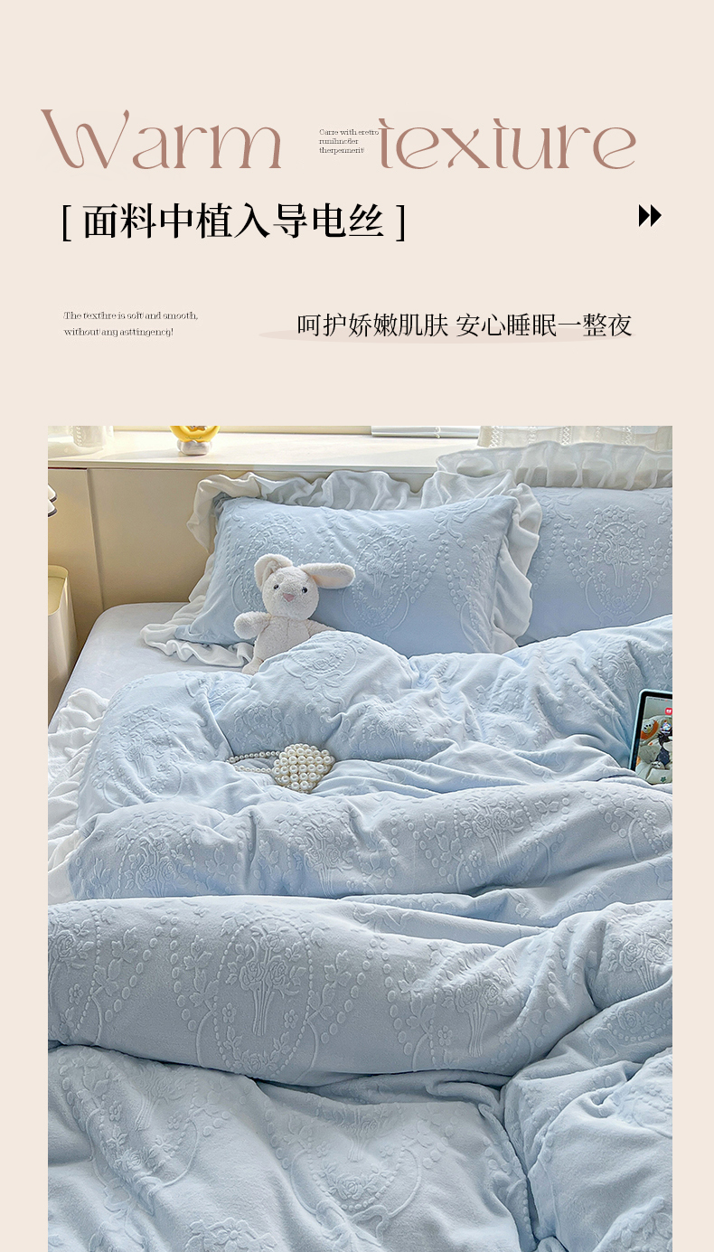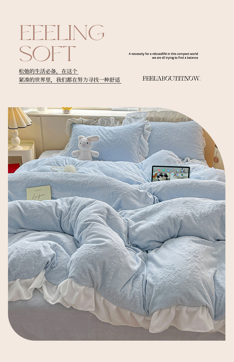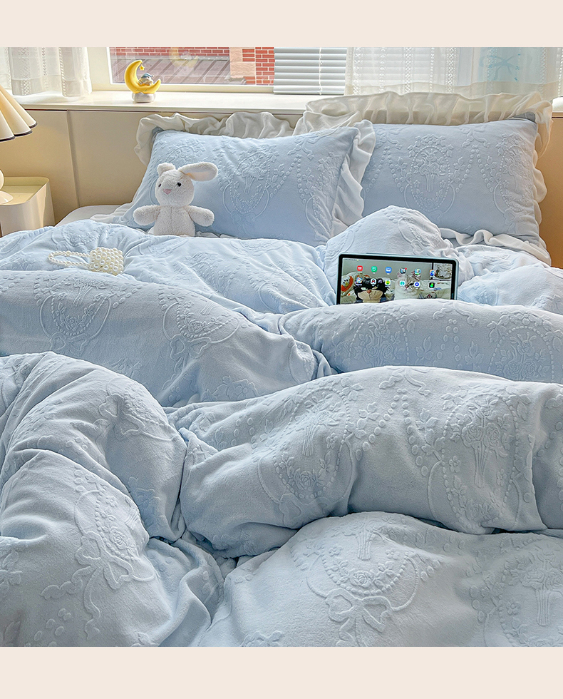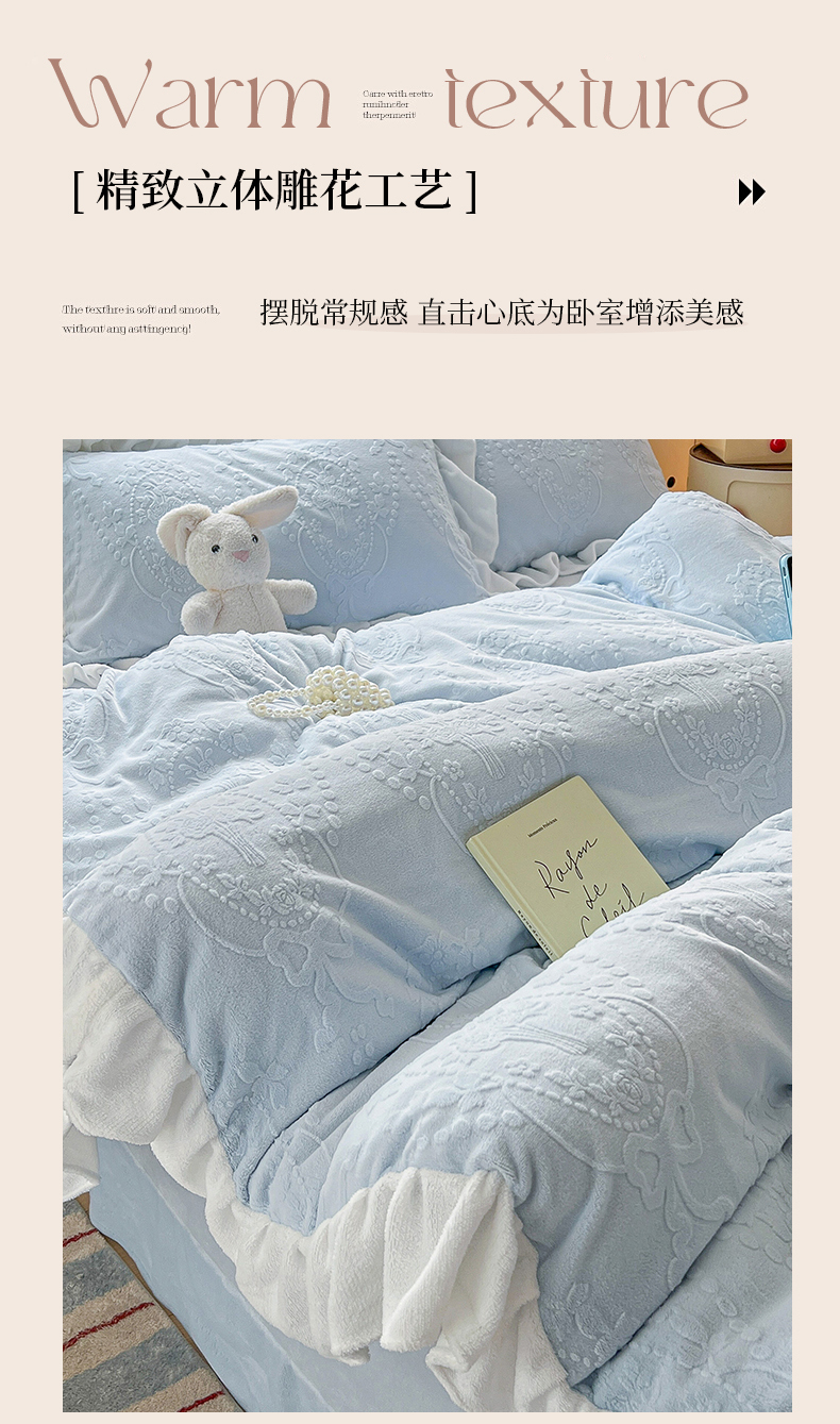 当前位置: 91家纺网 > 商品网购 > 床品套件 > 四件套 > 牛奶绒四件套 > 亿梵家居 2025新款法式花边款A类5D牛奶绒立体雕花四件套(提供买家秀) 花边款 手捧花-天空蓝