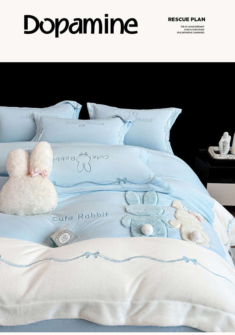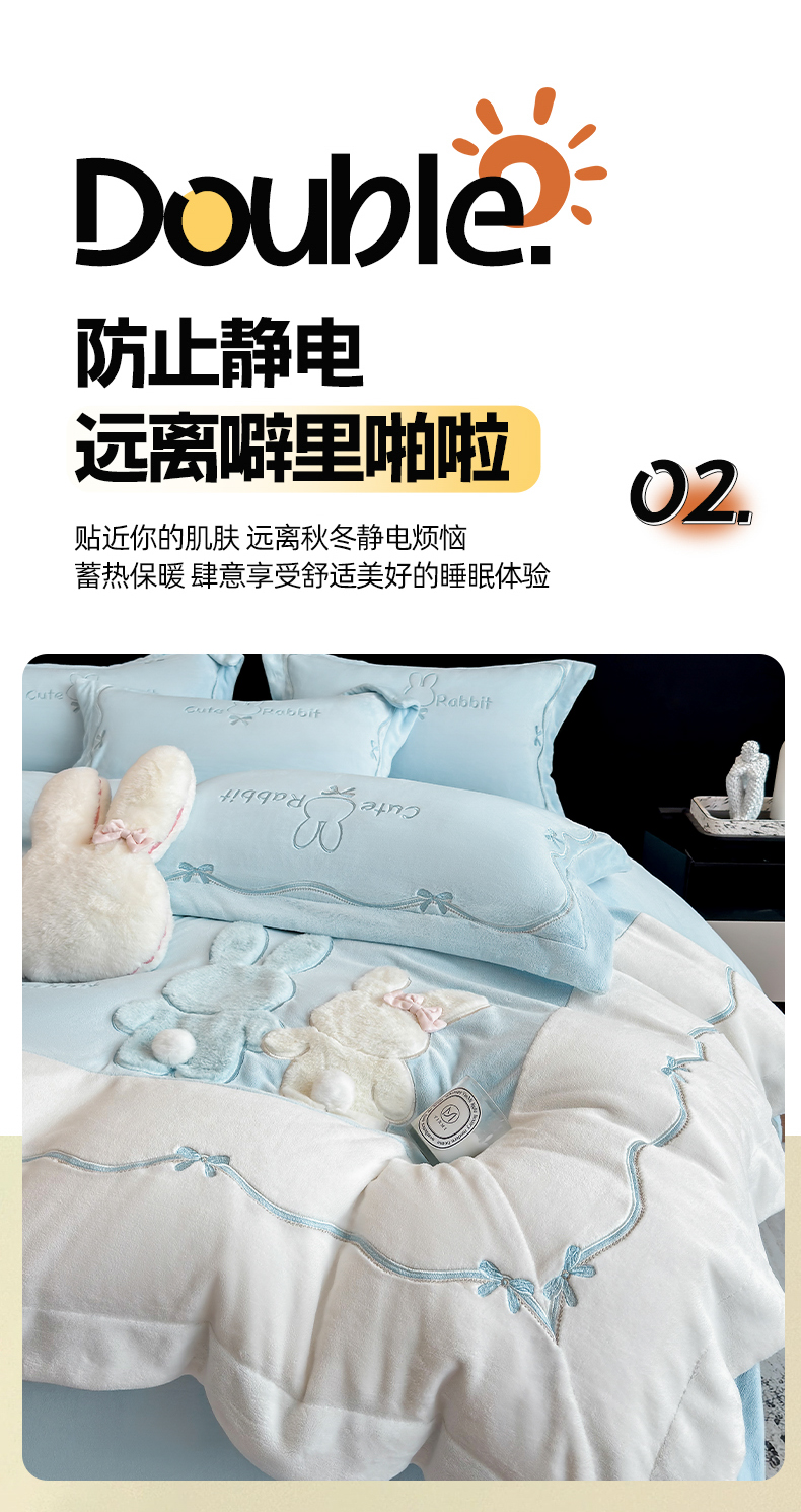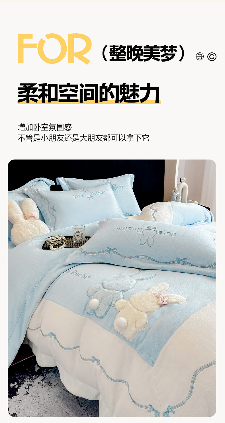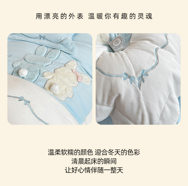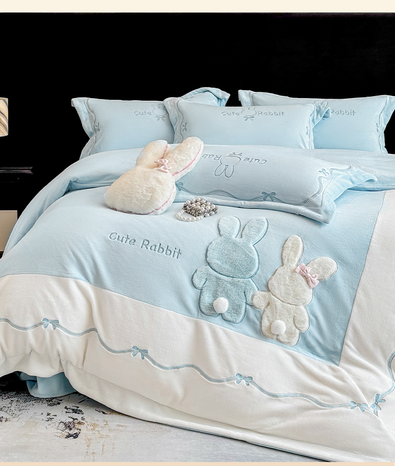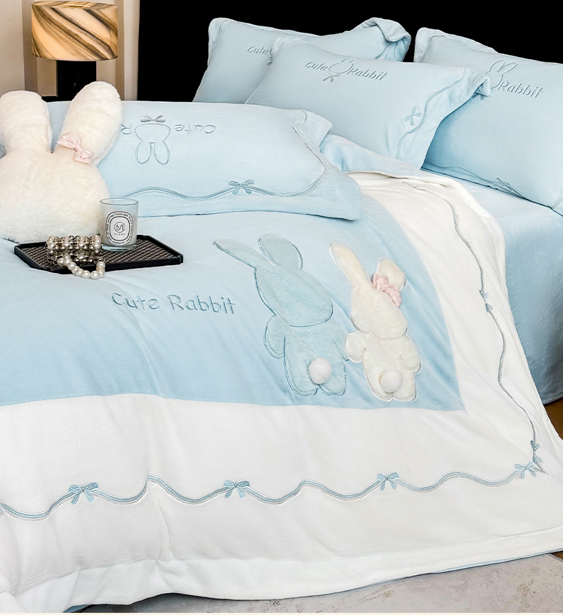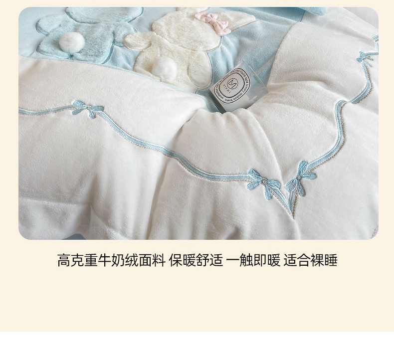 当前位置: 91家纺网 > 商品网购 > 床品套件 > 四件套 > 牛奶绒四件套 > 丞音家纺 2025新款卡通少女风A类230克全工艺全消光刺绣加厚牛奶绒四件套珊瑚绒绣花被套三件套高档包装 绒两小无猜-蓝拼白