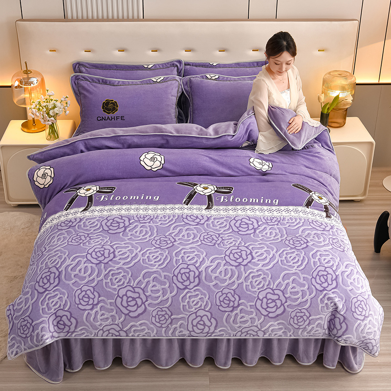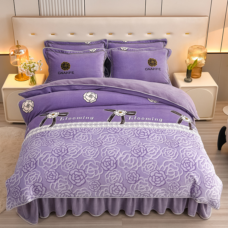 绘萱2025新品爆款8斤包边印花牛奶绒四件套床裙款法莱绒金貂貂狐 玫瑰花语-紫