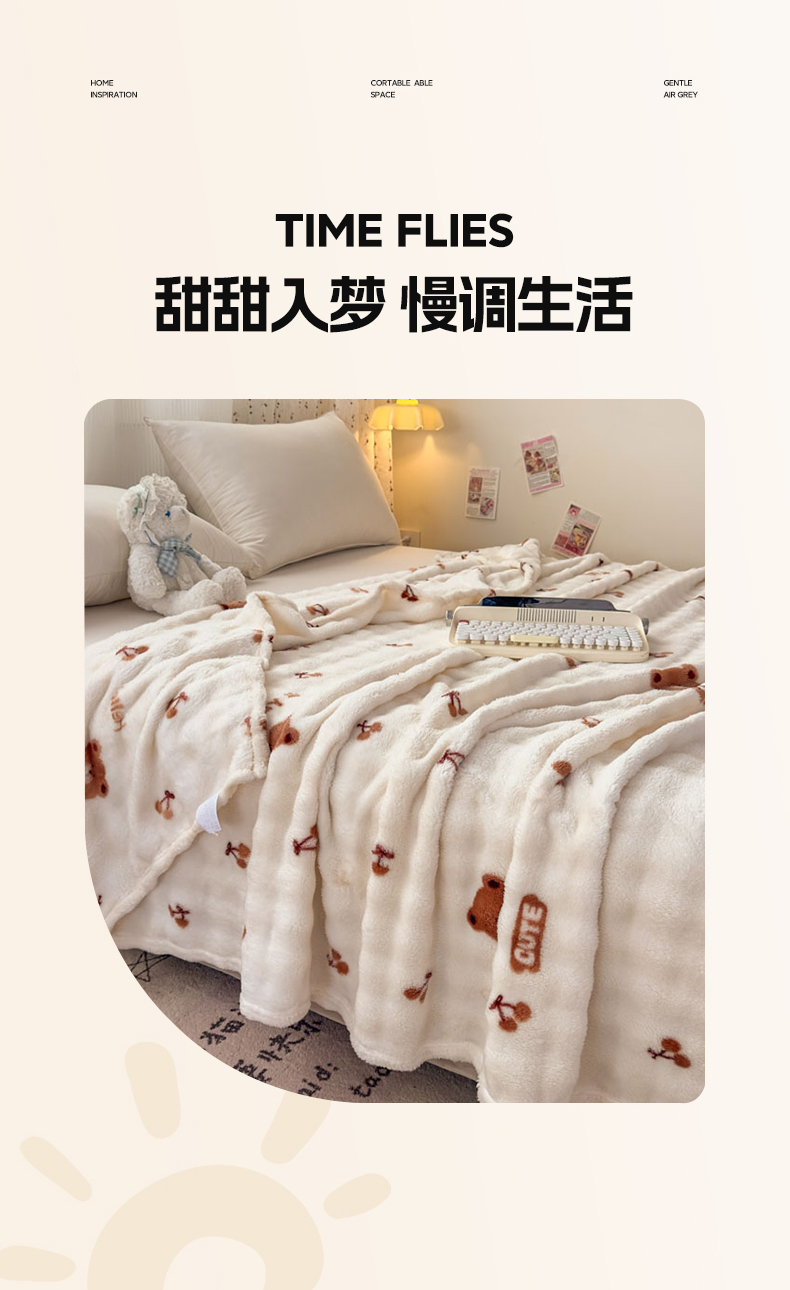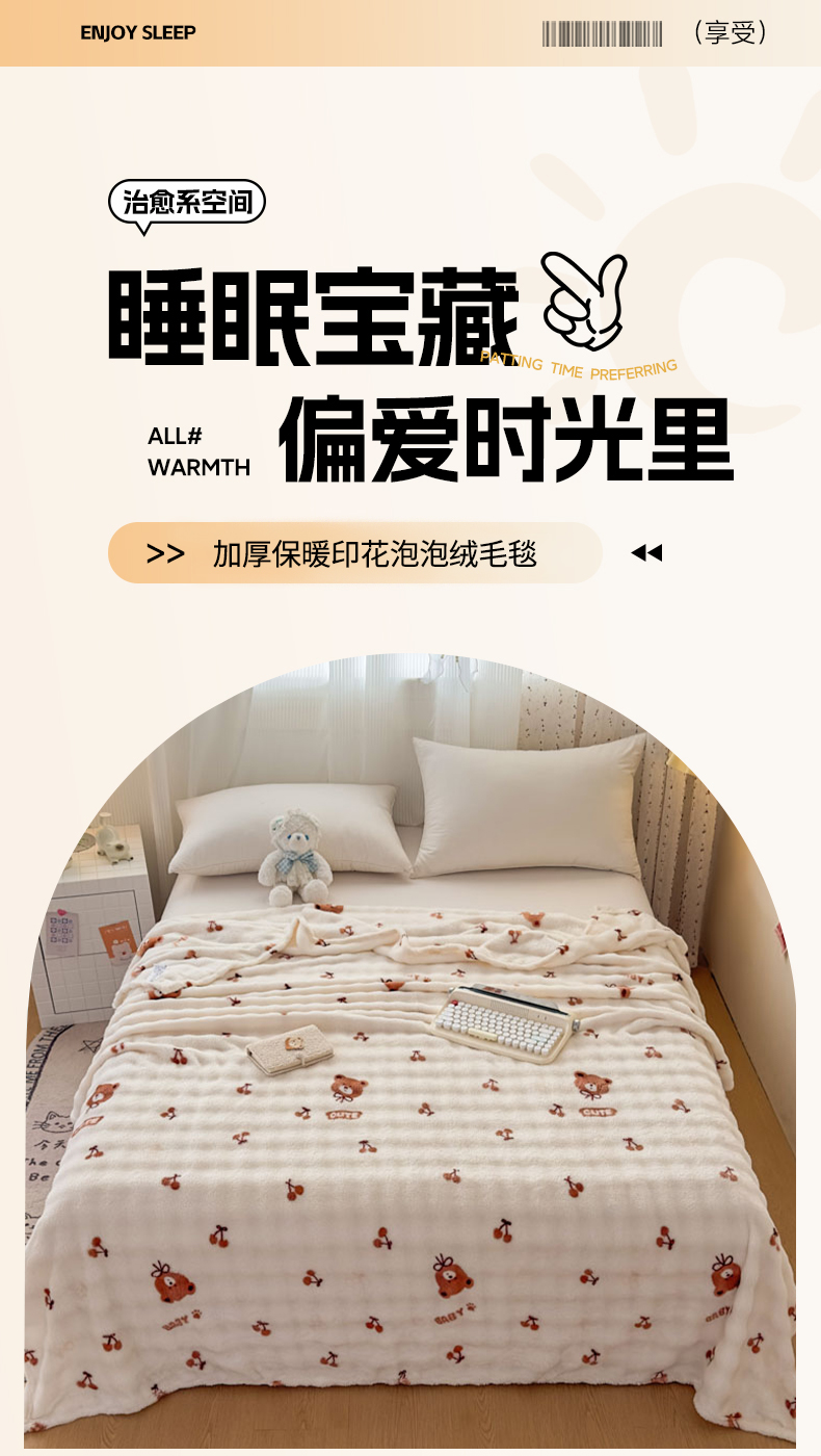 爱彼家纺 2025秋冬新款泡泡绒印花毛毯毯子多功能盖毯-系列二 樱桃小熊