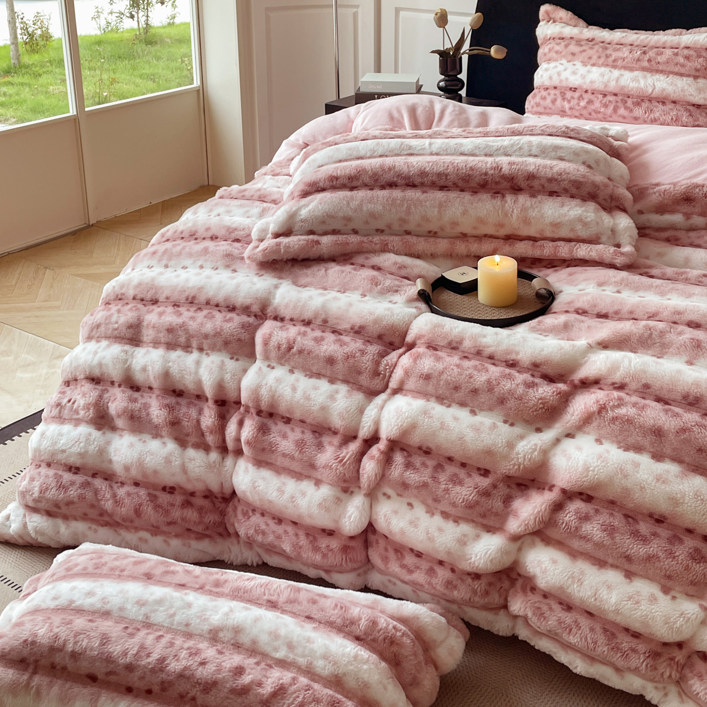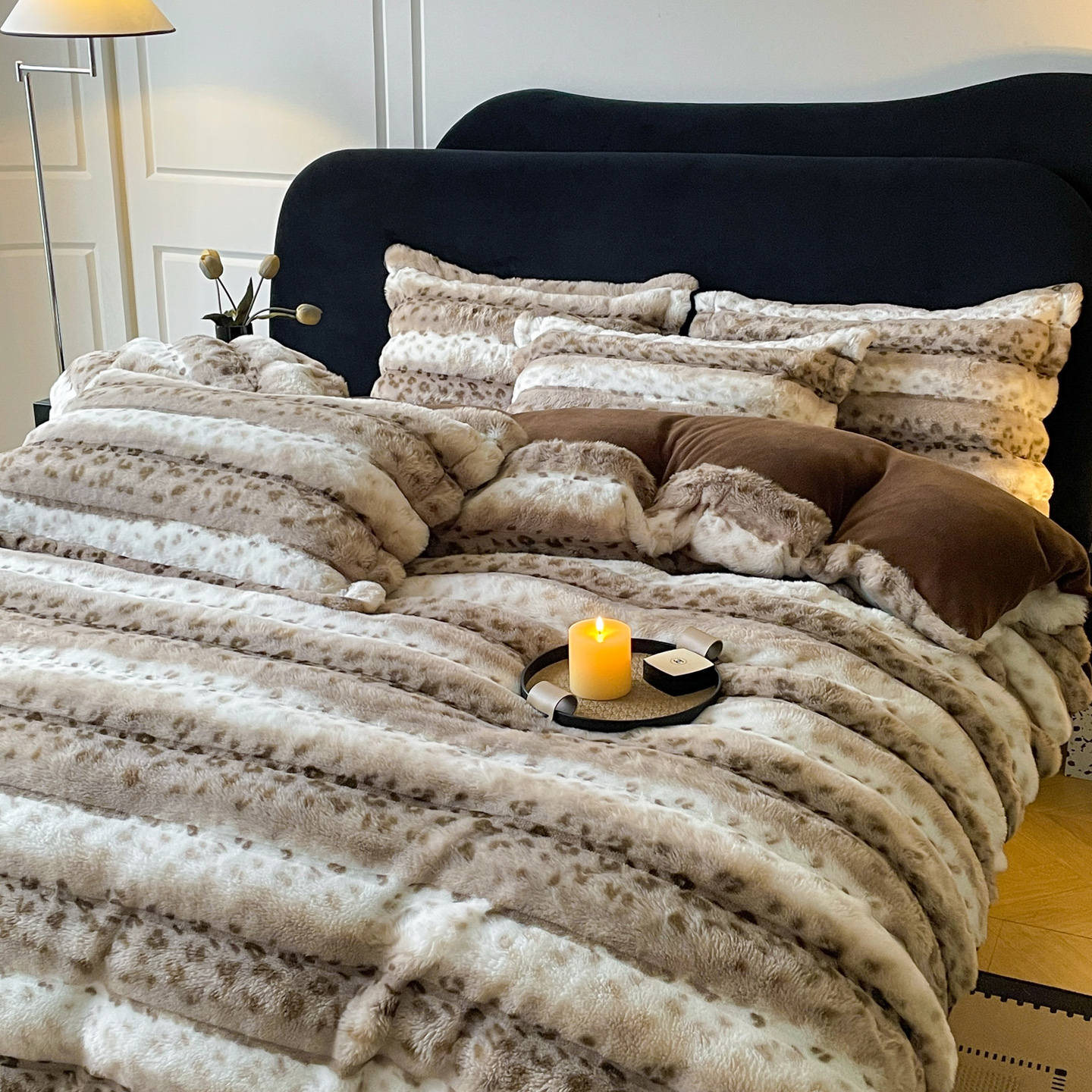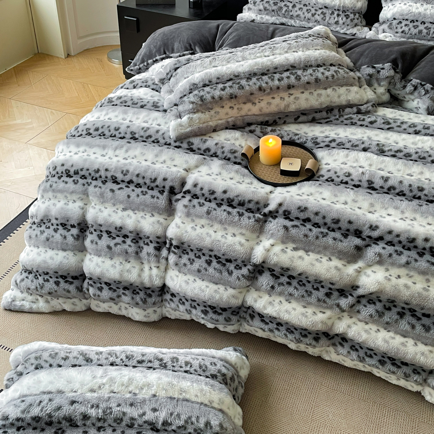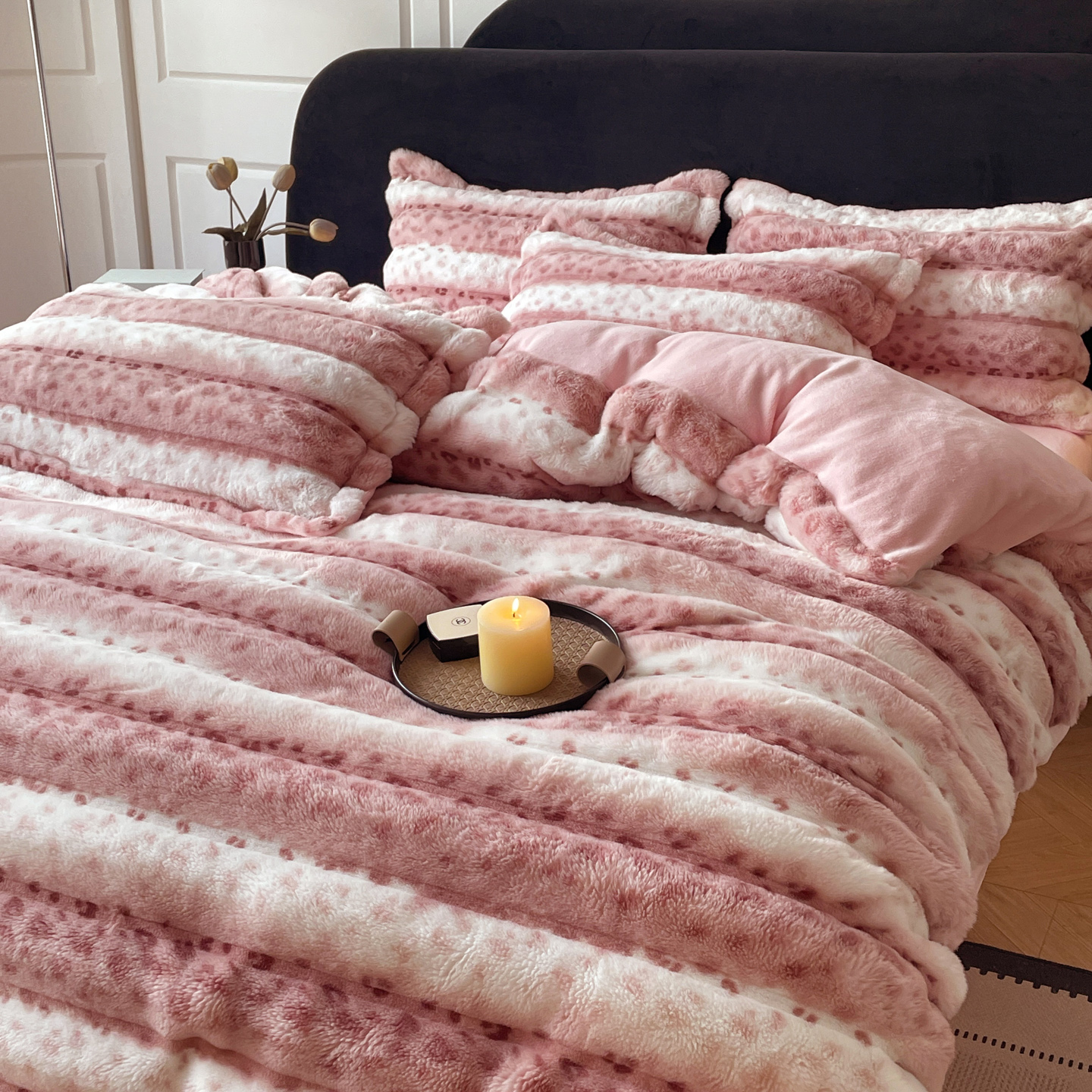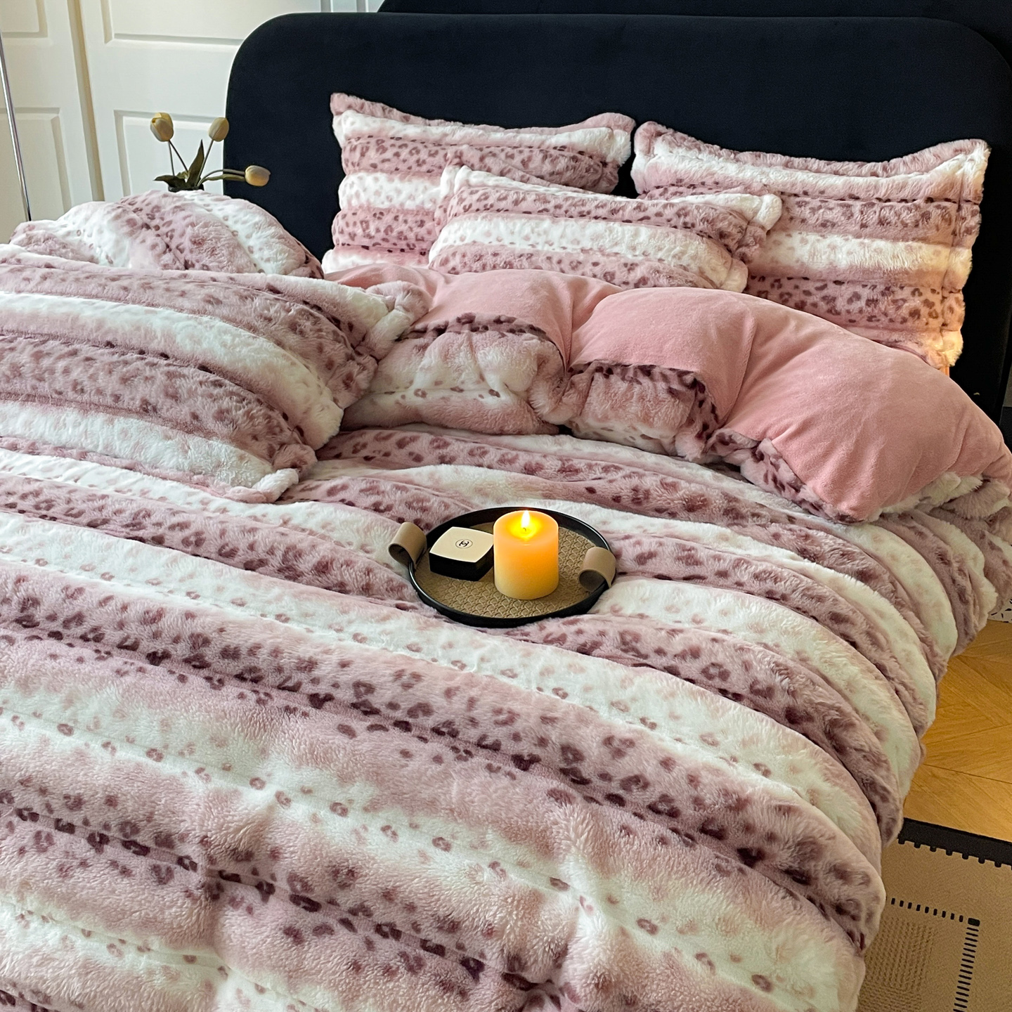商品名称:典曼家纺 2025新款加厚保暖兔绒四件套-豹纹系列 豹纹-粉条