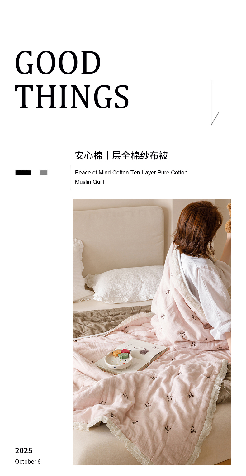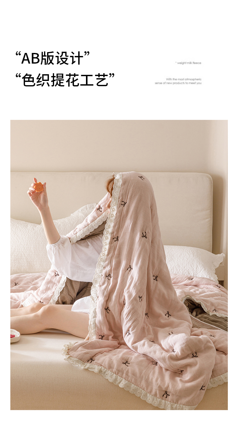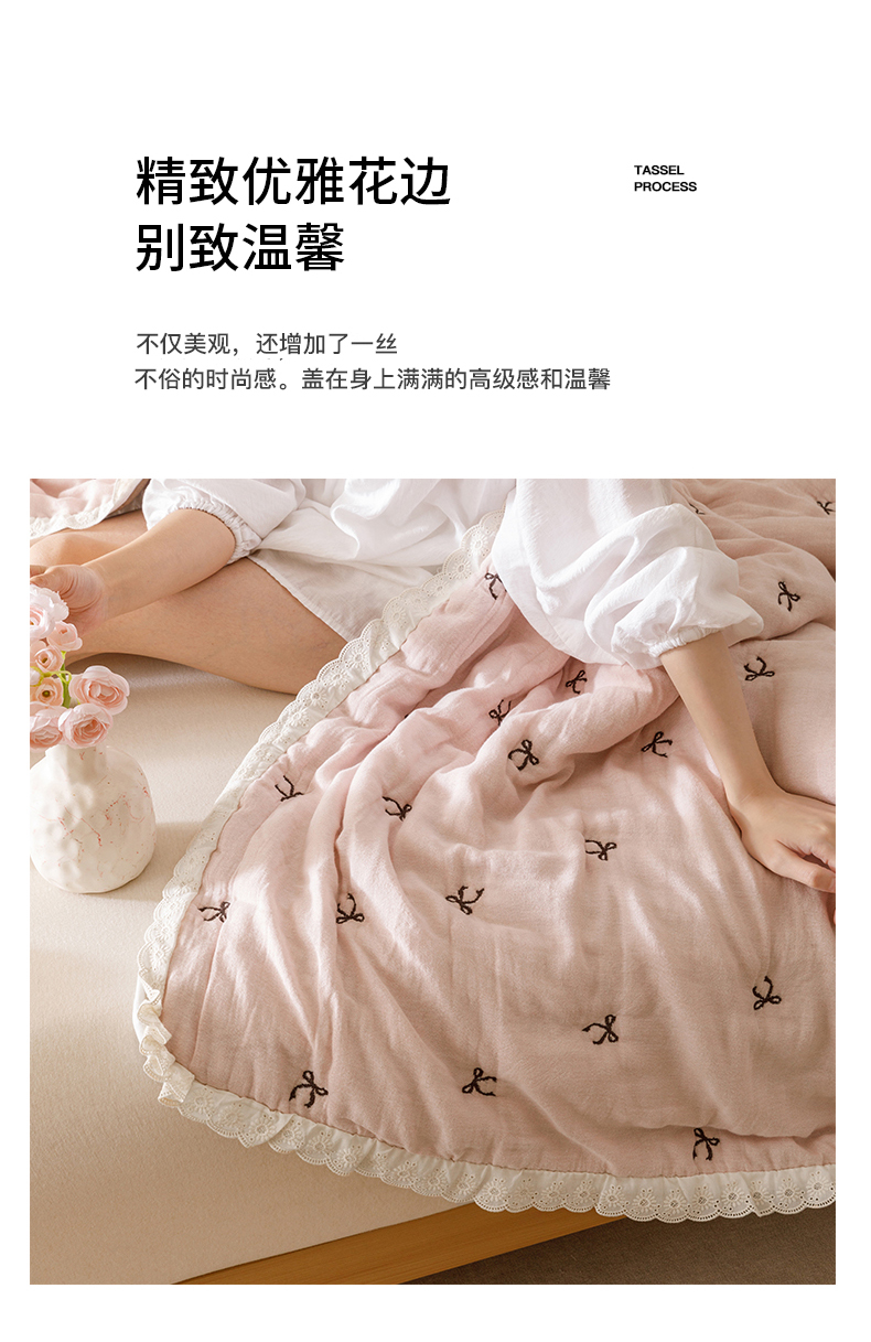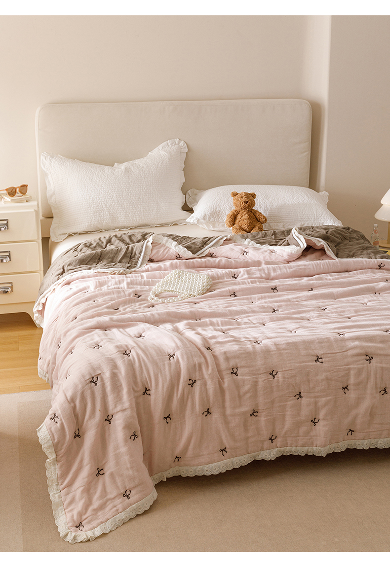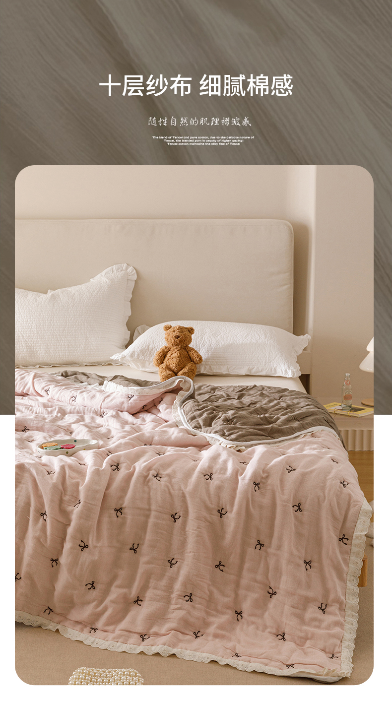 商品名称:麻依 2025新款安心棉十层纱布泡芙被全棉纱布被子被芯 点点蝴蝶结-粉