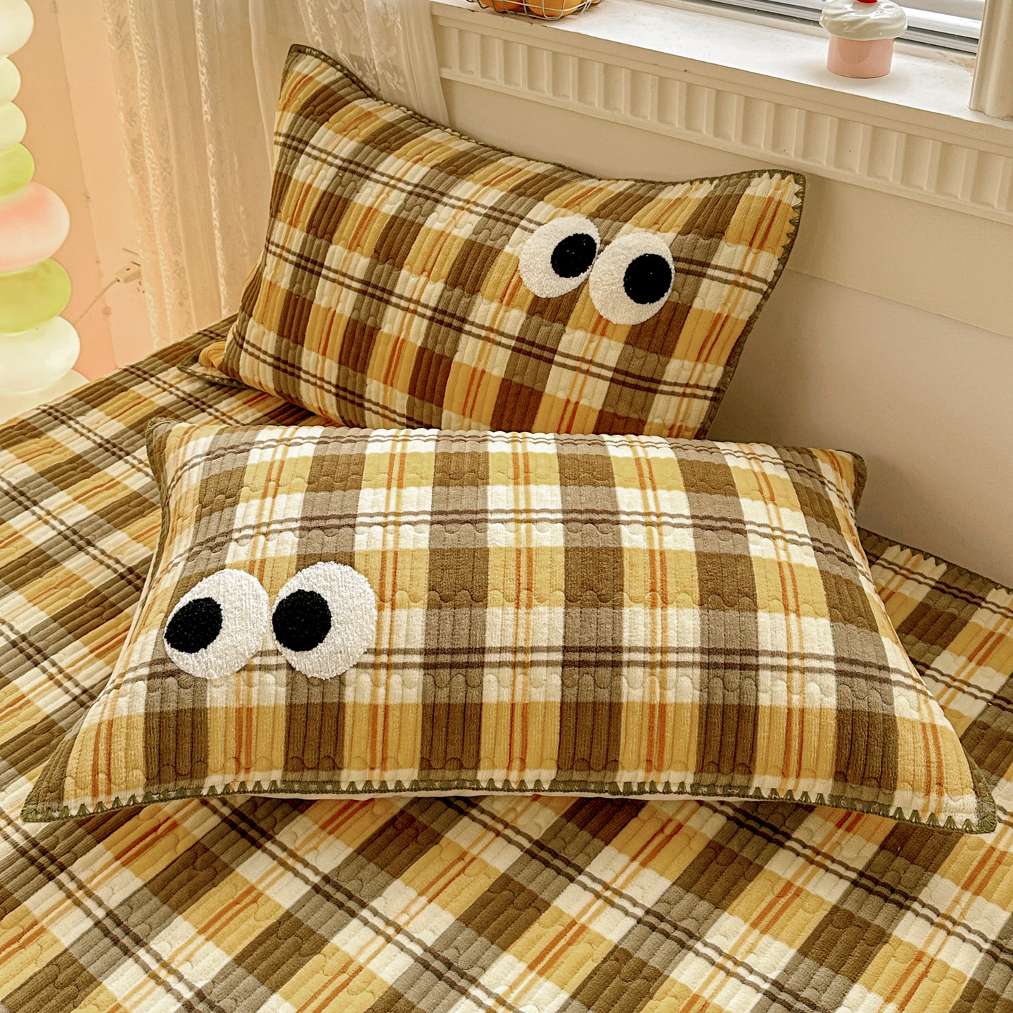 (总)格真 2025新款无印风贝壳绣三角针牛奶绒床盖三件套大眼萌枕套,休闲时光,拉菲-黄,米黄小格,粉小格,凯瑟琳红格,蓝小格,维系驼格,黑白小格