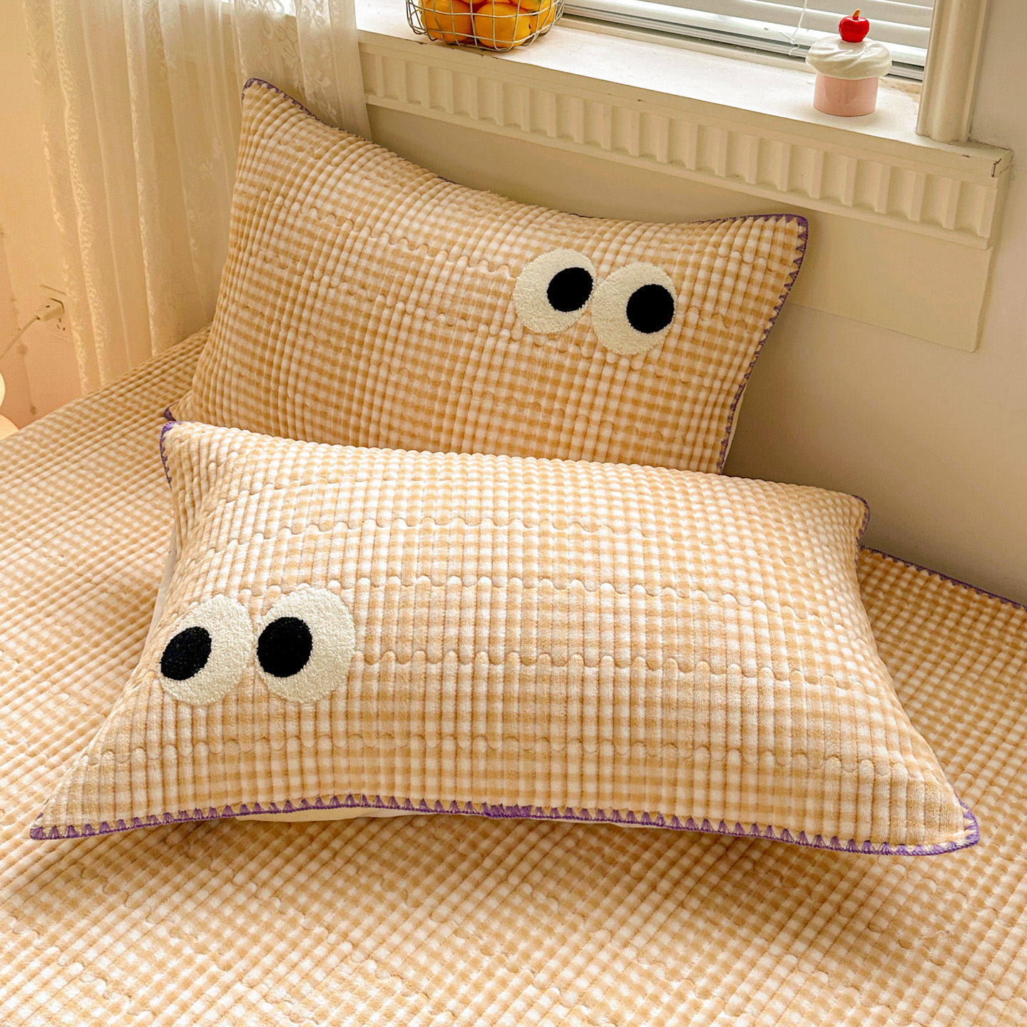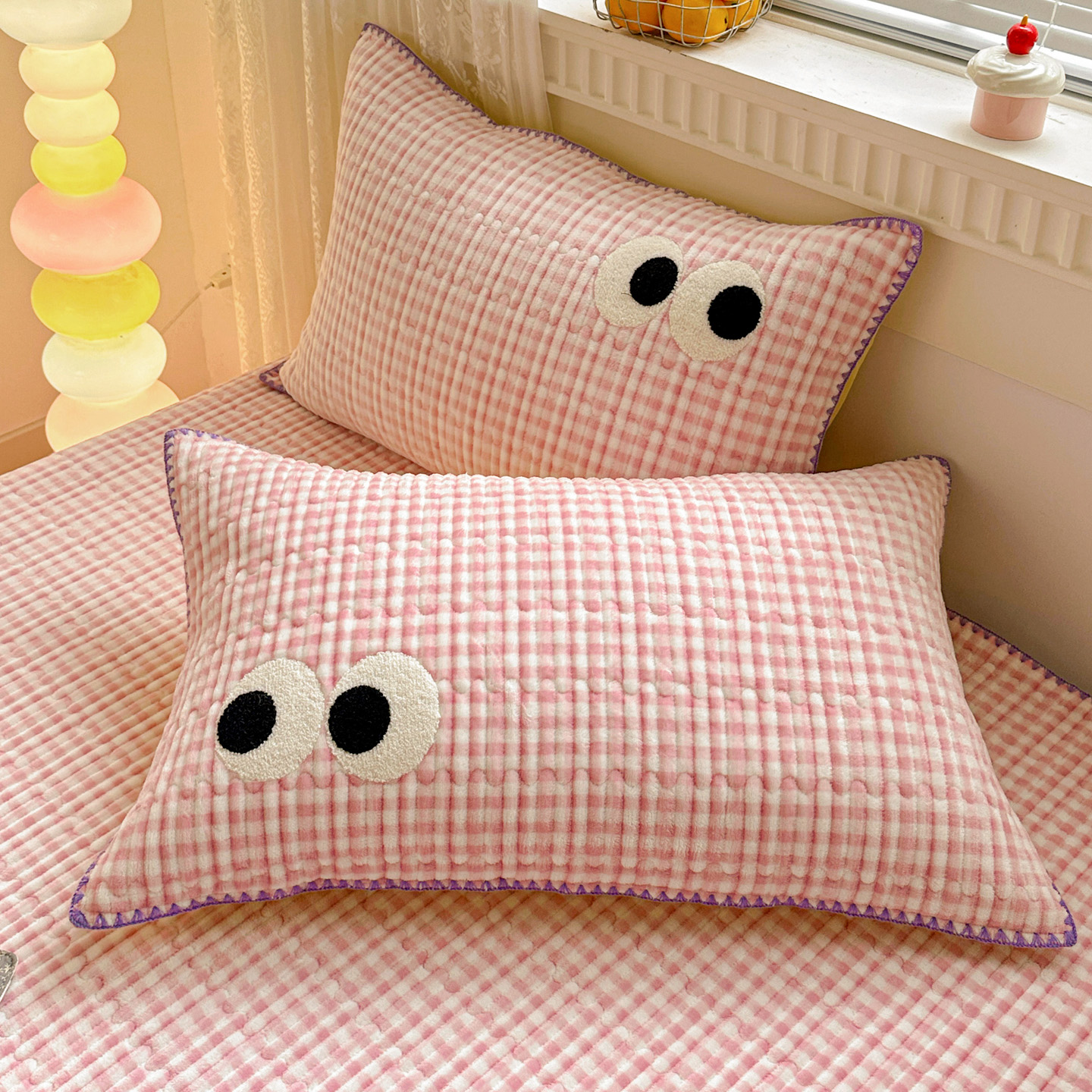 格真 2025新款无印风贝壳绣三角针牛奶绒床盖三件套大眼萌枕套 凯瑟琳红格