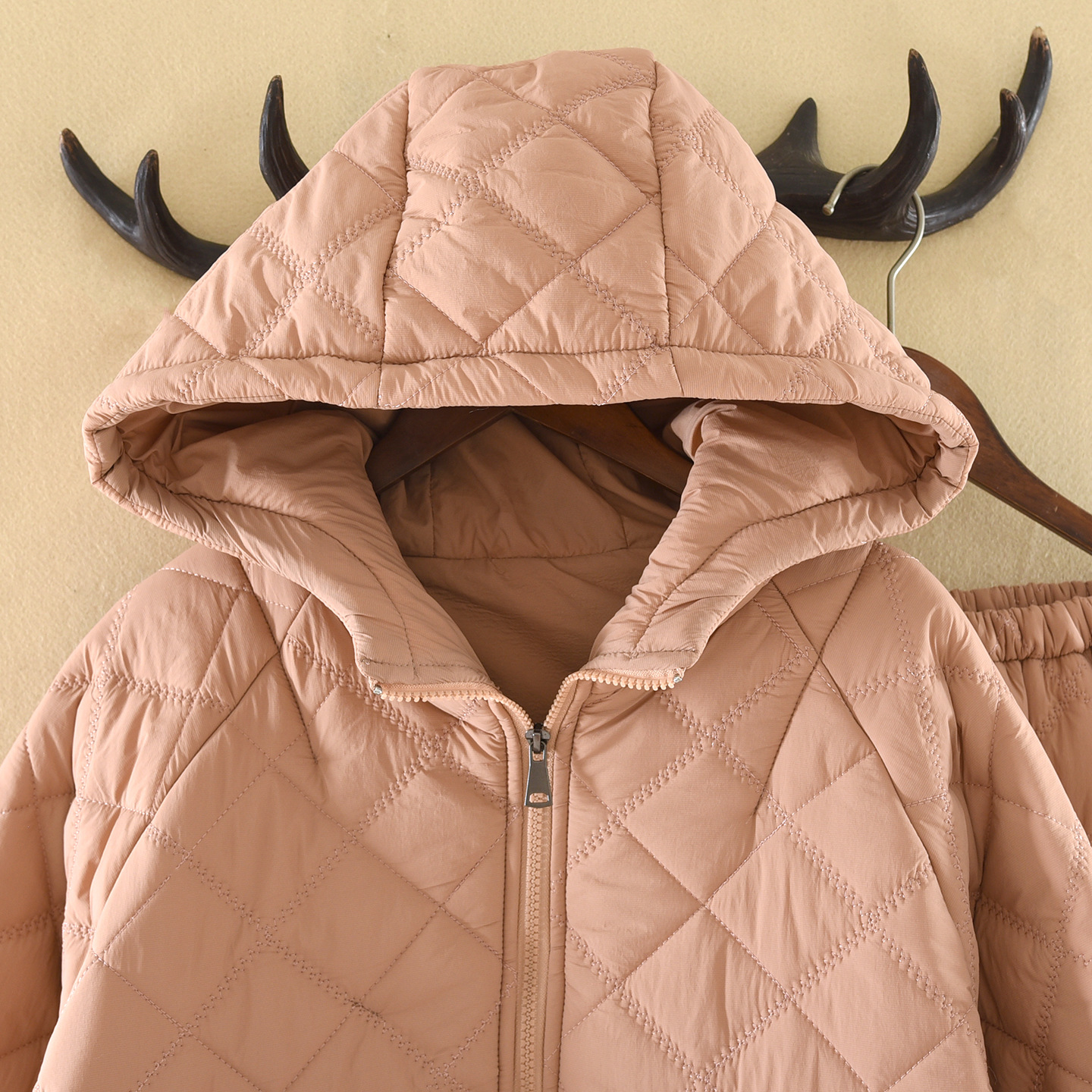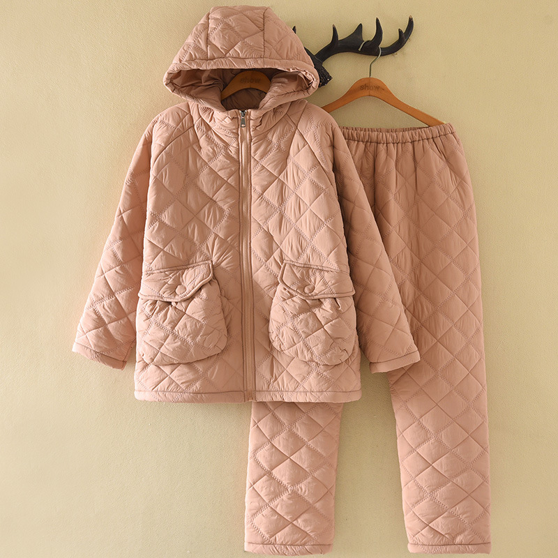 商品名称:洛兰沙家居馆 2025新款【防风防水】新款轻盈保暖情侣夹棉睡衣男冬季三层加厚女连帽家居服套装可 粉色