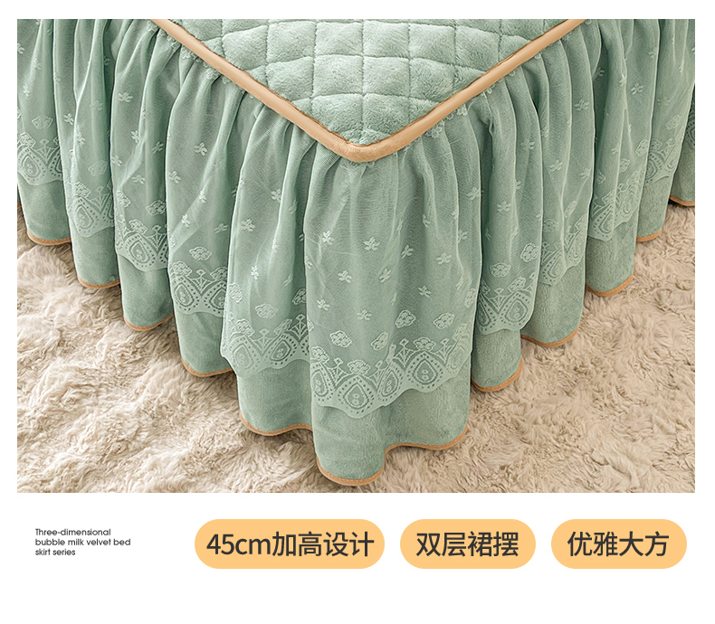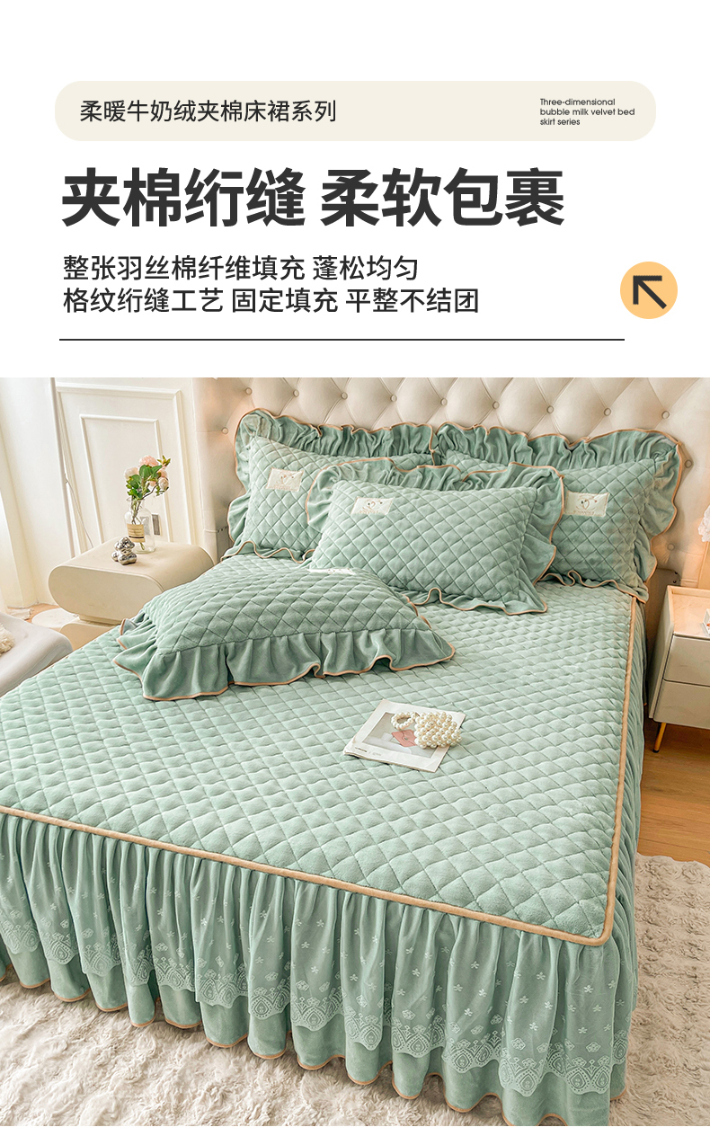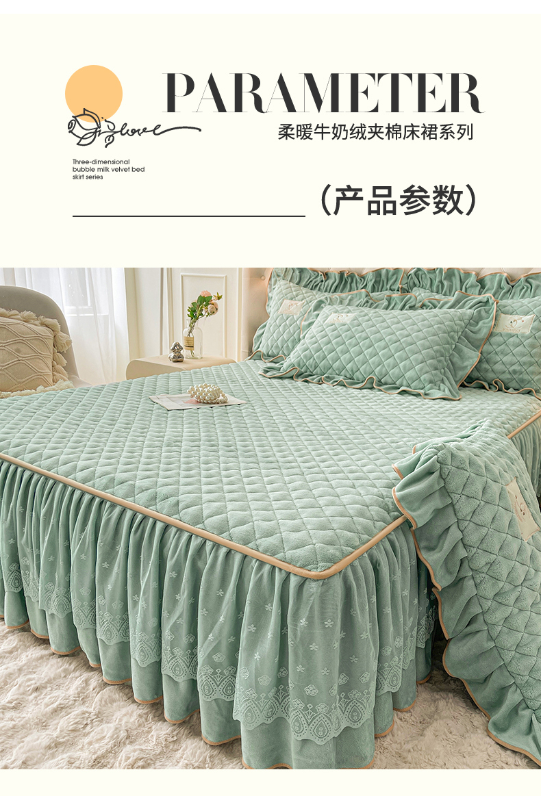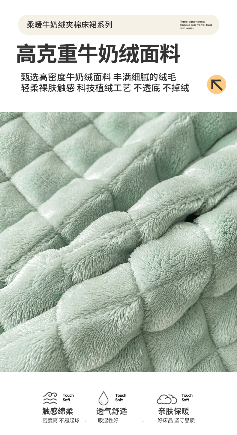 商品名称:情恒家纺 2025新款立体泡泡牛奶绒夹棉床裙三件套系列-浅语光年 浅语光年-水绿