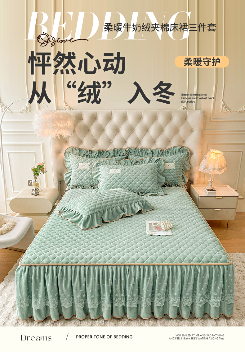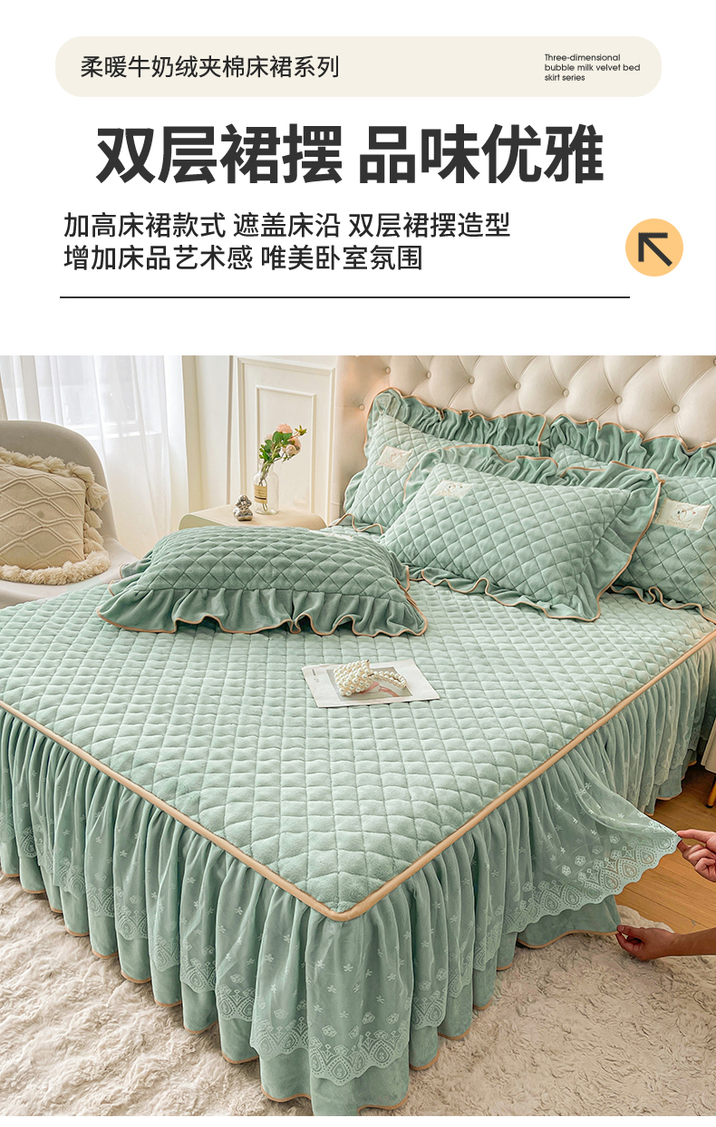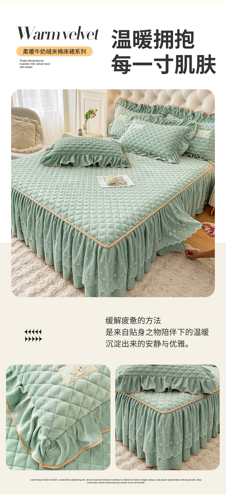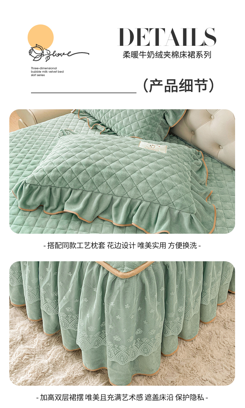 情恒家纺 2025新款立体泡泡牛奶绒夹棉床裙三件套系列-浅语光年 浅语光年-水绿