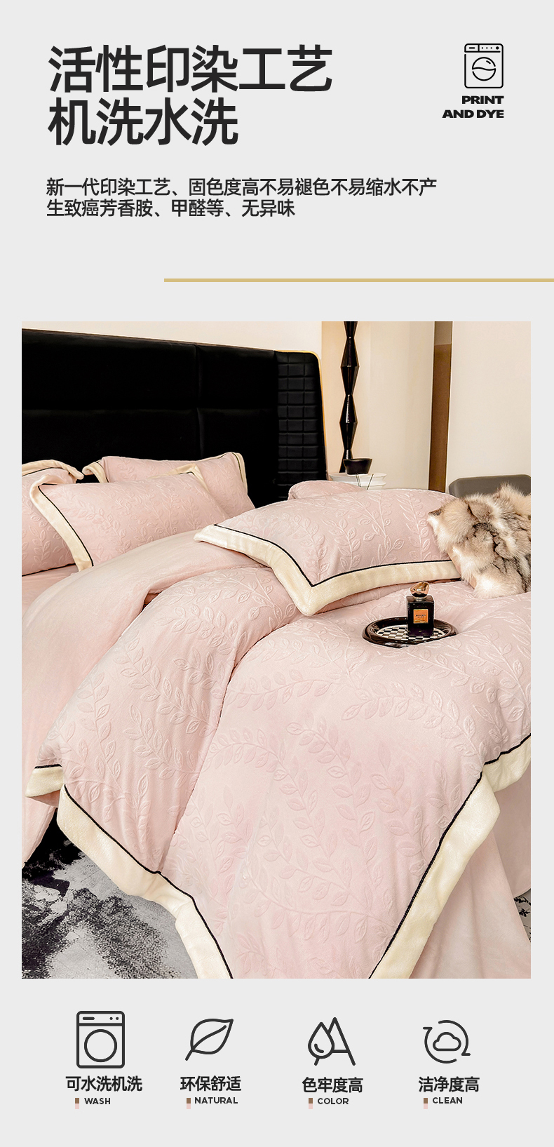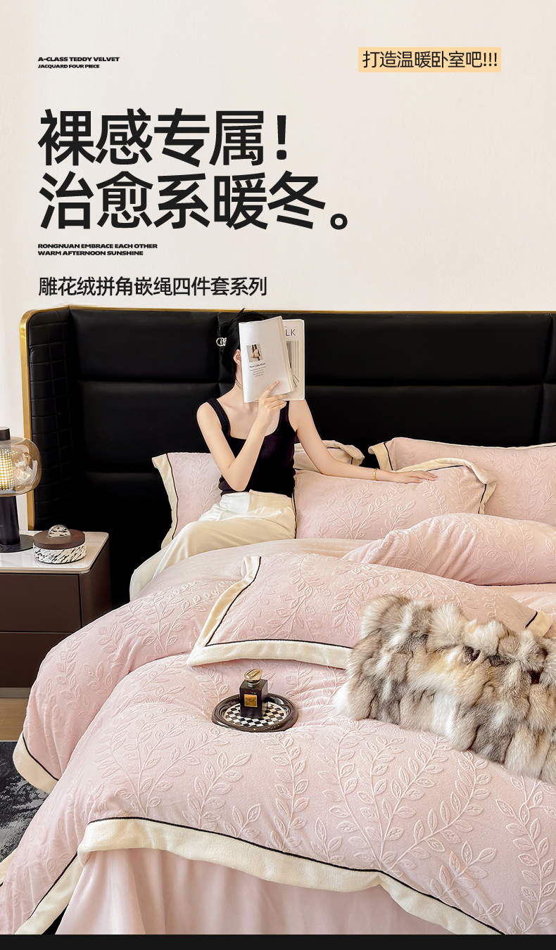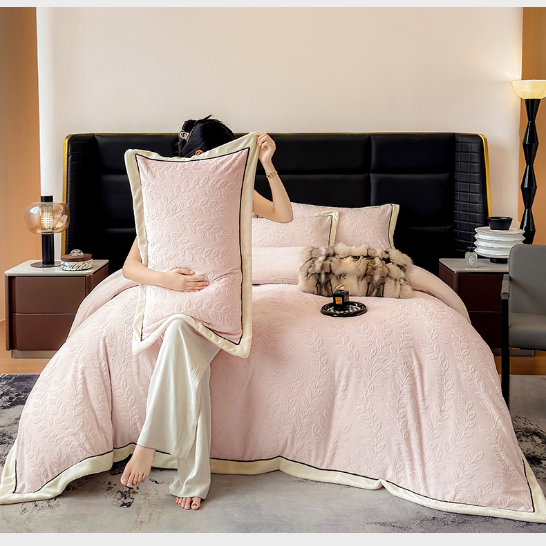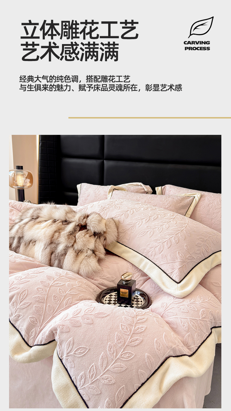 商品名称:大米家居 2025新款雕花绒拼角嵌绳系列四件套 花枝-桃粉