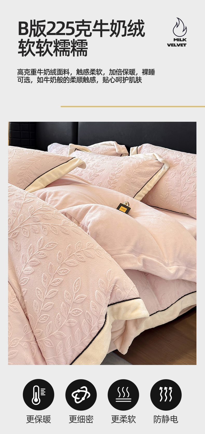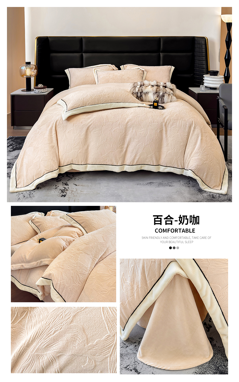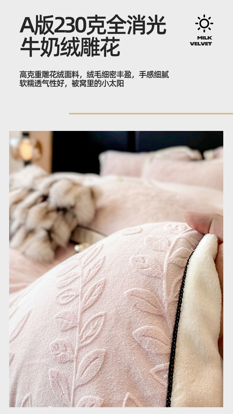 (总)大米家居 2025新款蝴蝶结丝带230克全消光牛奶绒雕花绒四件套-山茶花影系列,山茶花影-奶杏粉,山茶花影-珊瑚粉,山茶花影-月绒白
