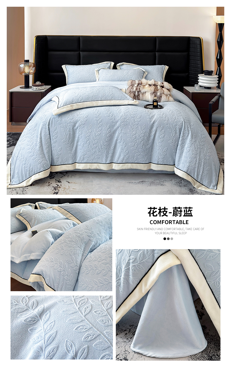 (总)大米家居 2025新款高克重简约雕花绒四件套寒梅系列,寒梅-果绿,寒梅-海蓝,寒梅-卡其,寒梅-玫粉