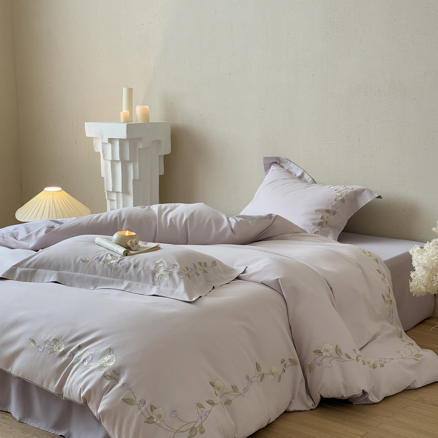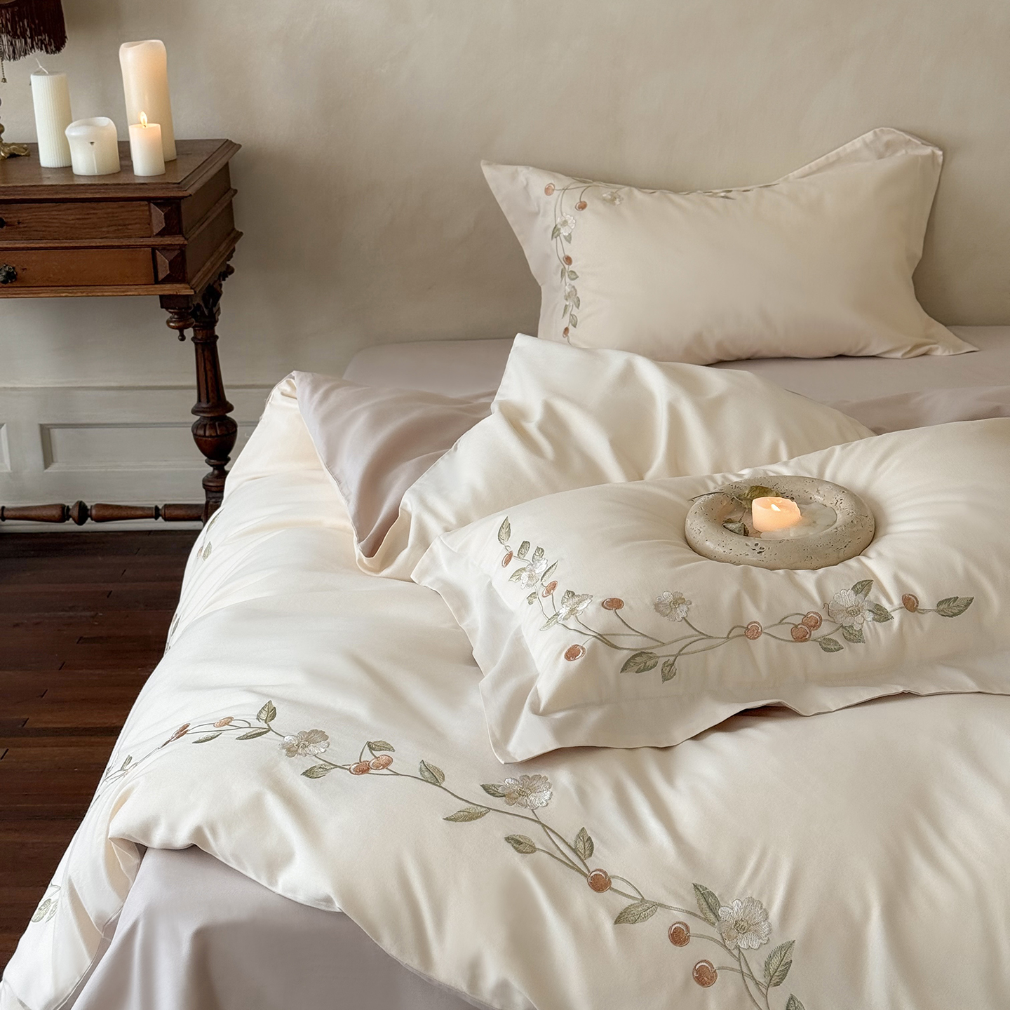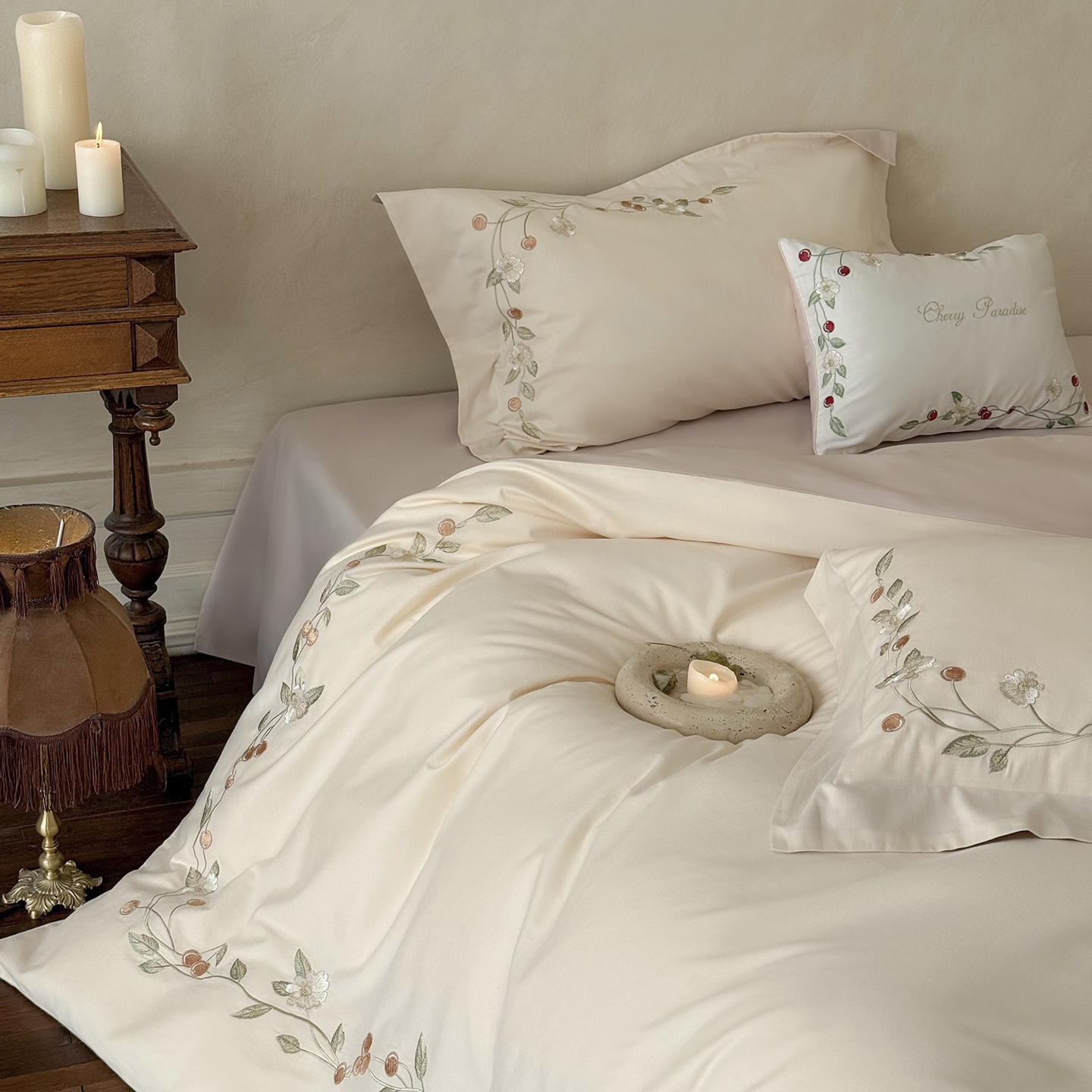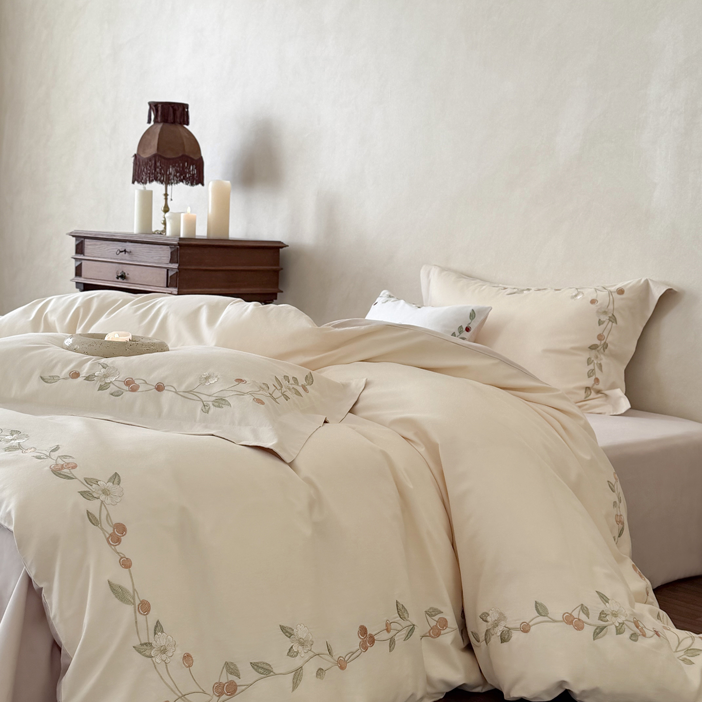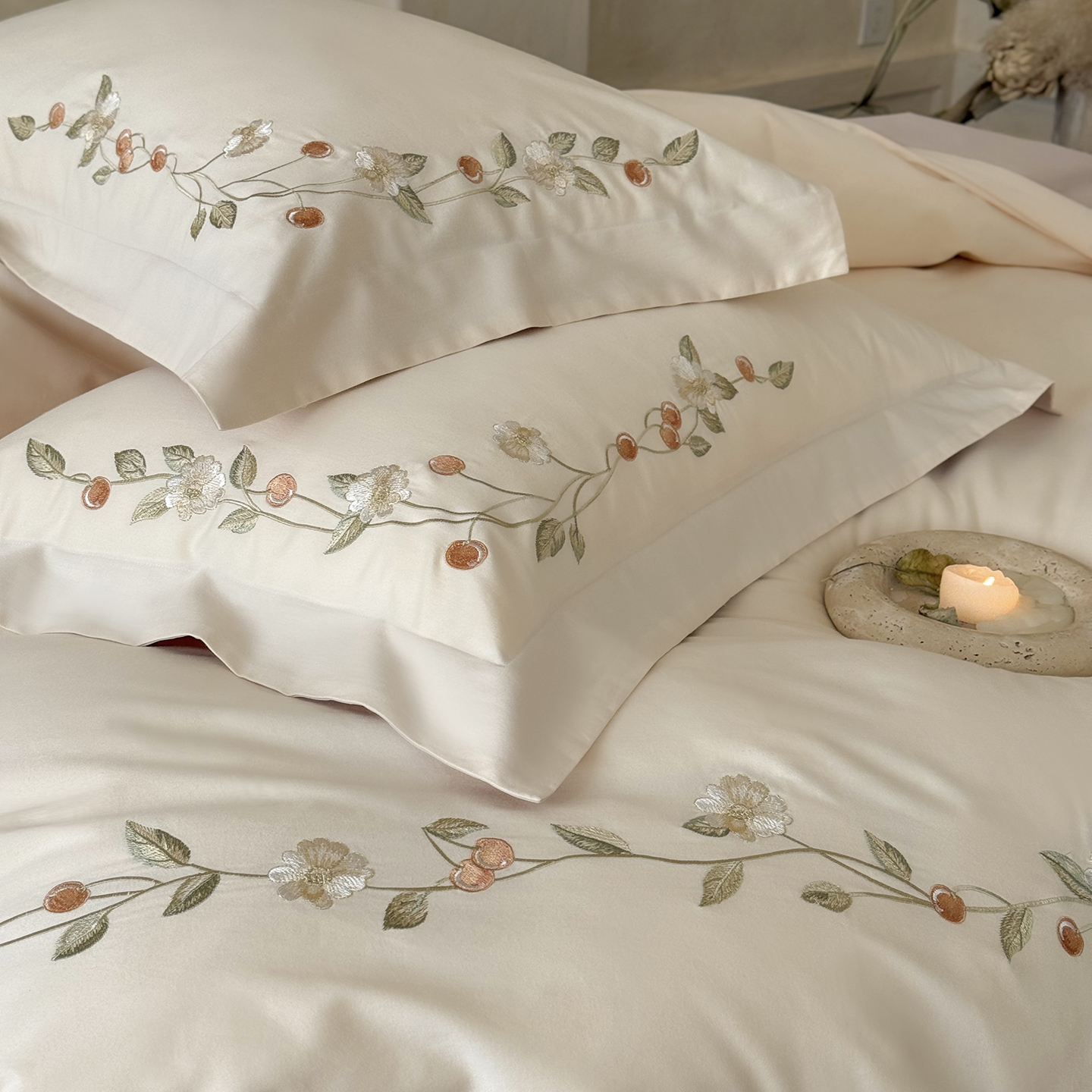 (总)佳汐蓝 2025春夏新品双层皱皱纱刺绣+织带+荷叶边四件套--白茶花,奶白,曲奇