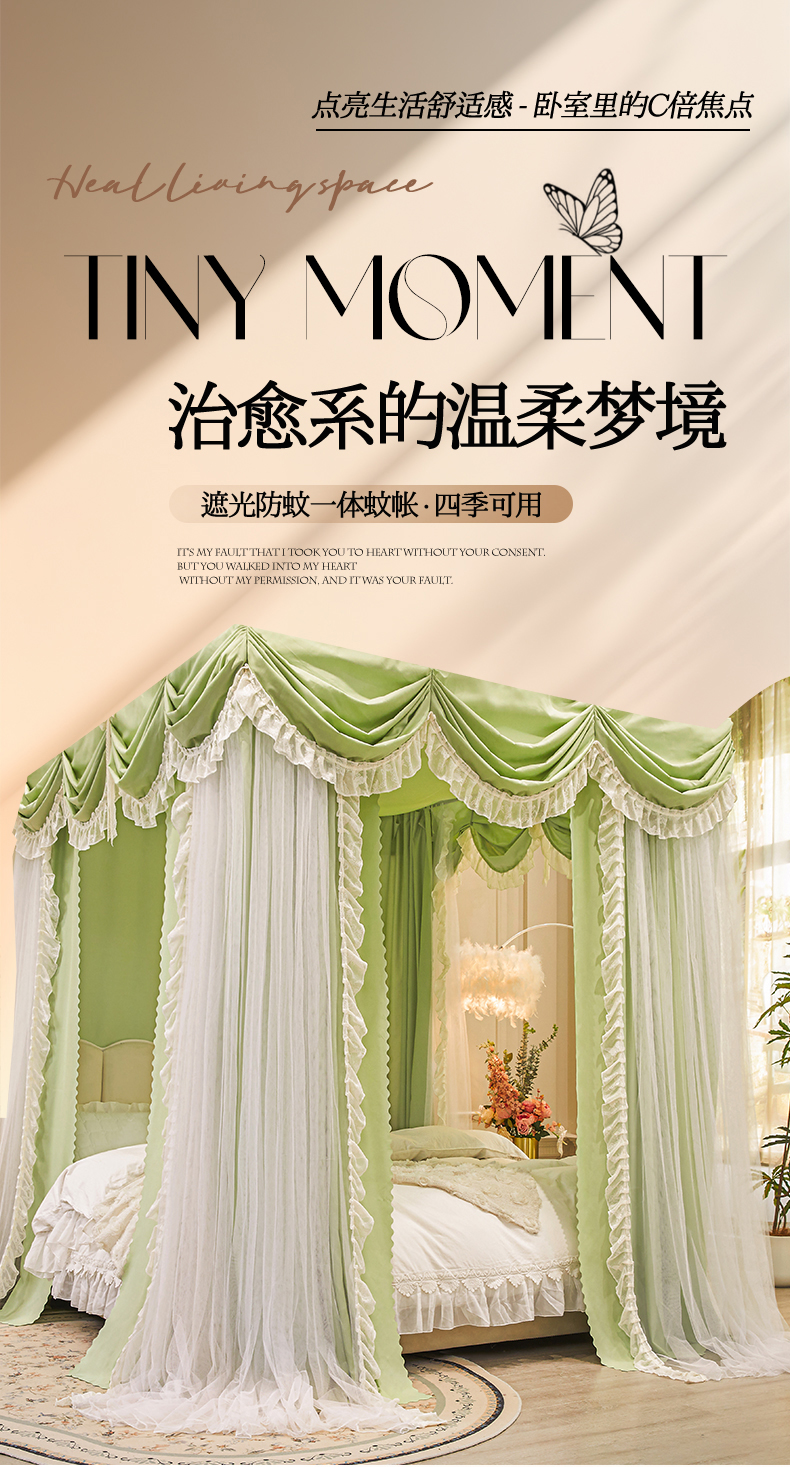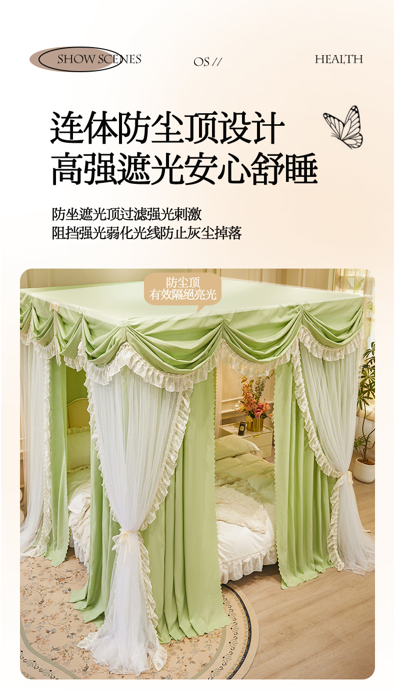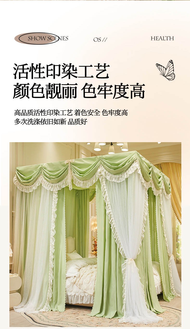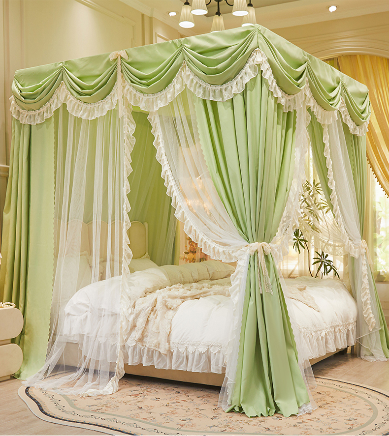 艾晶美家纺有限公司 2026新款法式公主风 双杆双层落地床幔遮光蚊帐 蝶影栖纱-荷绿