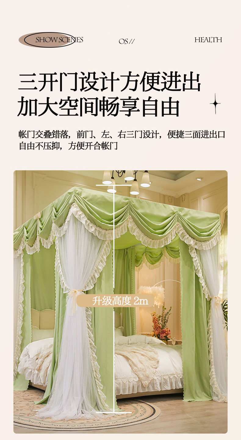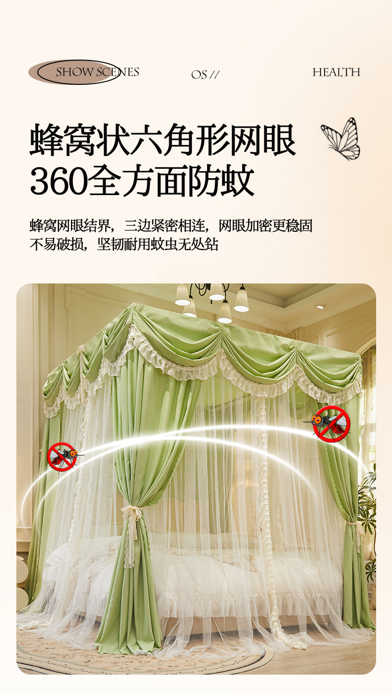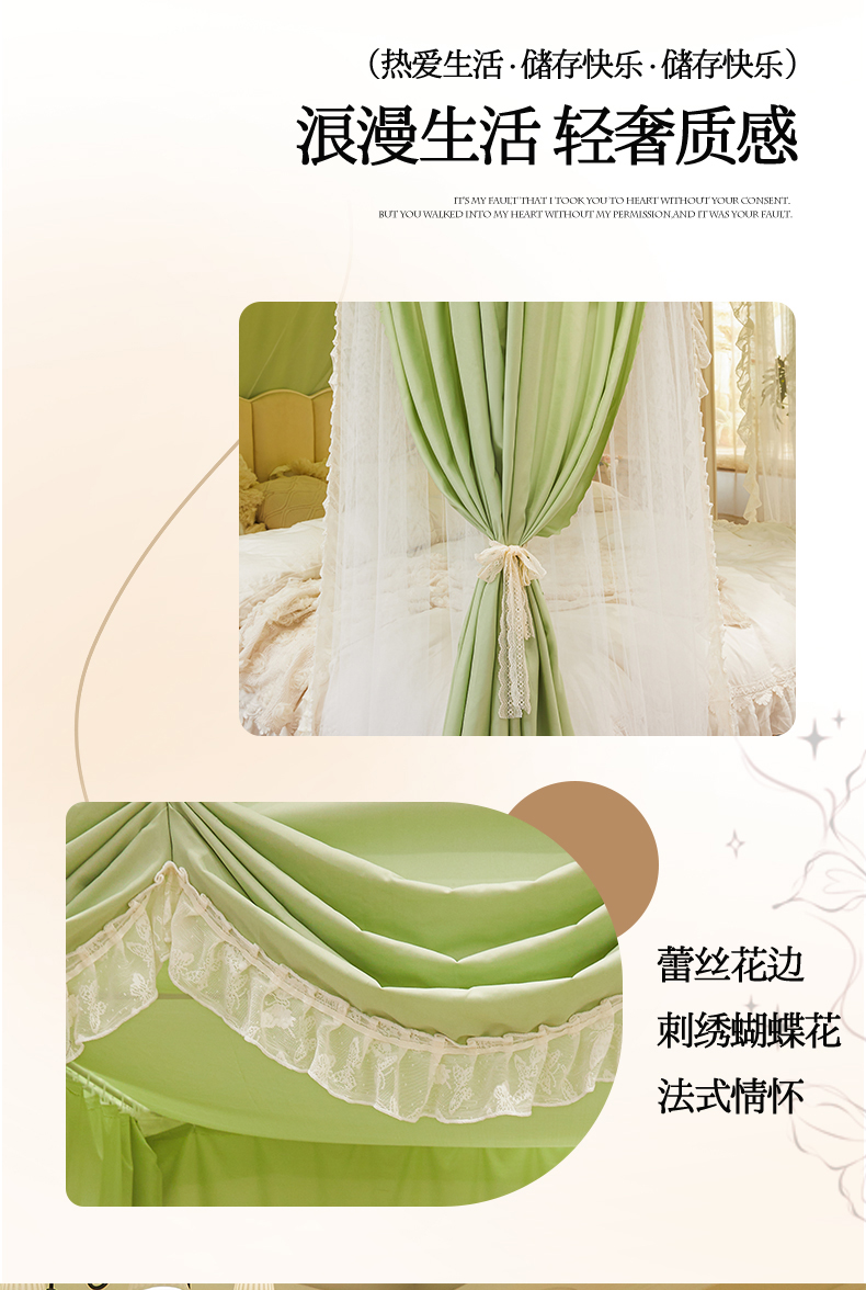 艾晶美家纺有限公司 2026新款法式公主风 双杆双层落地床幔遮光蚊帐 蝶影栖纱-荷绿
