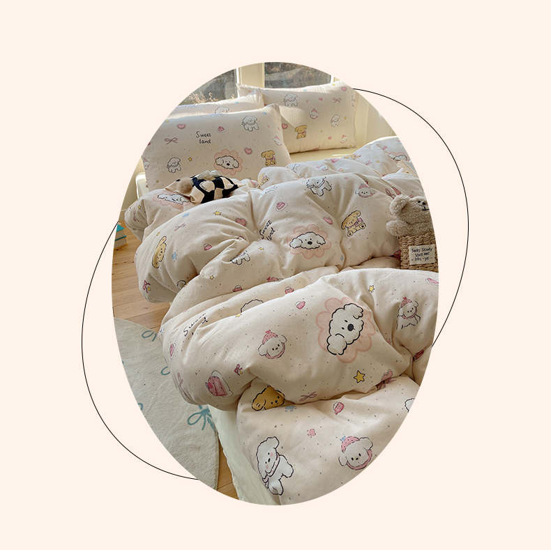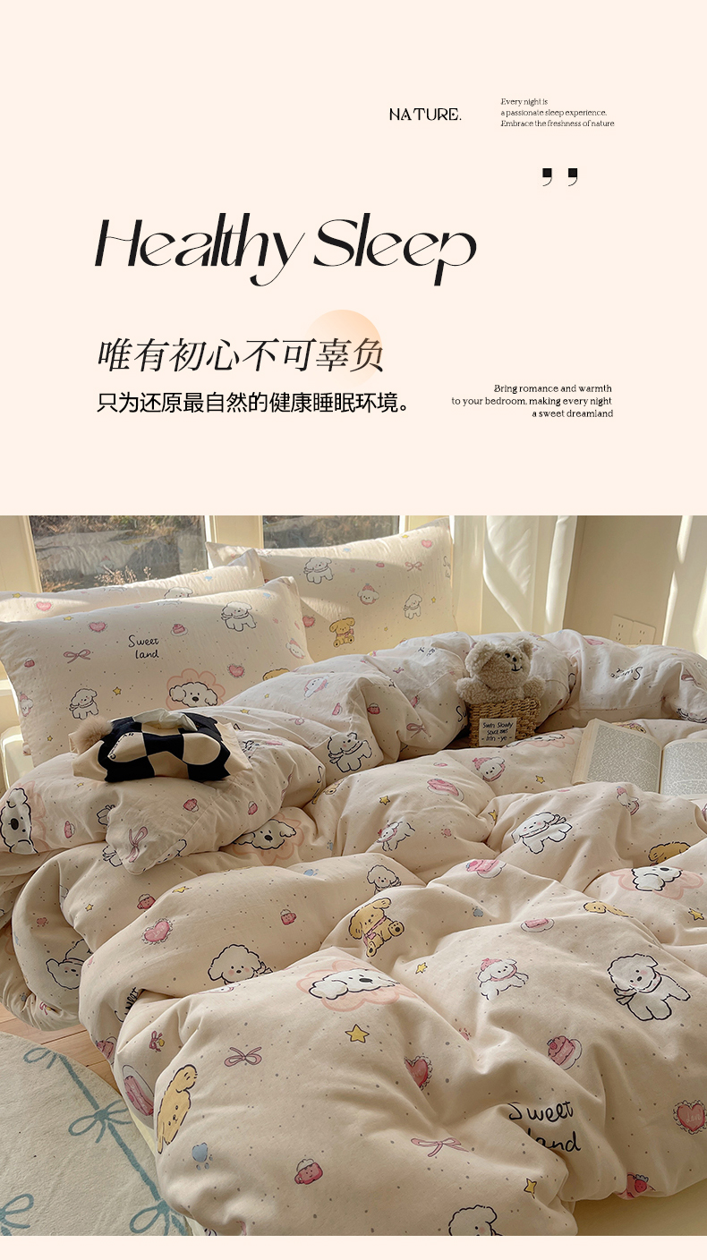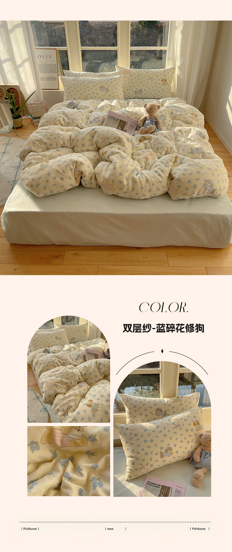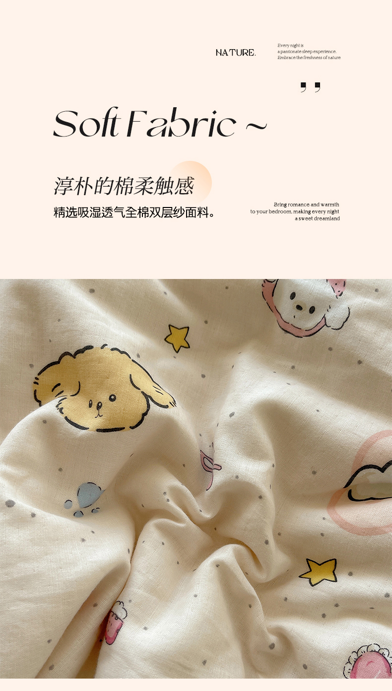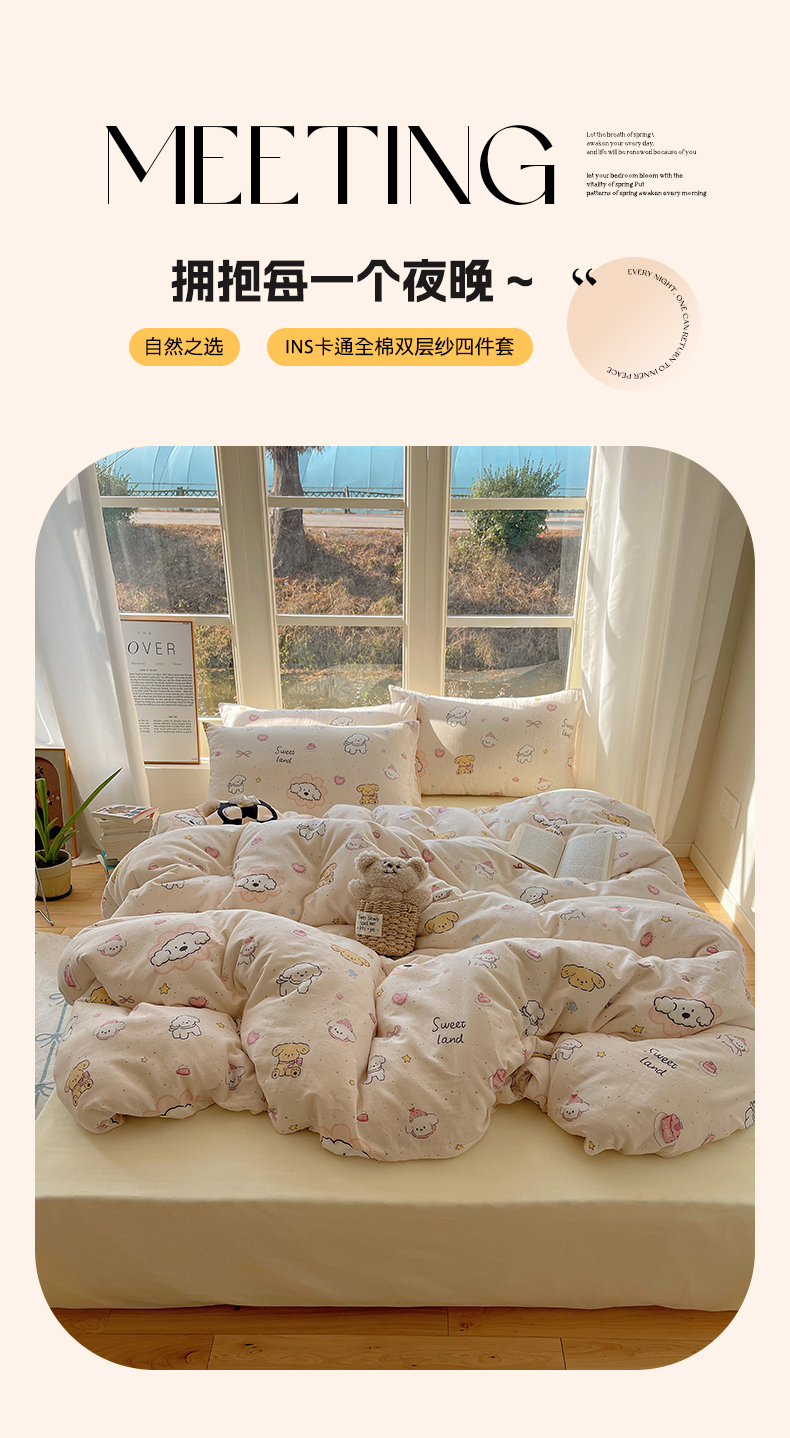 当前位置: 91家纺网 > 商品网购 > 床品套件 > 四件套 > 全棉普通四件套 > 六巷胡同 2026春夏新款INS卡通A类全棉纯棉双层纱四件套 双层纱-星愿狗狗