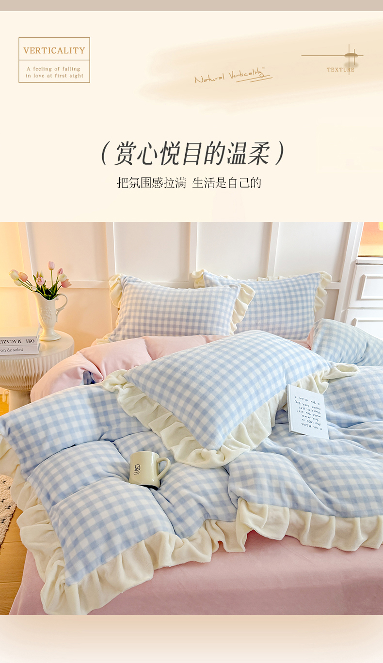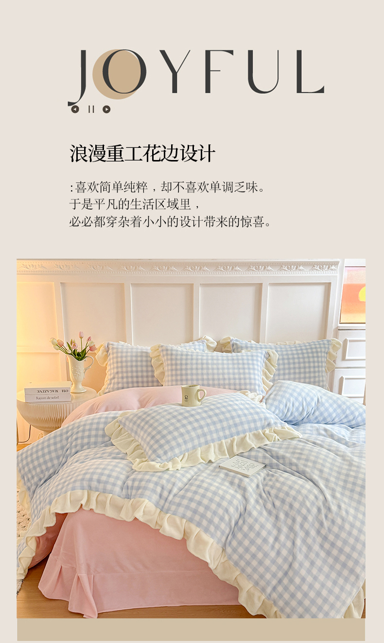 商品名称:温眠家纺 2025新款200g全工艺牛奶绒花边款四件套吊边床单 天蓝格