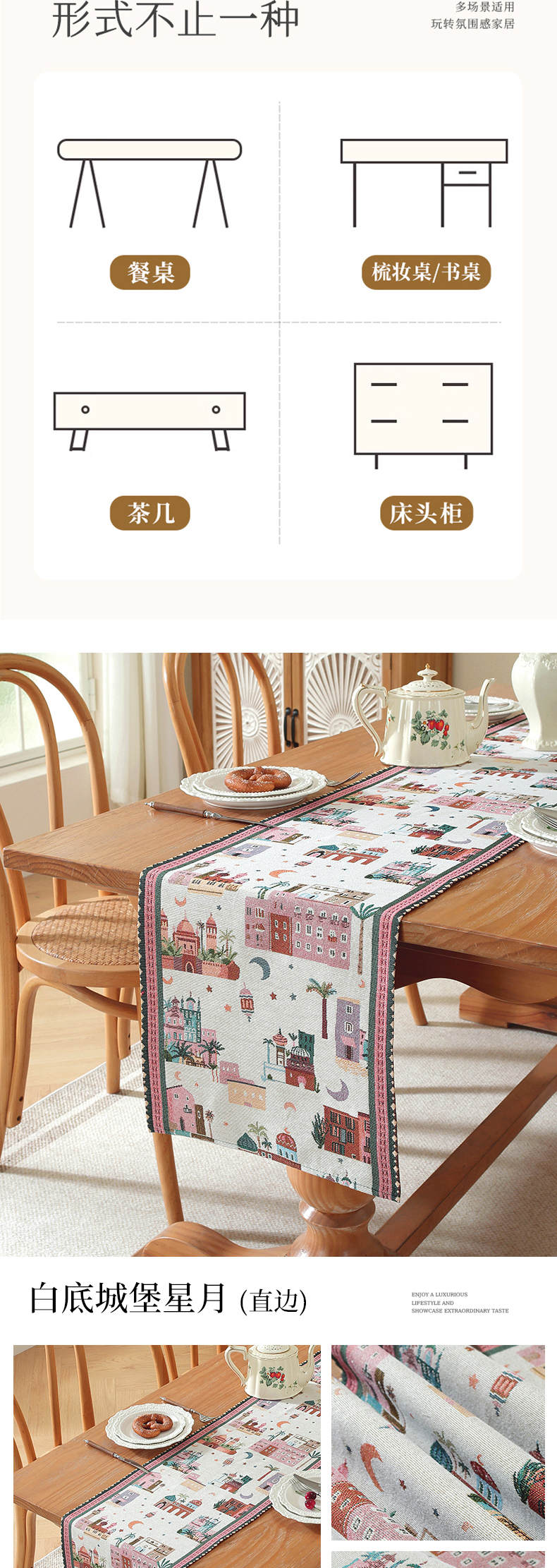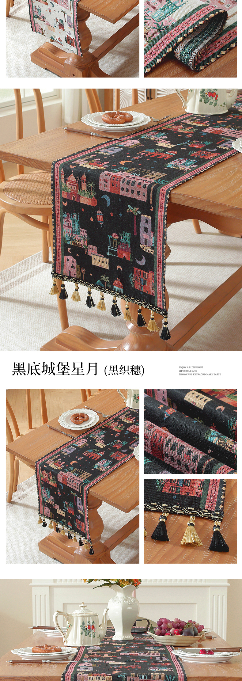 当前位置: 91家纺网 > 商品网购 > 居家布艺 > 餐桌布 > 南通大梧纺织 2026新款中东复古骆驼城堡窗花桌旗 黑底城堡星月(直边)