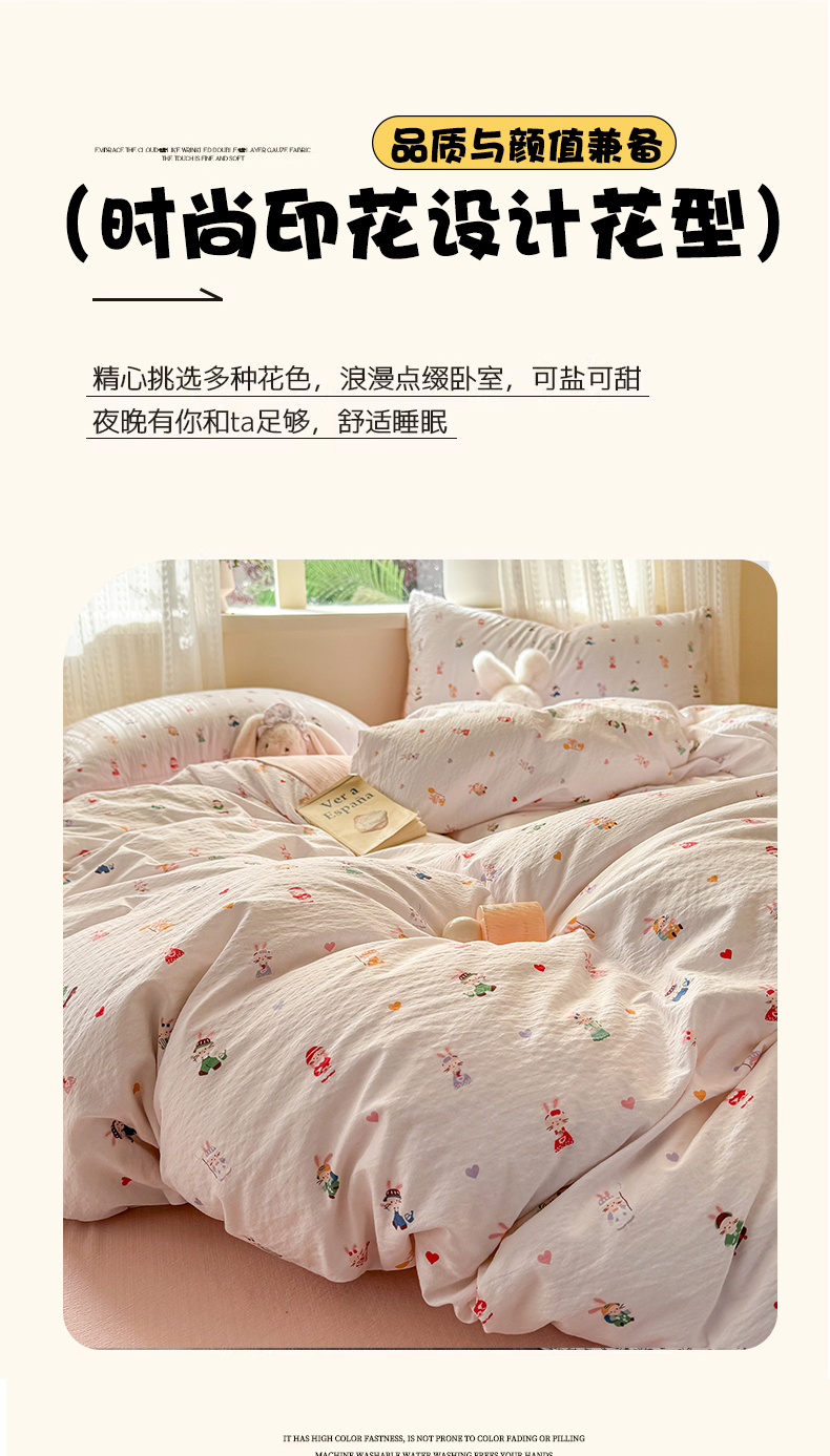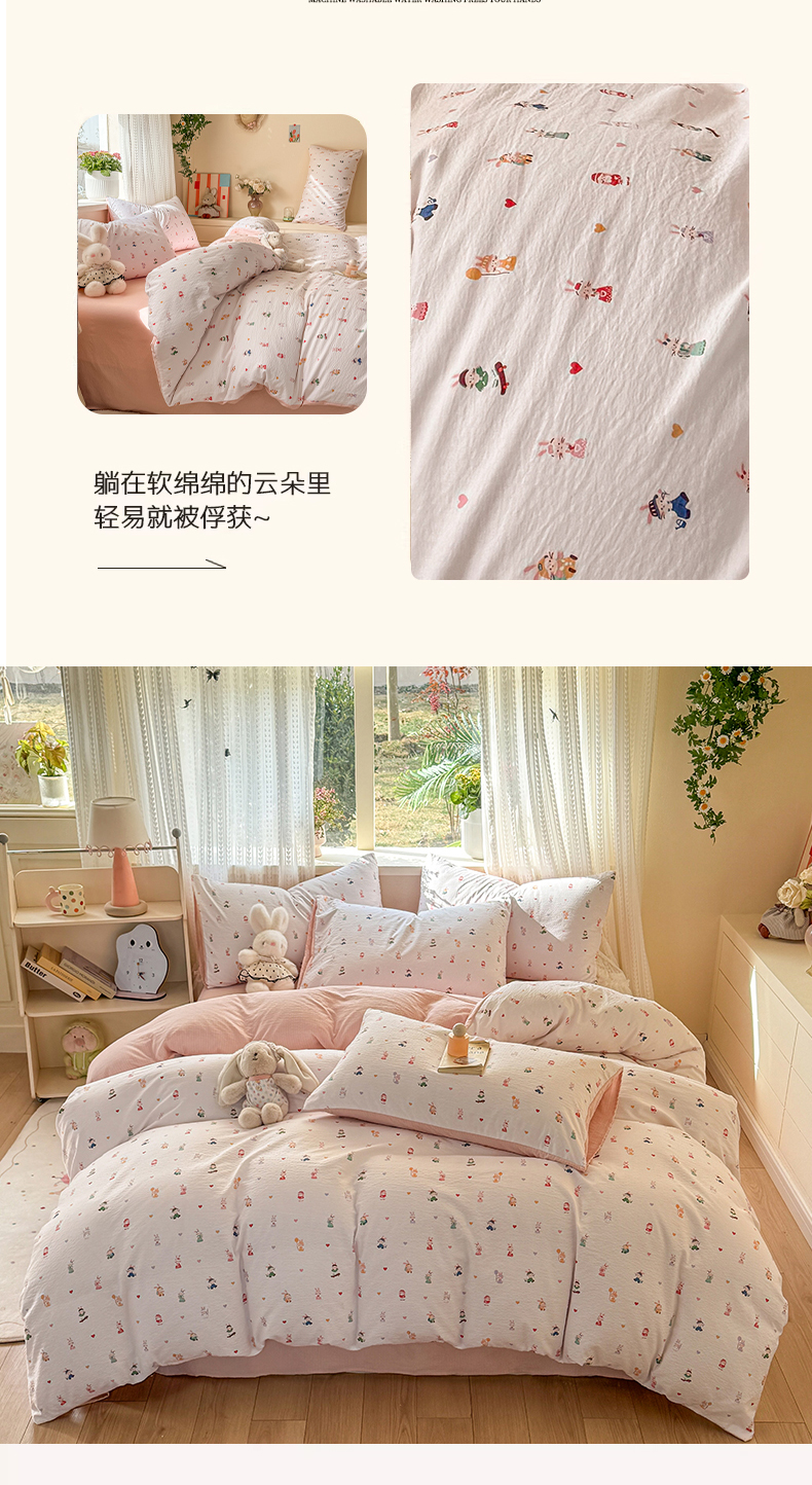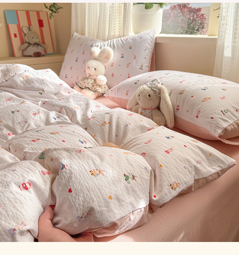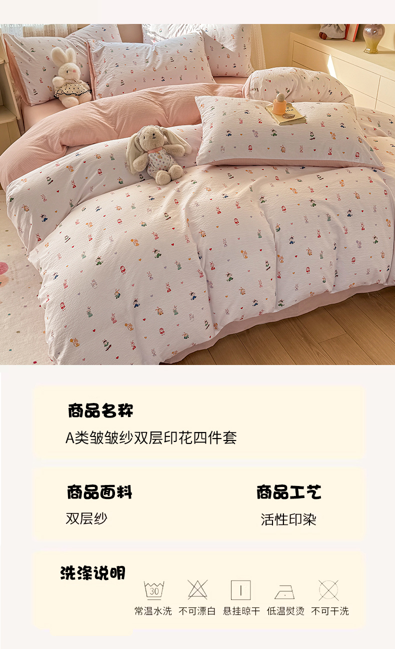 当前位置: 91家纺网 > 商品网购 > 床品套件 > 四件套 > 双层纱四件套 > 丽美人家纺 2026新款A类皱皱纱双层印花四件套 桃心萌兔集