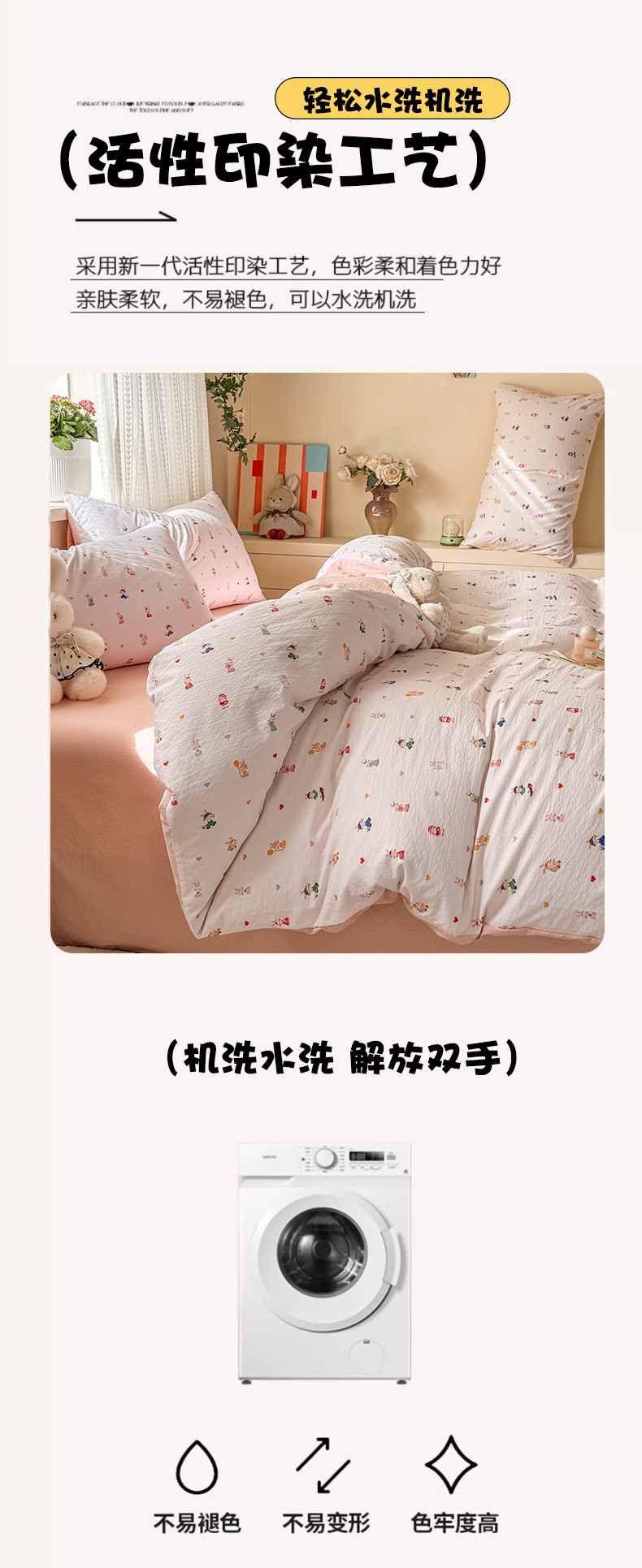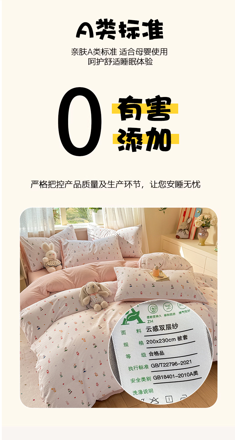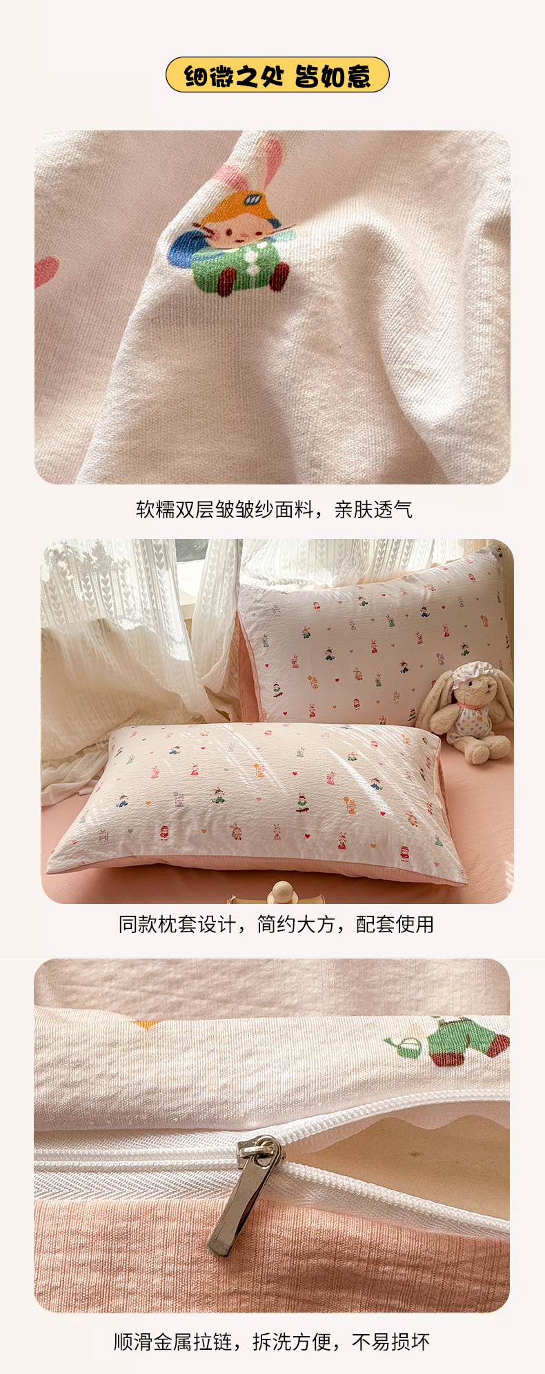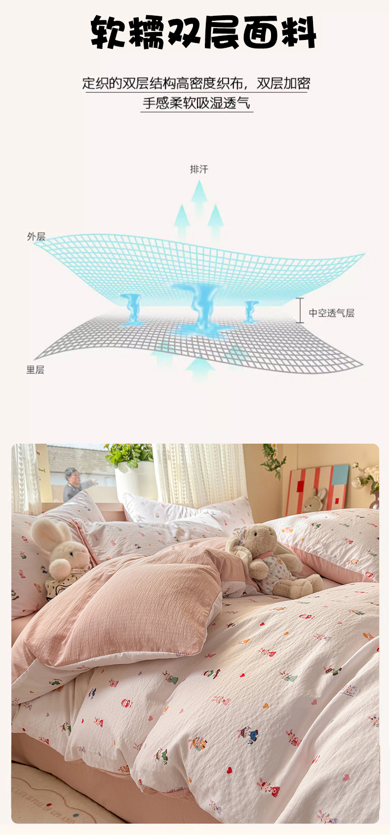 当前位置: 91家纺网 > 商品网购 > 床品套件 > 四件套 > 双层纱四件套 > 丽美人家纺 2026新款A类皱皱纱双层印花四件套 桃心萌兔集