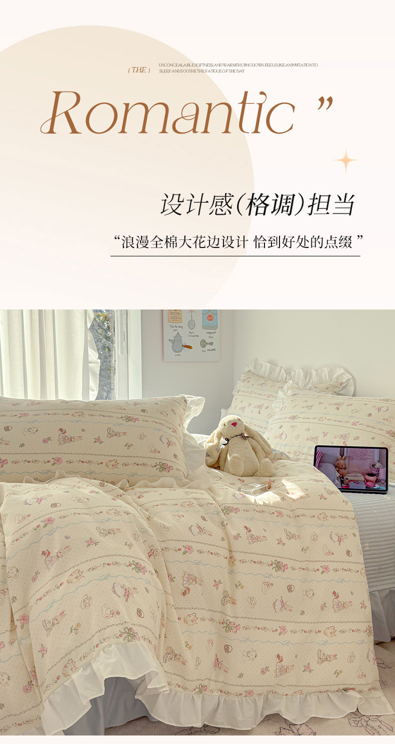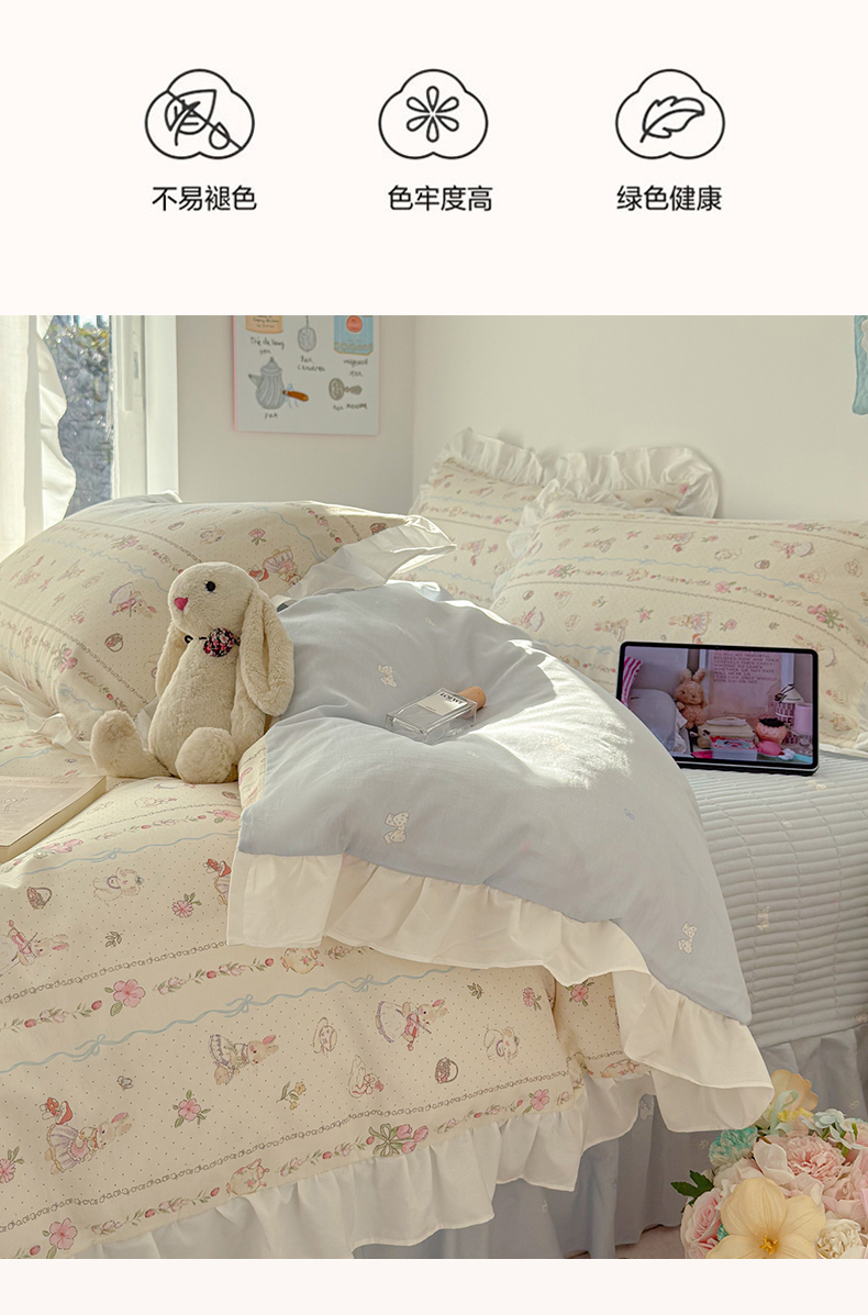 当前位置: 91家纺网 > 商品网购 > 床品套件 > 四件套 > 全棉普通四件套 > 女子家纺 2026新款全棉纯棉绗缝花边床盖四件套 幸福小兔