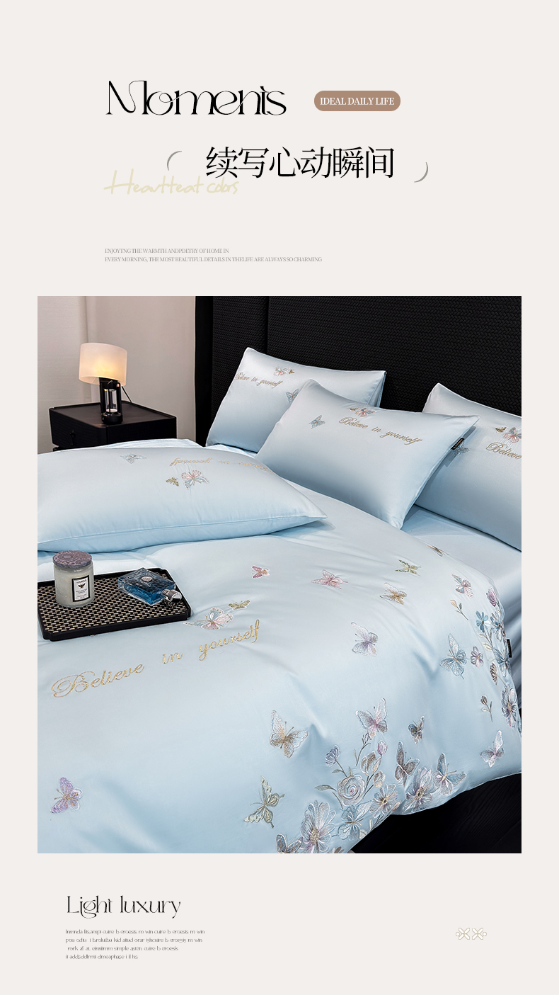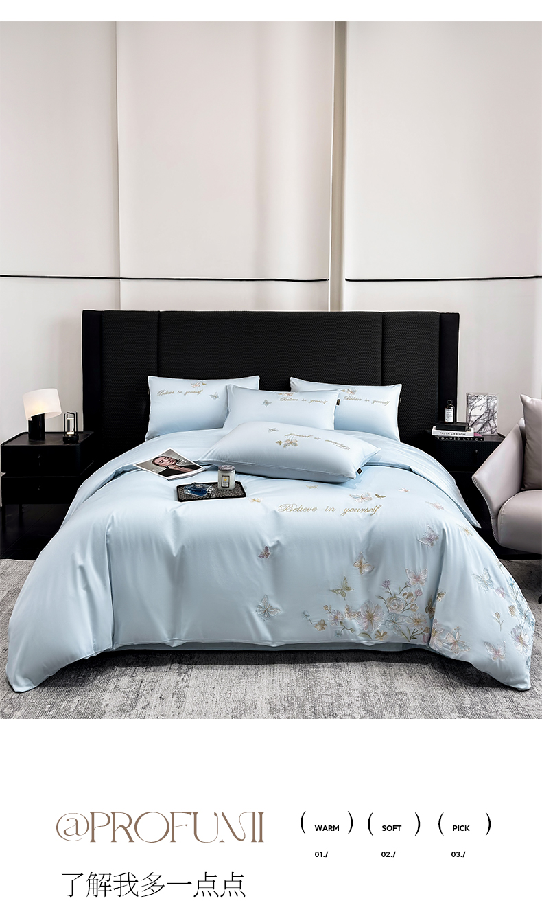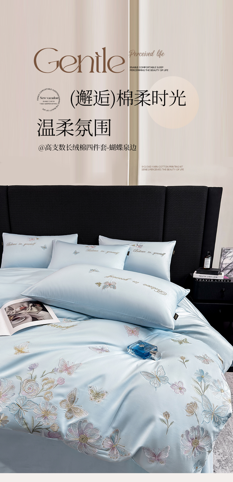 商品名称:莱势 2026新品100支纯棉全棉50x50s贡缎长绒棉刺绣绣花四件套高端礼盒-蝴蝶泉边 蝴蝶泉边-天空蓝
