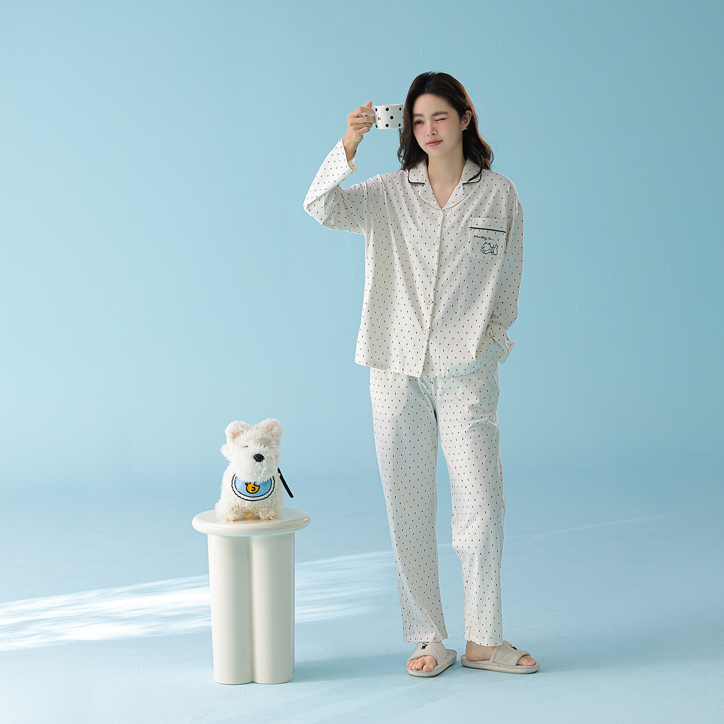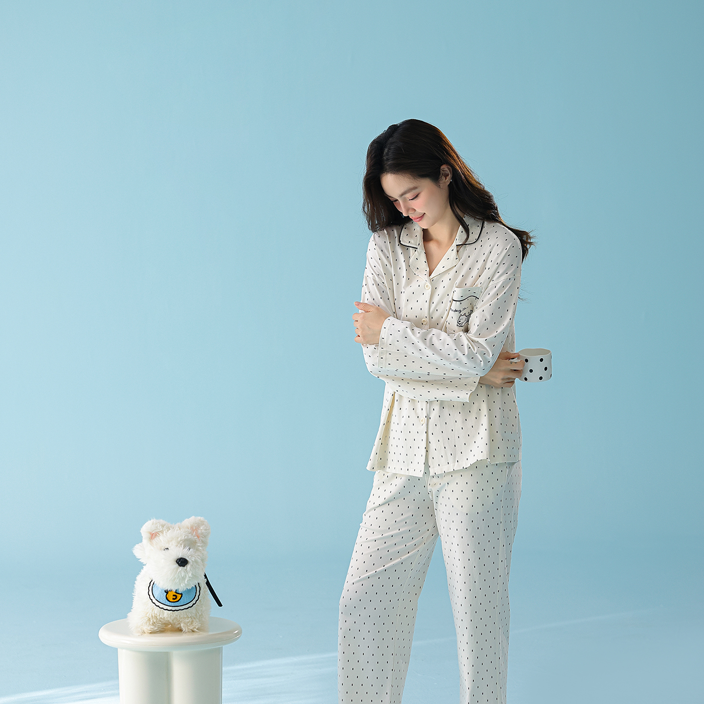 妍景家居生活馆 2026新款新疆棉情侣款翻领黑白波点套装 白色波点