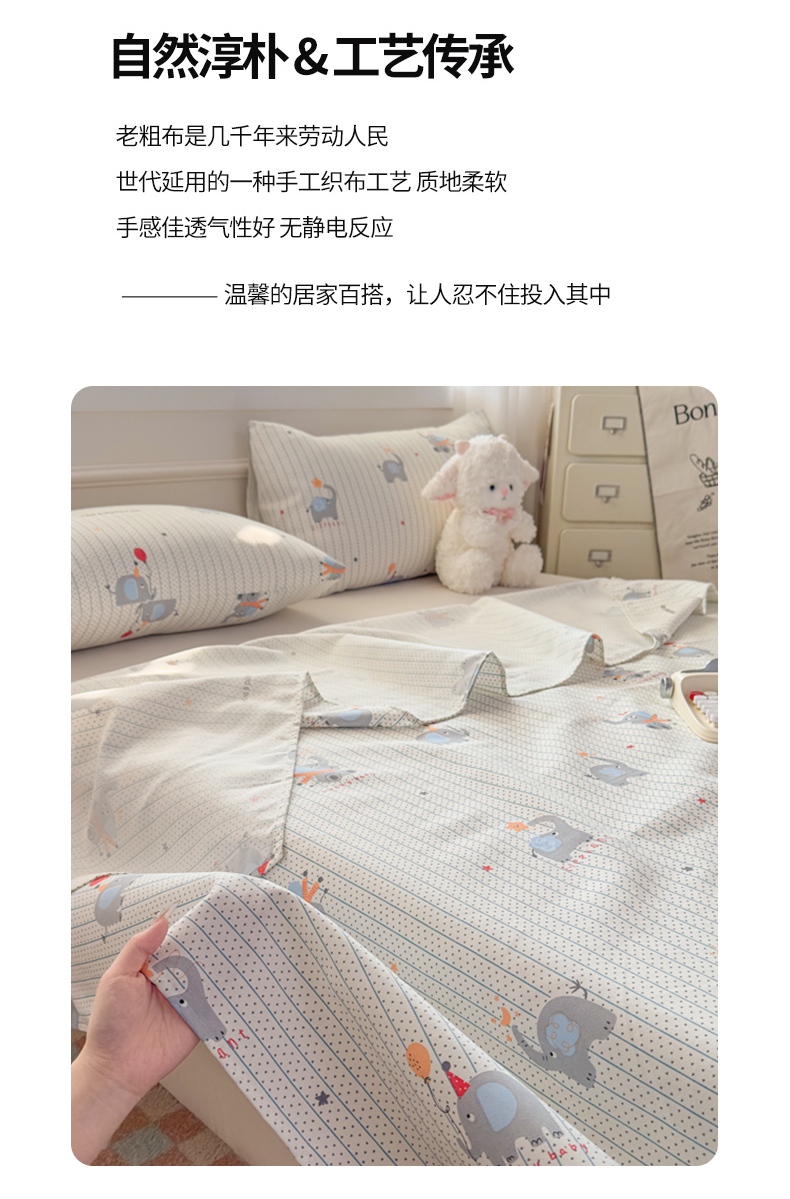 • 91家纺网 家纺一手货源 找家纺 爱彼家纺 2026新款细沙卡通原棉老粗布床单凉席床单三件套-新升级细沙 元气小象