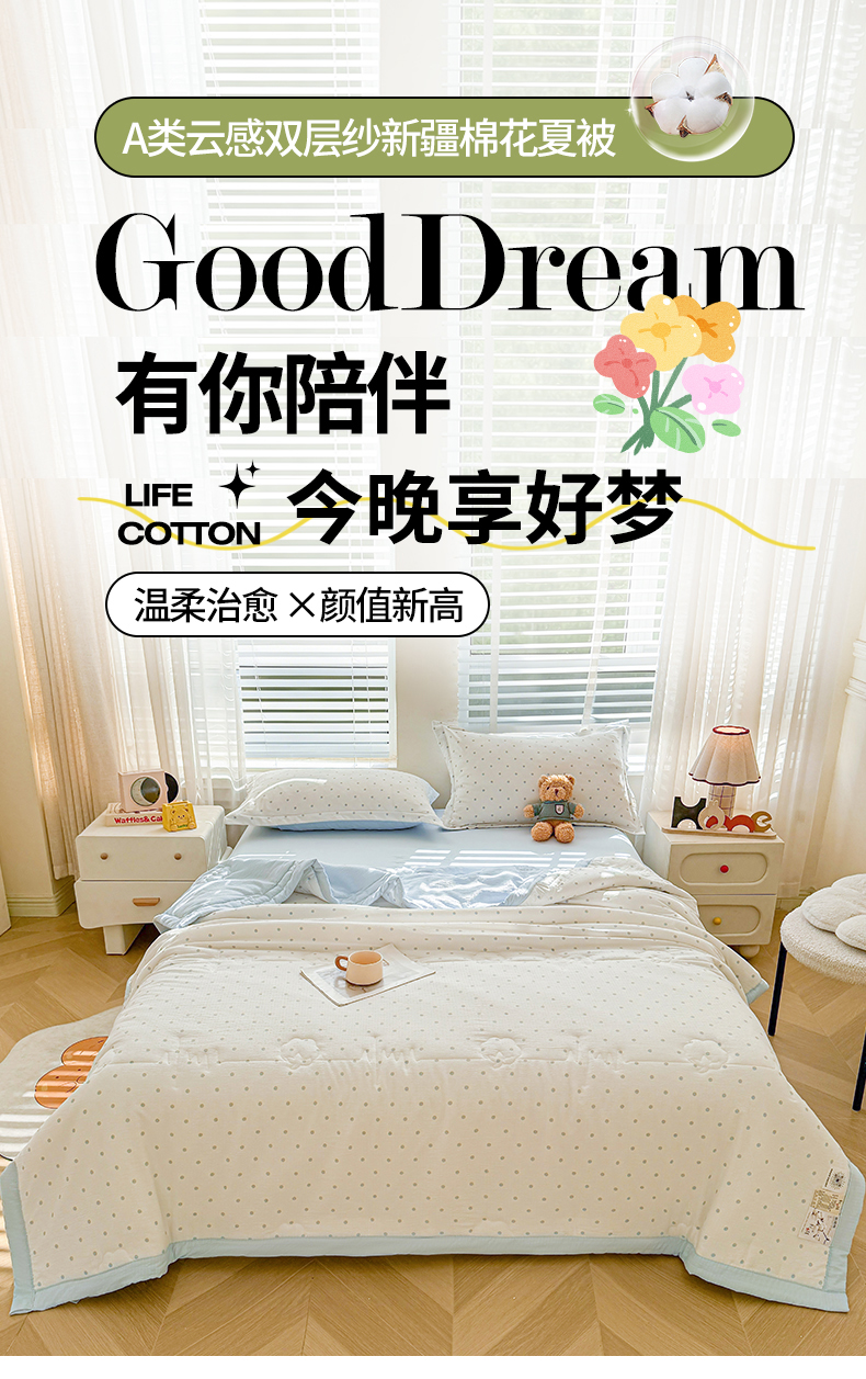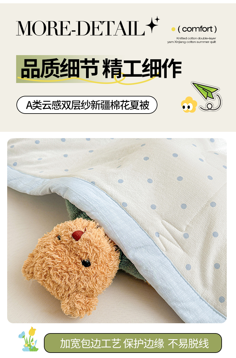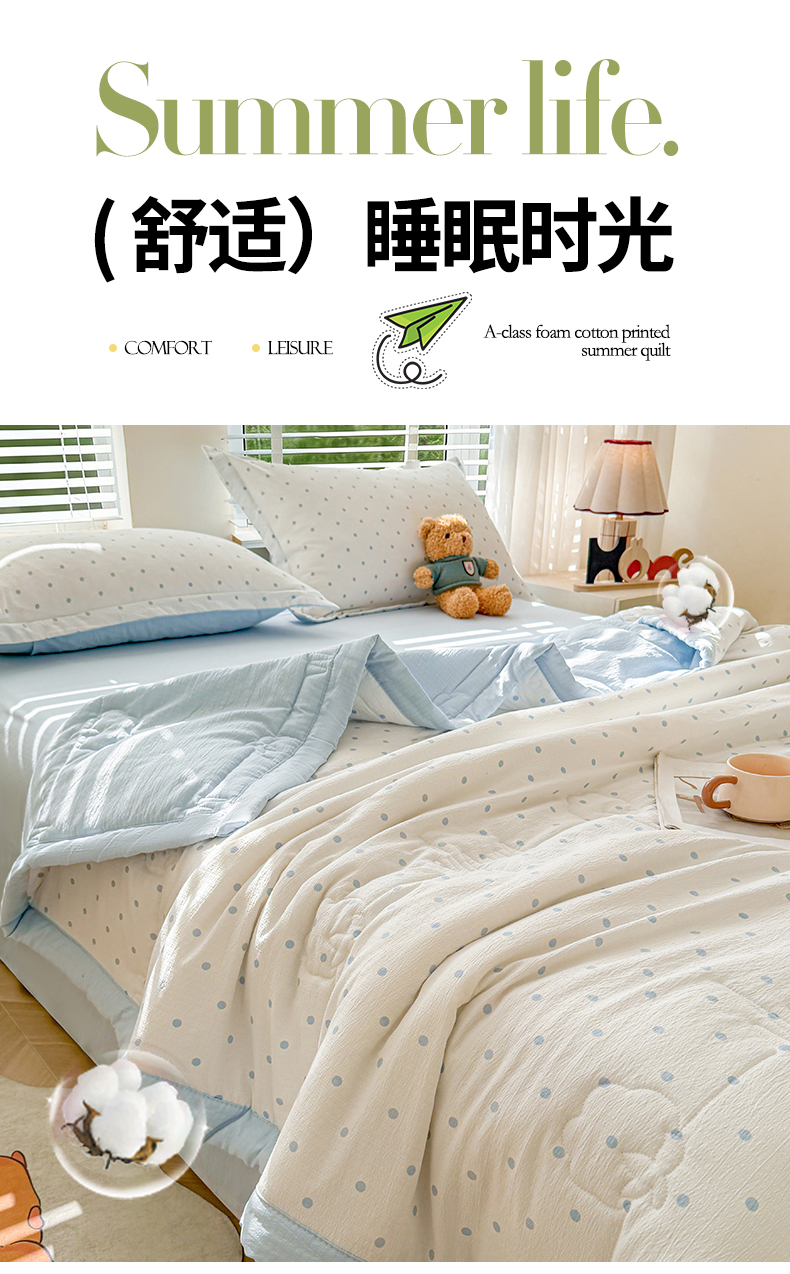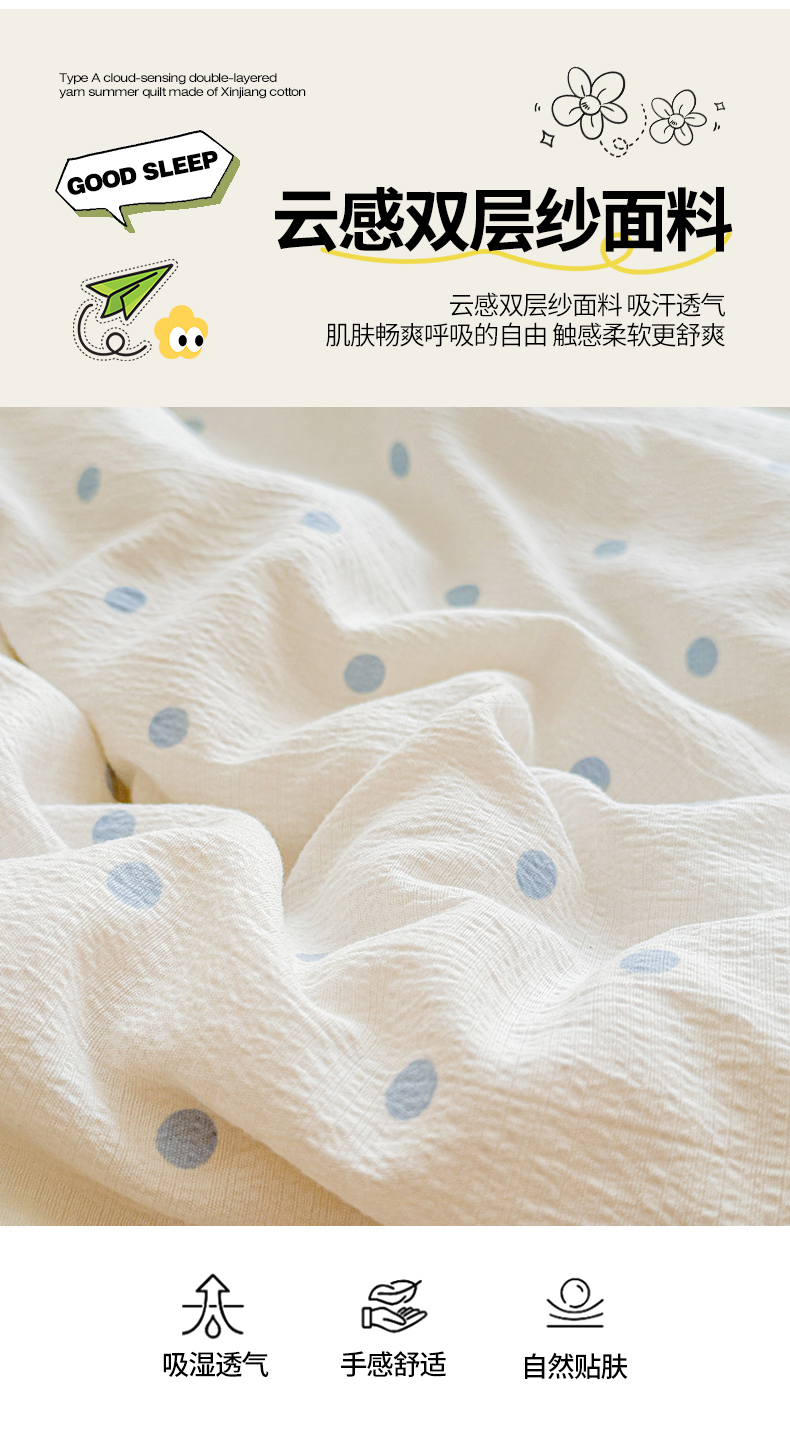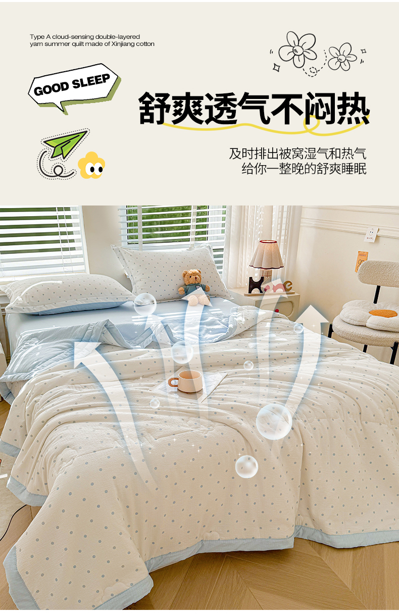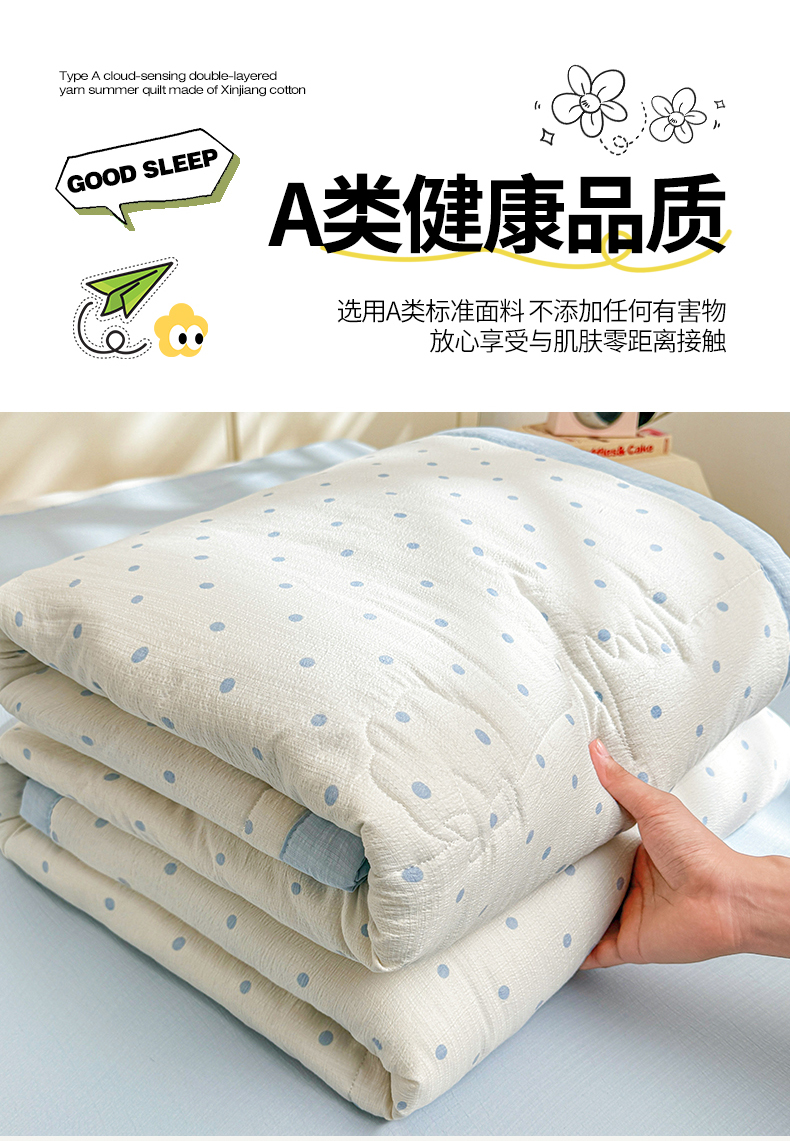 被子 > 夏被 > 西域种棉人·千百笠 2026新款A类新疆棉花夏凉被加宽包边水洗棉卡通印花吸湿透气棉花夏被空调被 云感波点