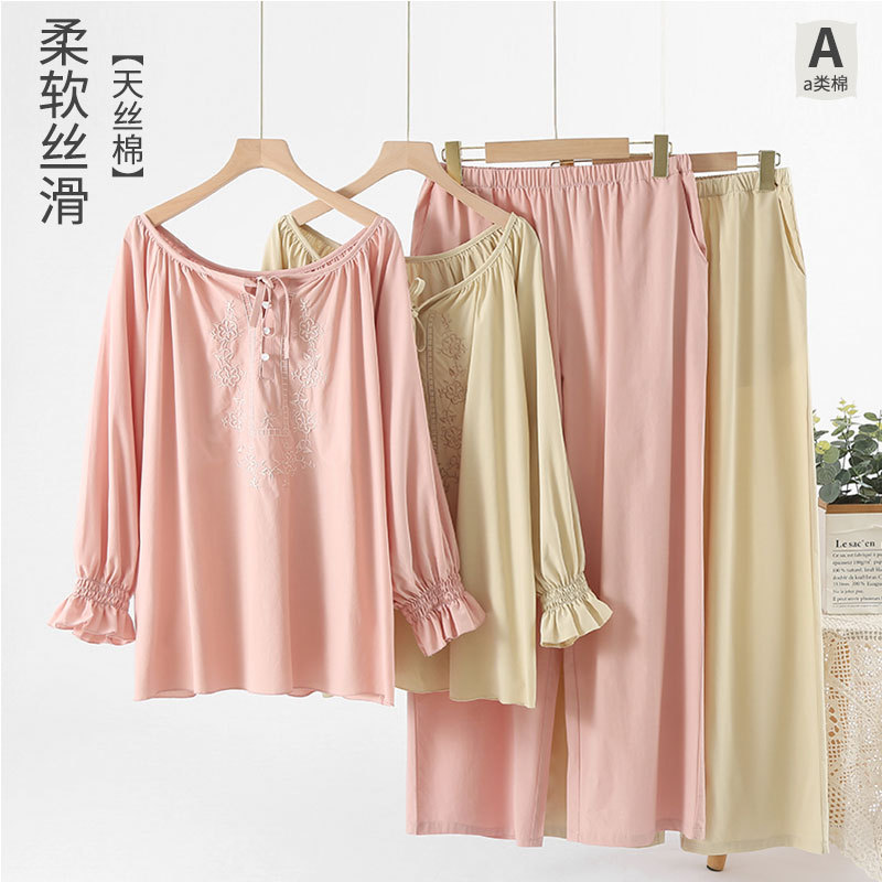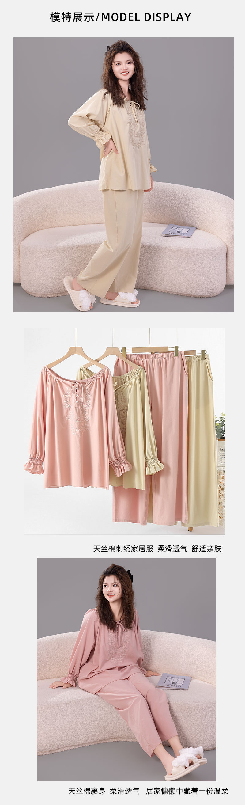 (总)洛兰沙家居馆 小香风天丝棉睡衣女春秋薄款国风刺绣长袖宽松大码家居服可外穿