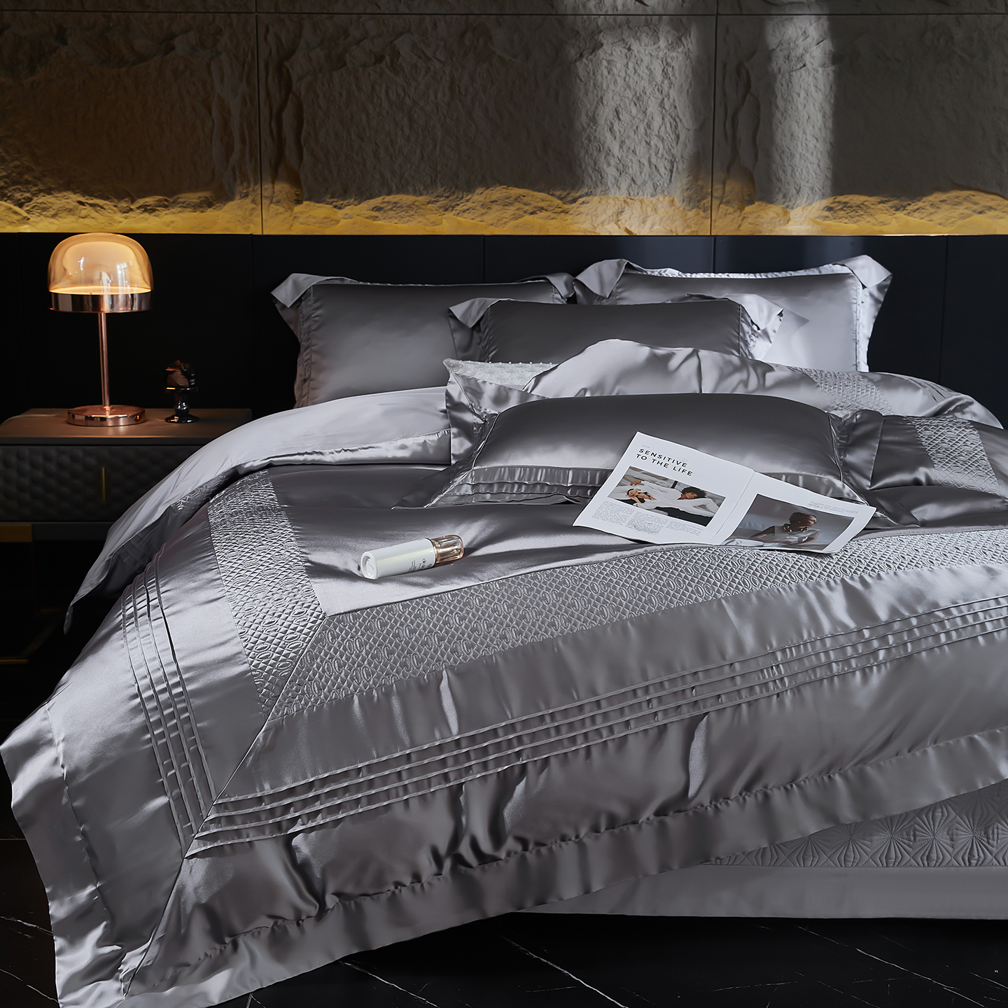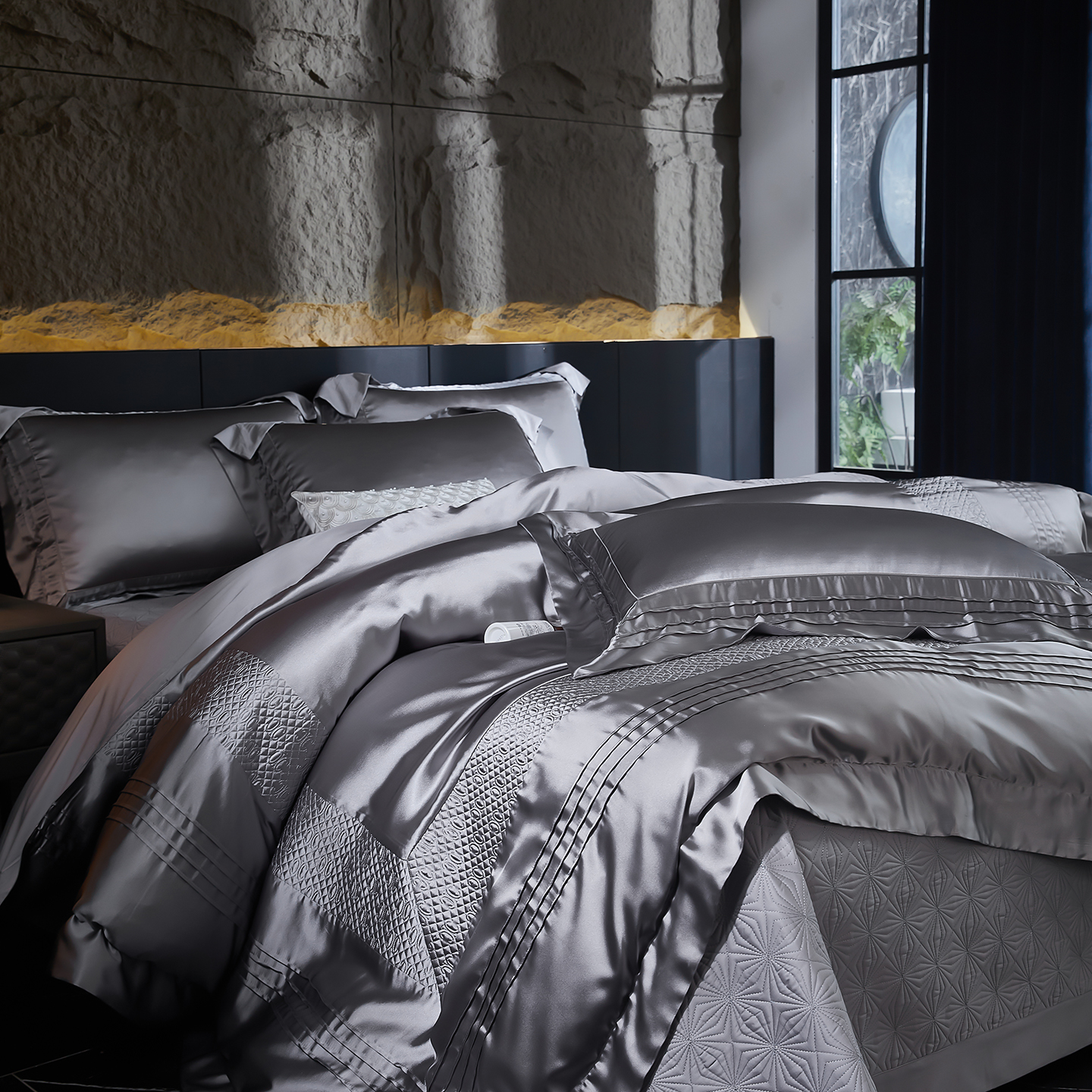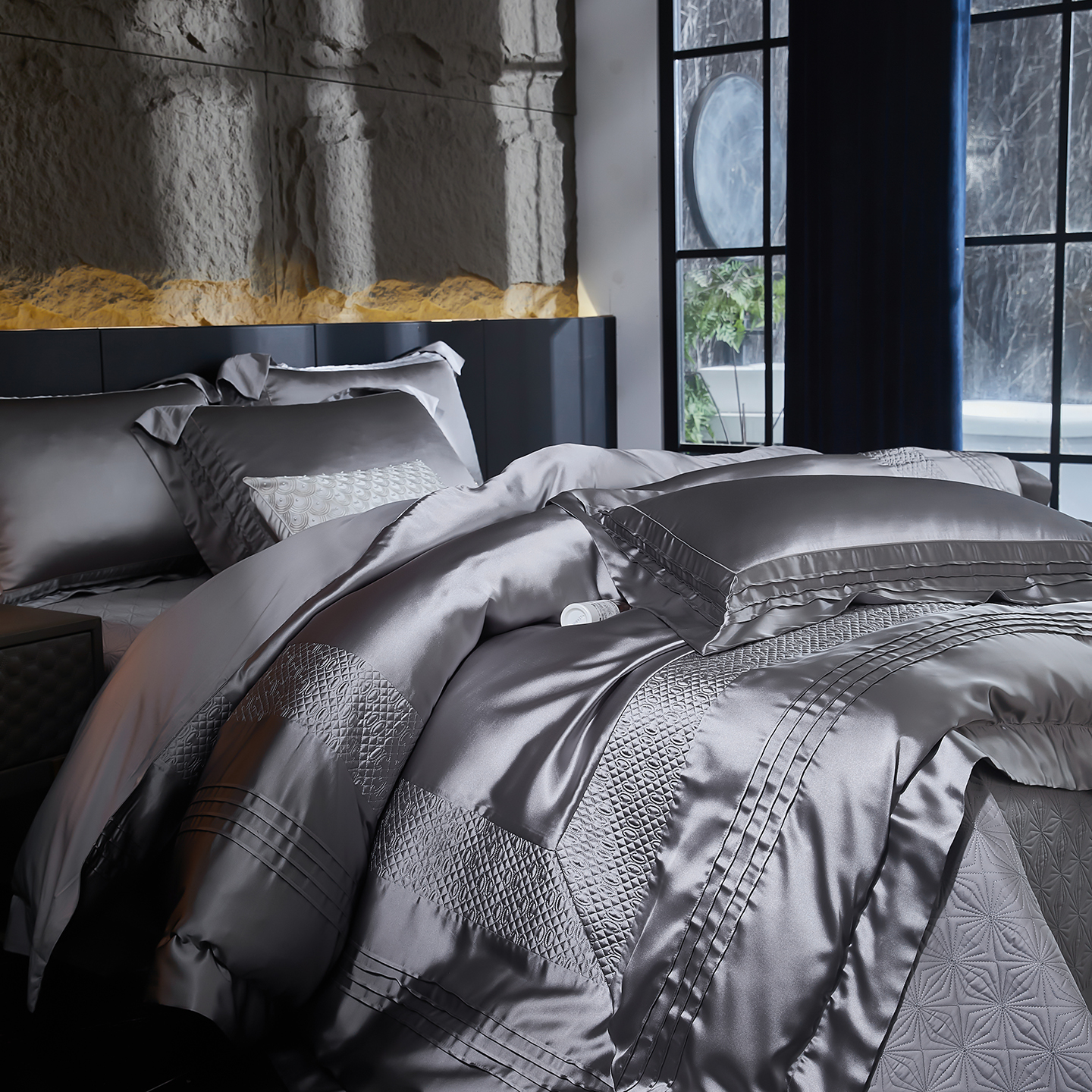 (总)edra 2026新款真丝天丝轻奢提花床盖款四件套-繁花,繁花-深灰,繁花-银灰