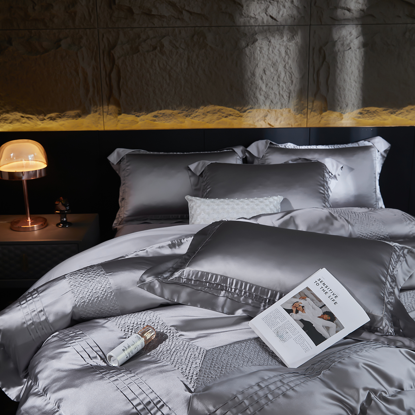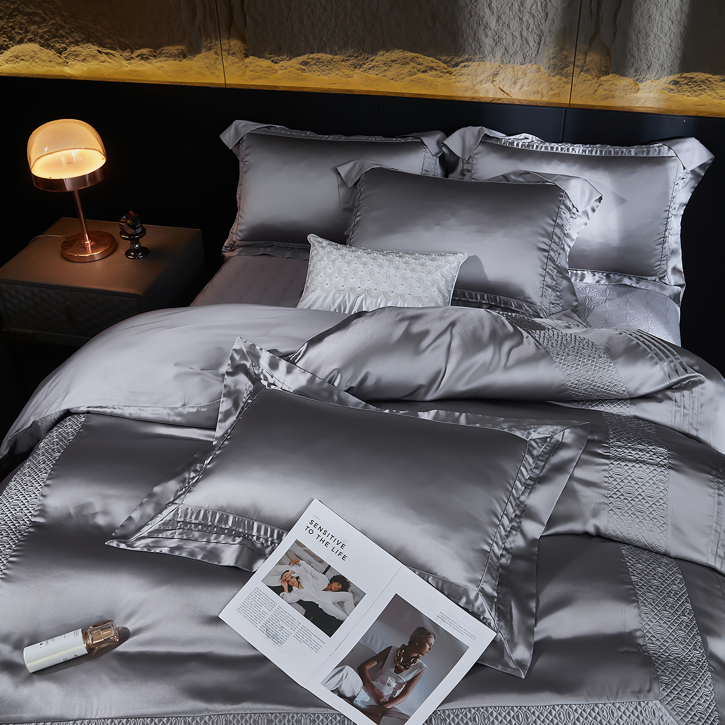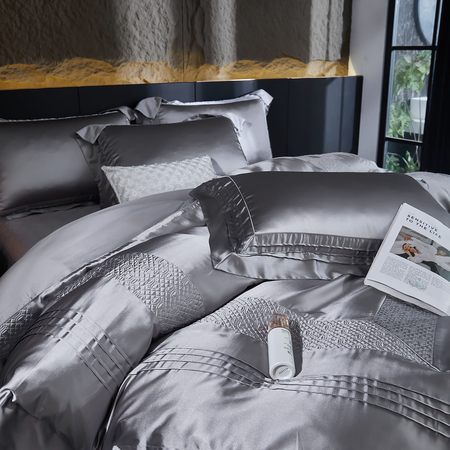(总)edra 2026新款真丝天丝轻奢提花床盖款四件套-繁花,繁花-深灰,繁花-银灰