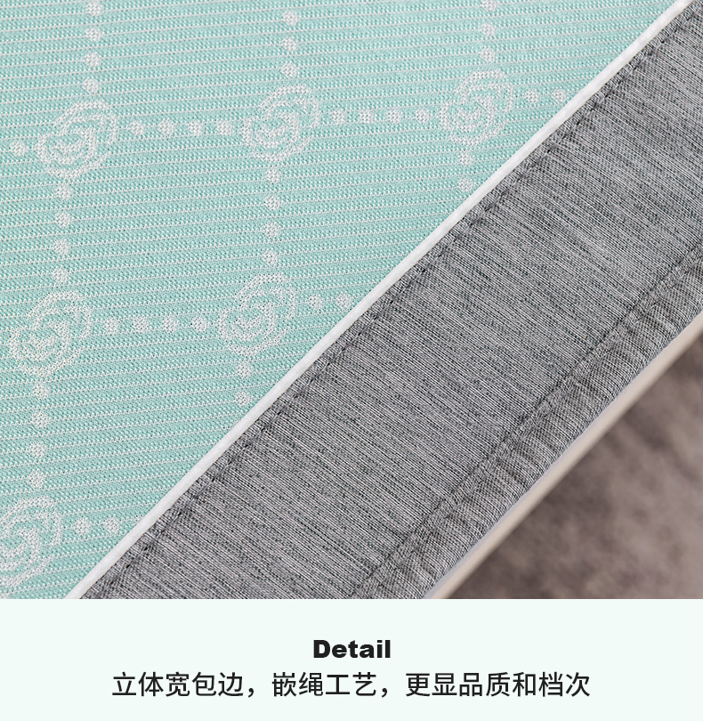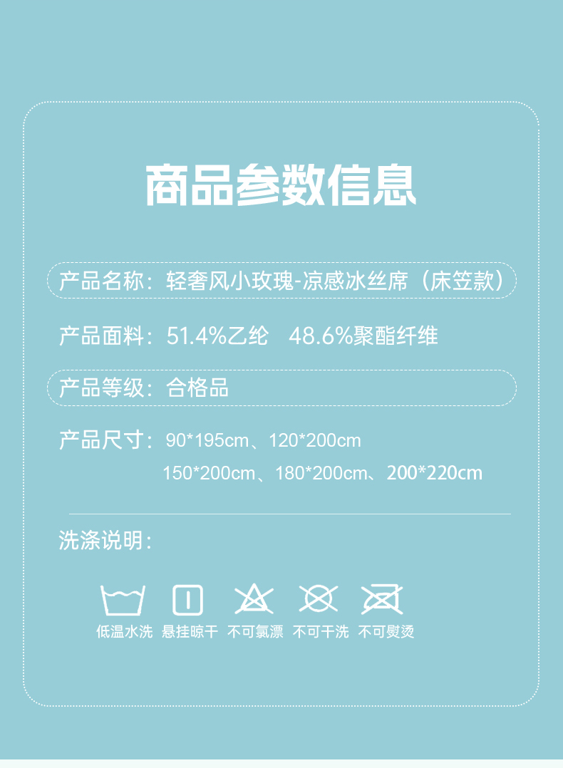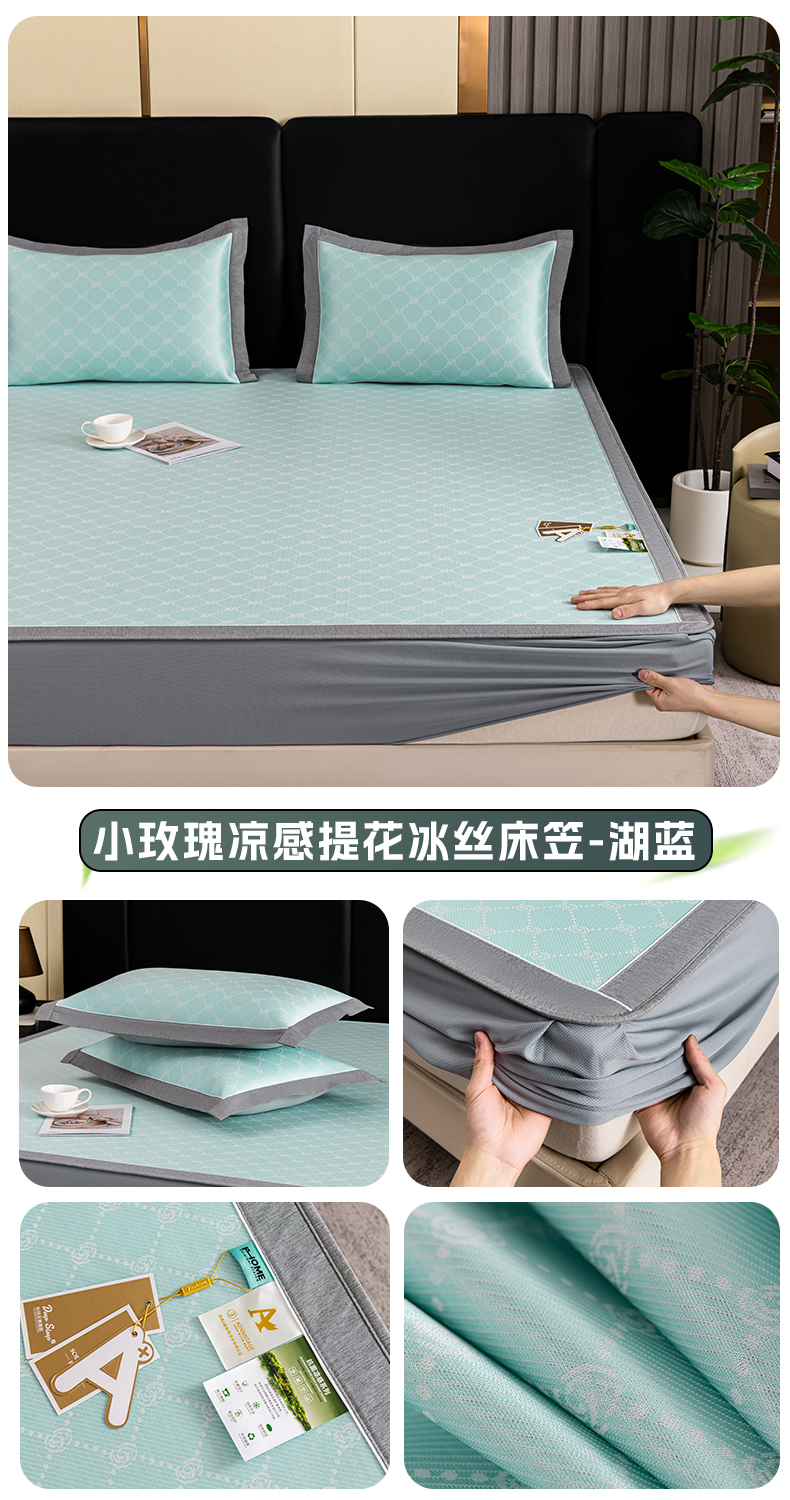 商品名称:小牛席业 2026新款轻奢风提花凉感冰丝席系列(床笠款)小玫瑰凉席藤席冰藤双面席冰丝席竹席凉席空调席草席三件套 湖蓝