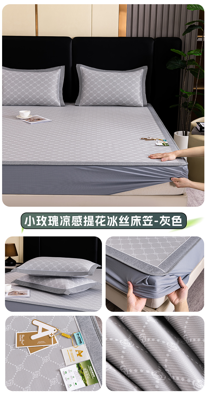 (总)小牛席业 2026新款【实拍风格】双PE高凉感-迪恩玫瑰提花冰丝席(床笠款)凉席竹席藤席冰藤席乳胶席豆豆席,粉色,灰色,蓝色,香槟