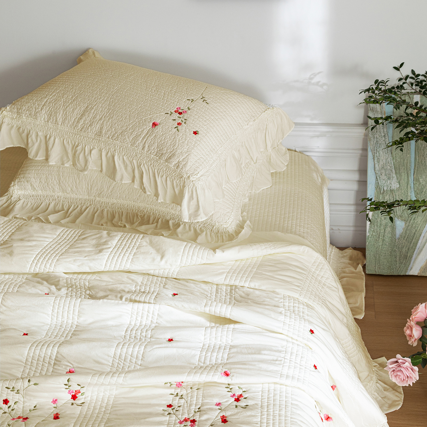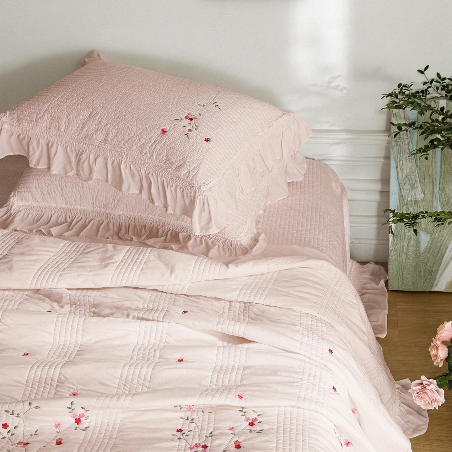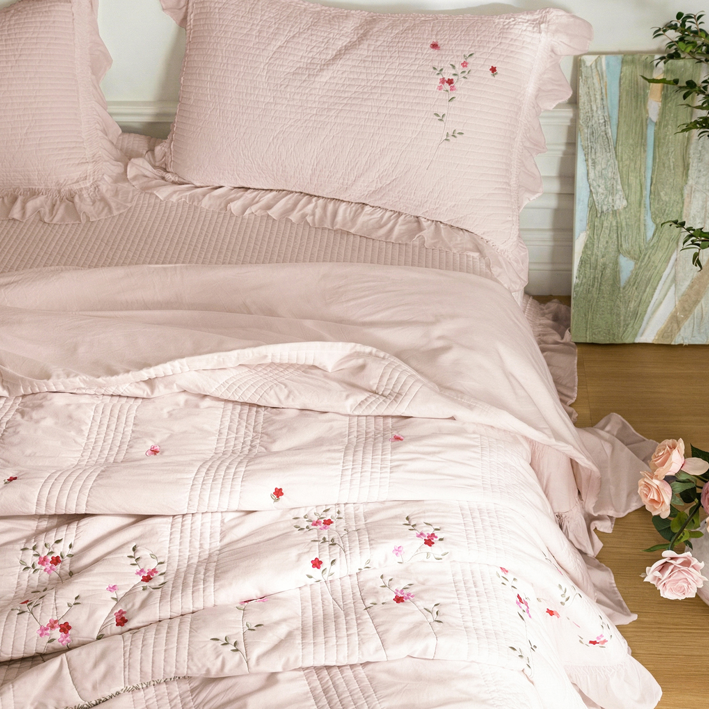 (总)上喜 2026新款棉麻小花刺绣款床盖多功能被子系列,麻本色,麻粉色