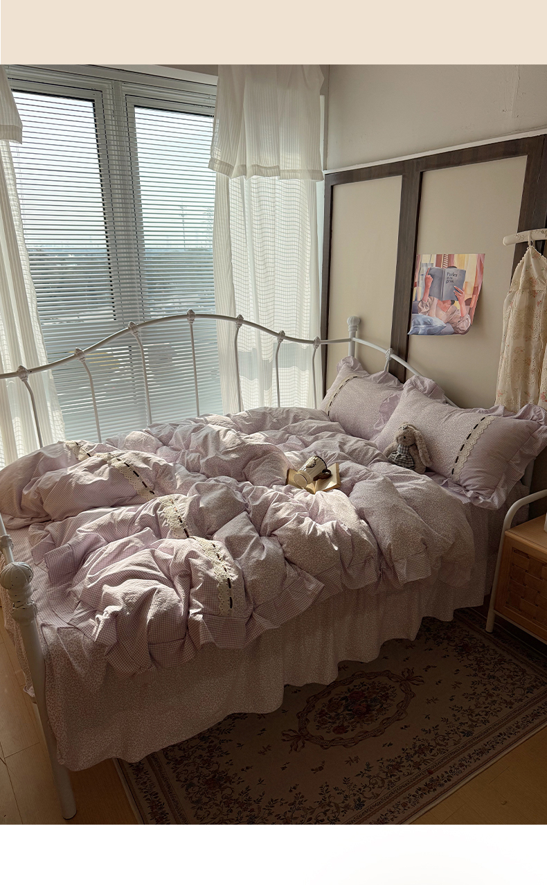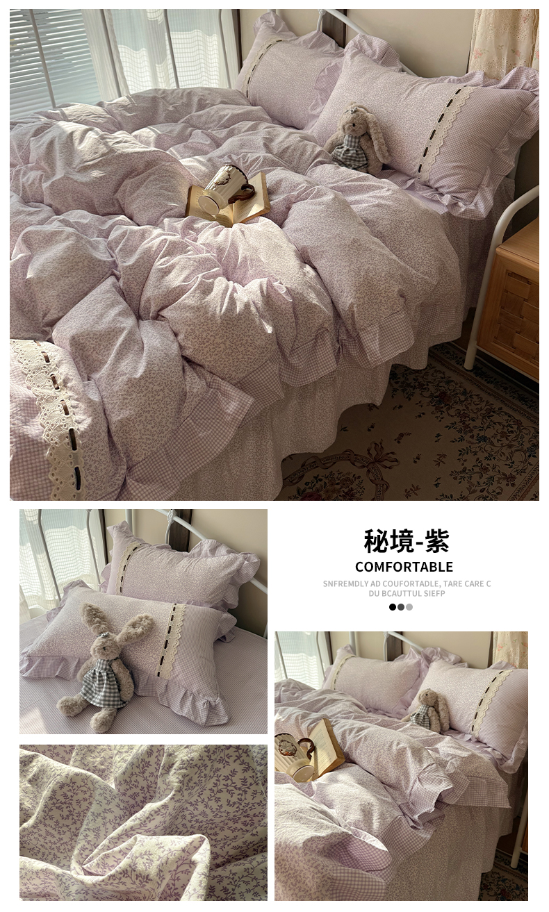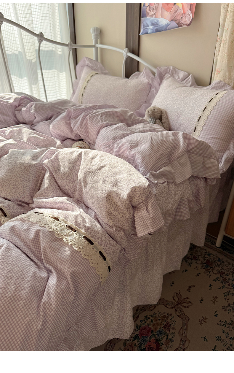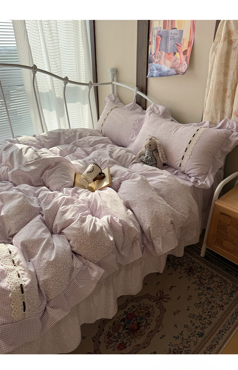 当前位置: 91家纺网 > 商品网购 > 床品套件 > 四件套 > 其它四件套 > 韩都家居 2026春夏新款韩式小碎花水洗古棉花边四件套 秘境-紫