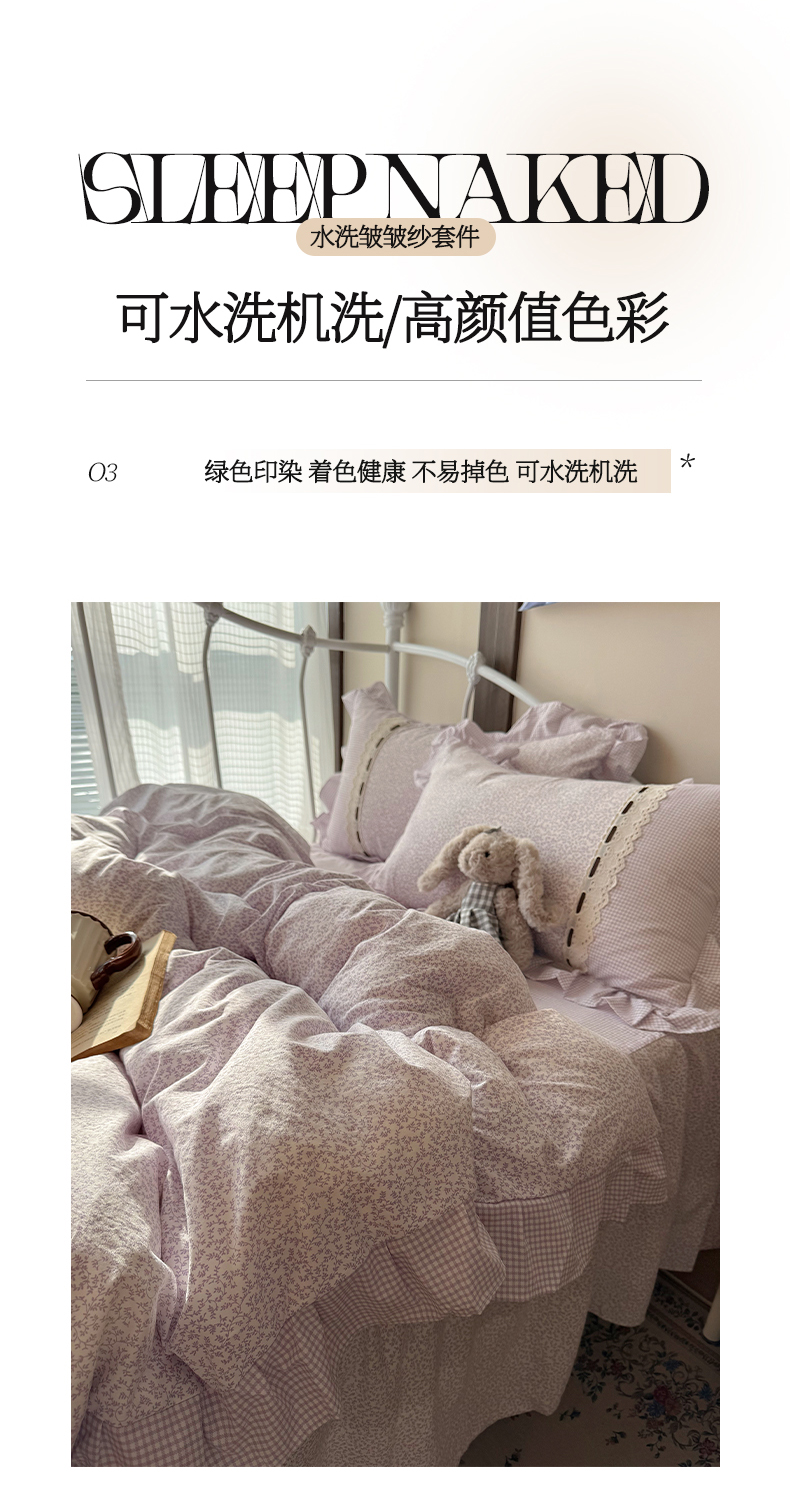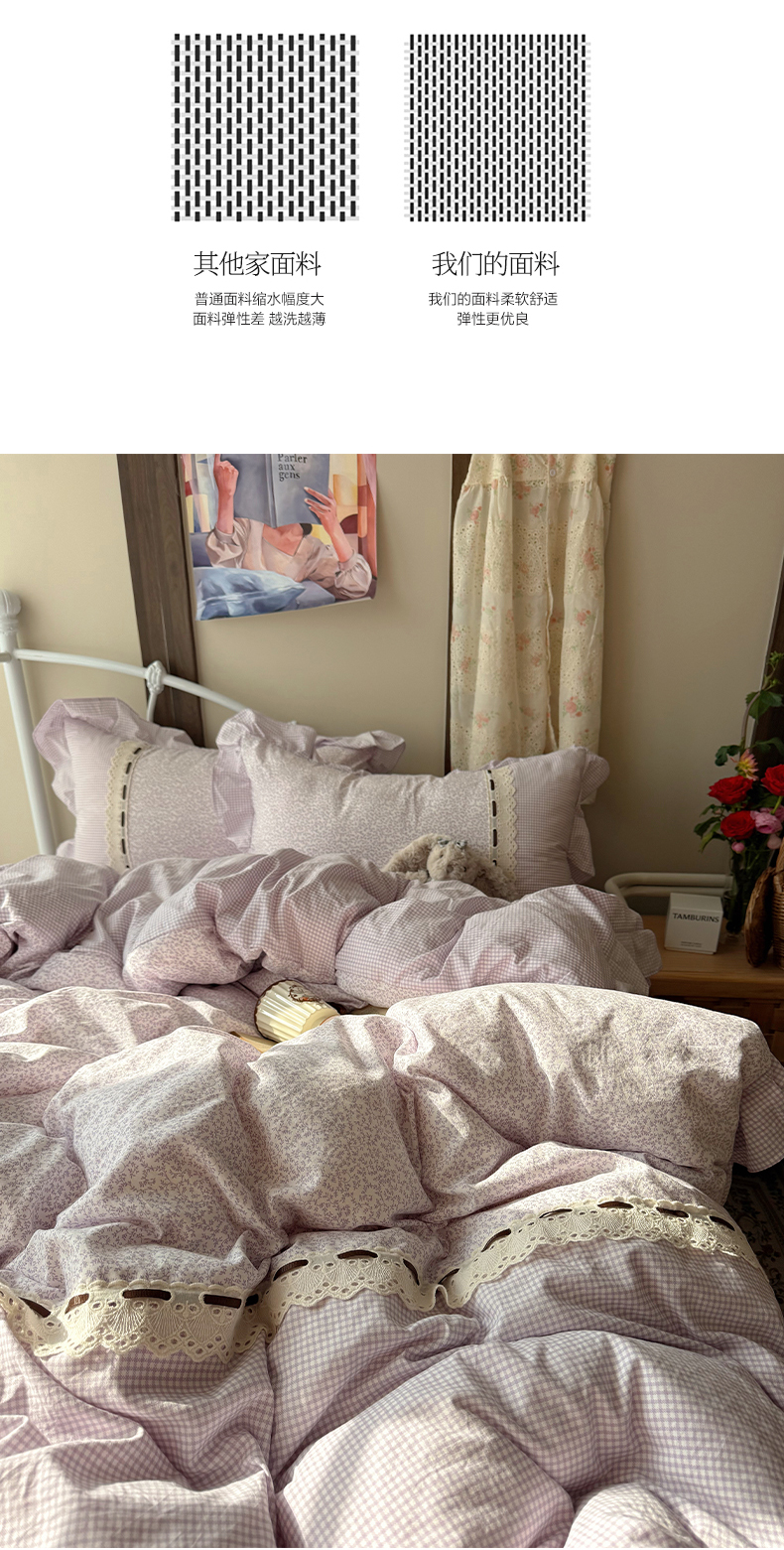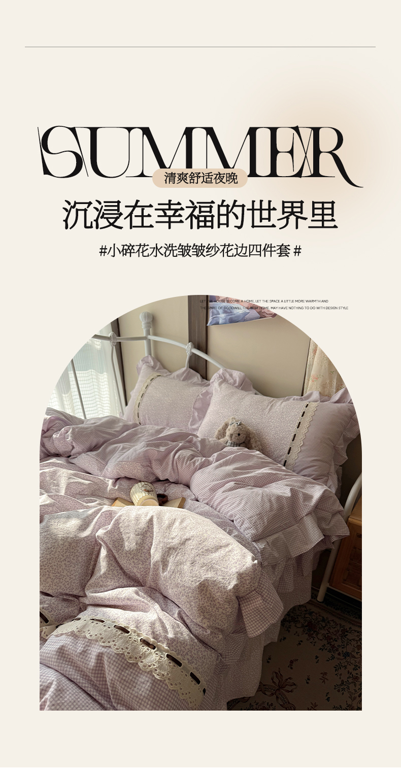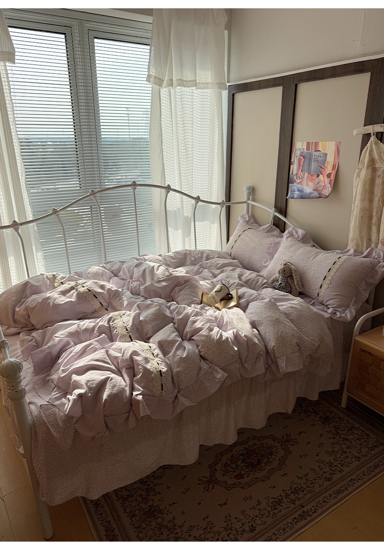 当前位置: 91家纺网 > 商品网购 > 床品套件 > 四件套 > 其它四件套 > 韩都家居 2026春夏新款韩式小碎花水洗古棉花边四件套 秘境-紫