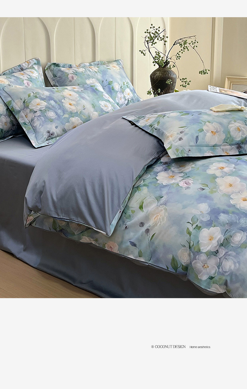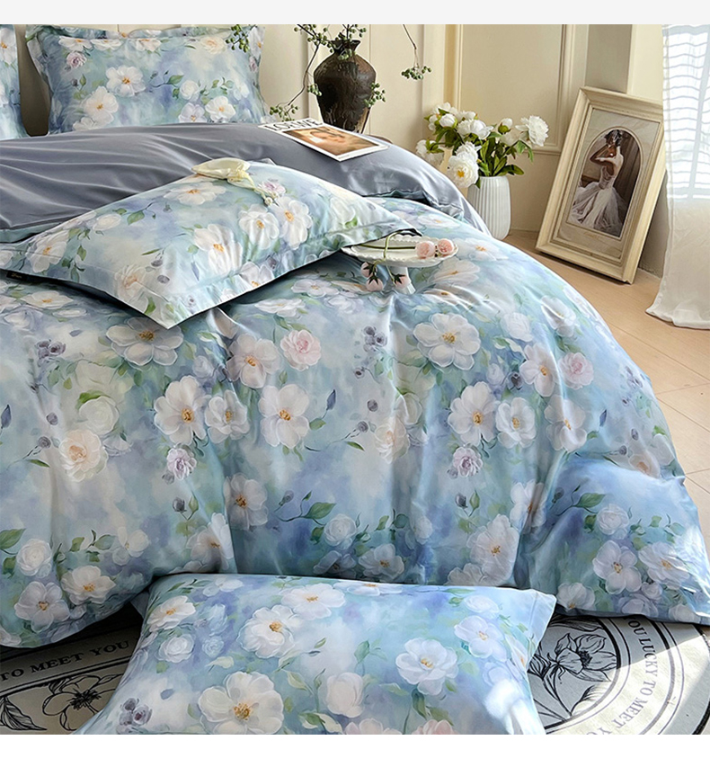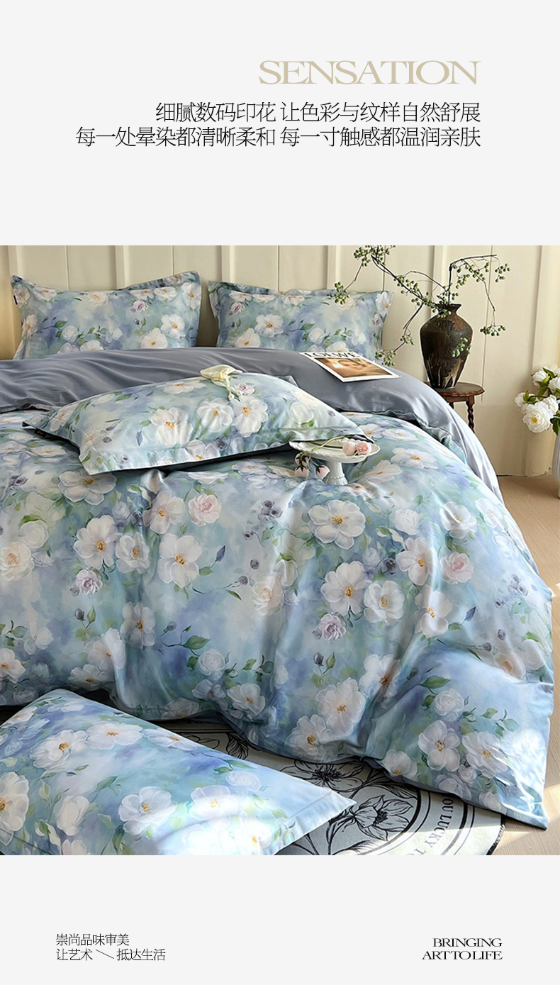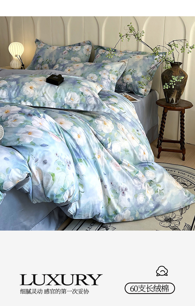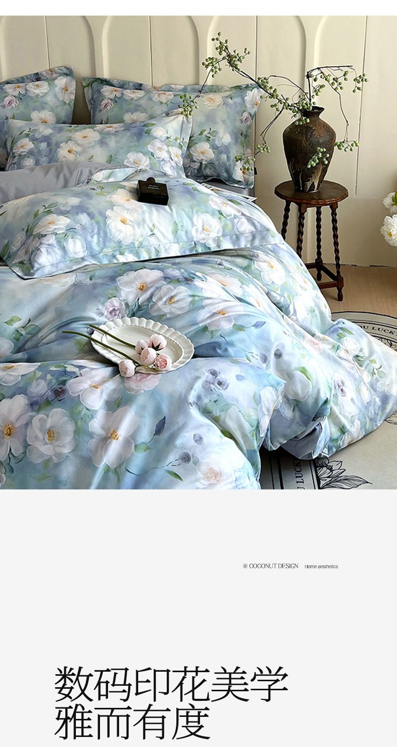 商品名称:帅露家纺 2026新款全棉60支长绒棉数码印花四件套 烟雨蒙蒙-绿