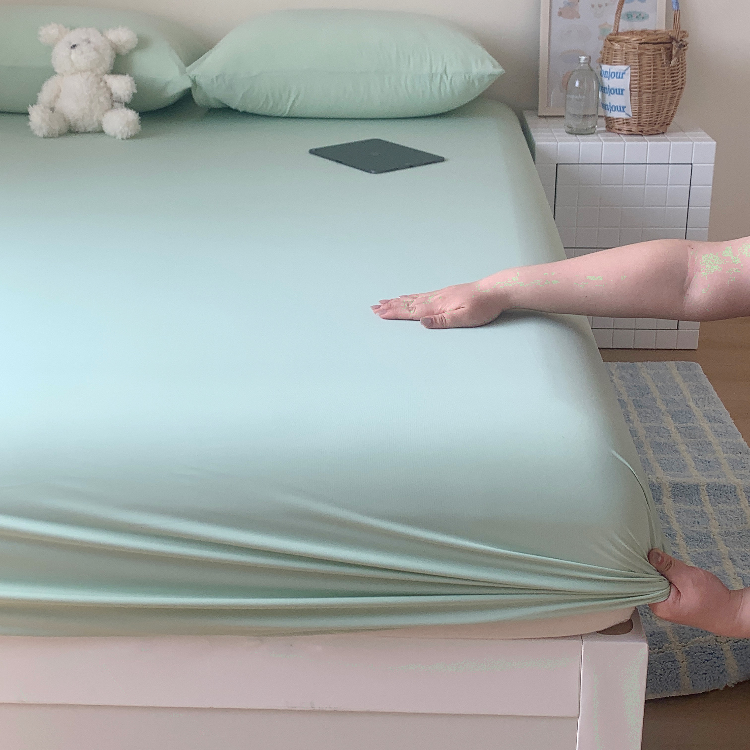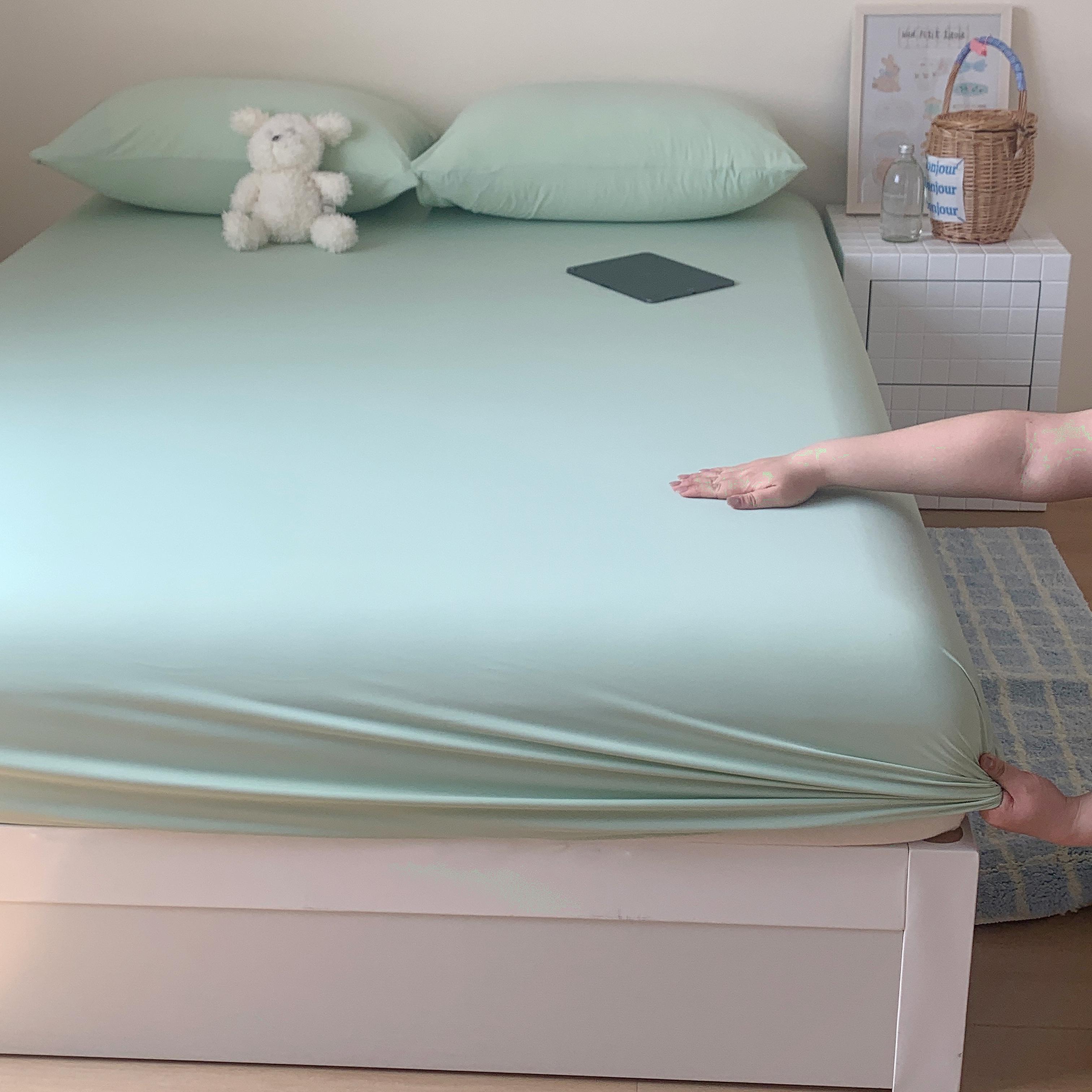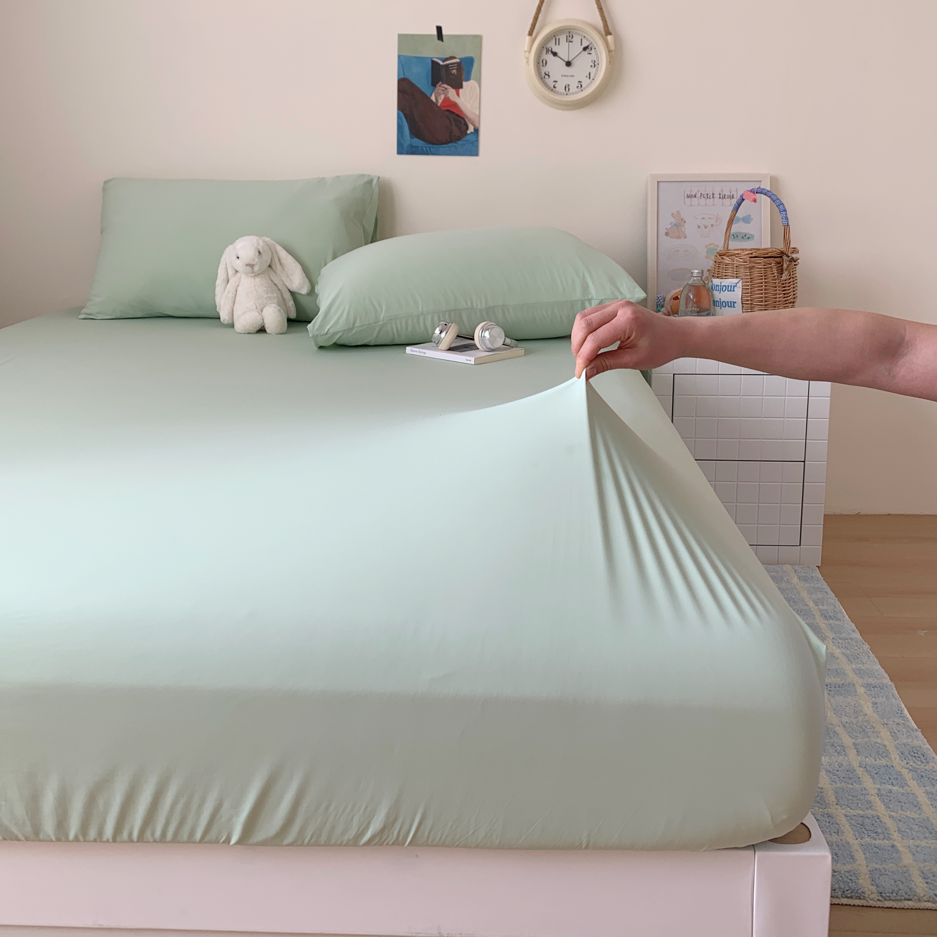 • 91家纺网 家纺一手货源 找家纺 (总)桃喜 2026新款2026新款纯色165gA类锦氨凉感冰皮床笠单品床笠有凉感值检测报告,草绿,蜜桃粉,木槿紫,奶茶咖,奶昔黄,深睡蓝,炭灰色,天空蓝
