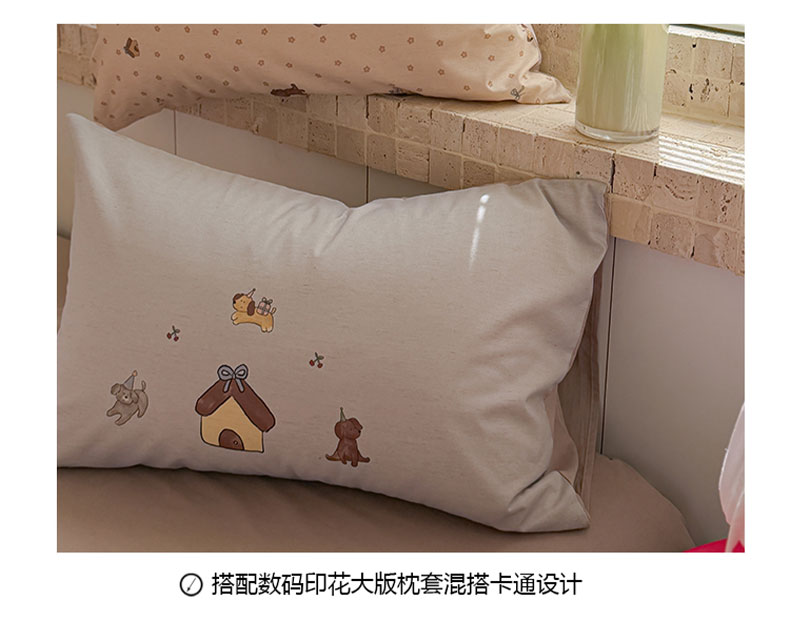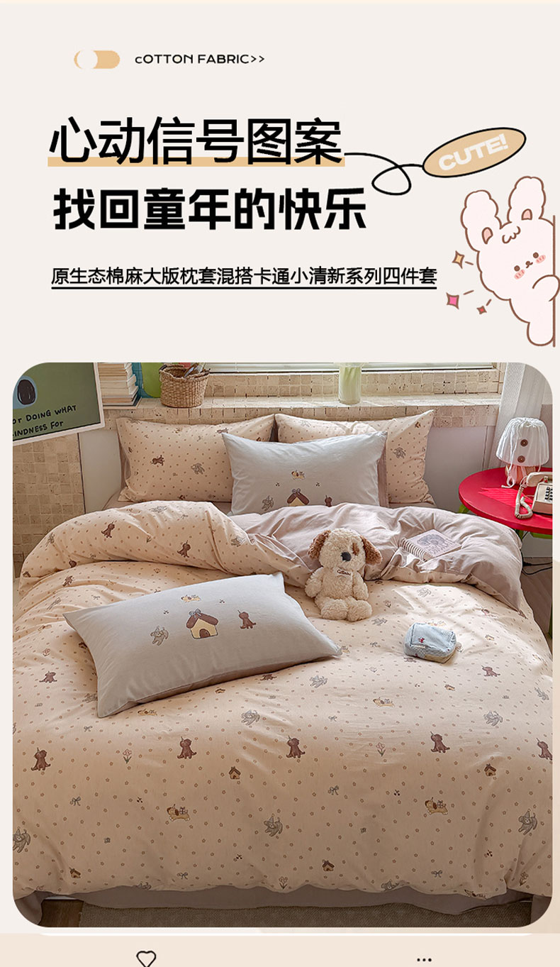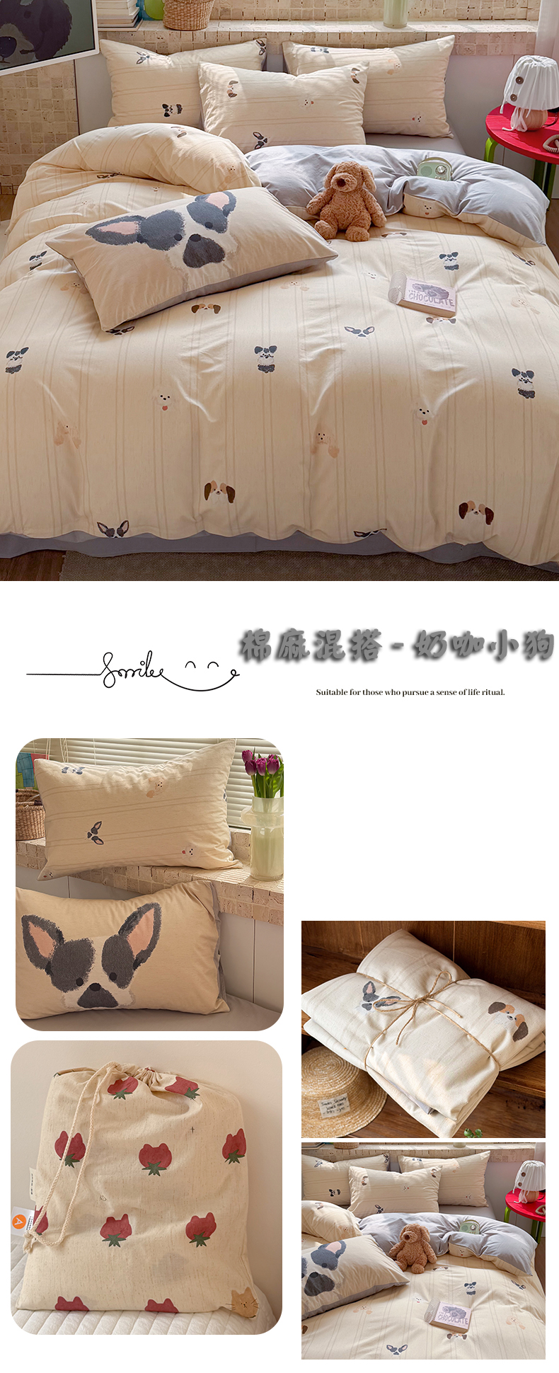 当前位置: 91家纺网 > 商品网购 > 床品套件 > 四件套 > 其它四件套 > 桃子家居 2026A类纯棉水洗原生态棉麻数码印花大版枕套混搭卡通小清新韩国小布袋系列四件套 棉麻混搭-奶芙小狗屋