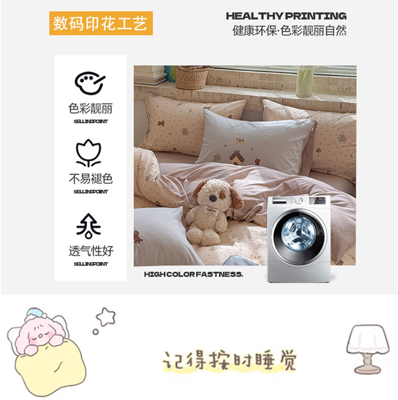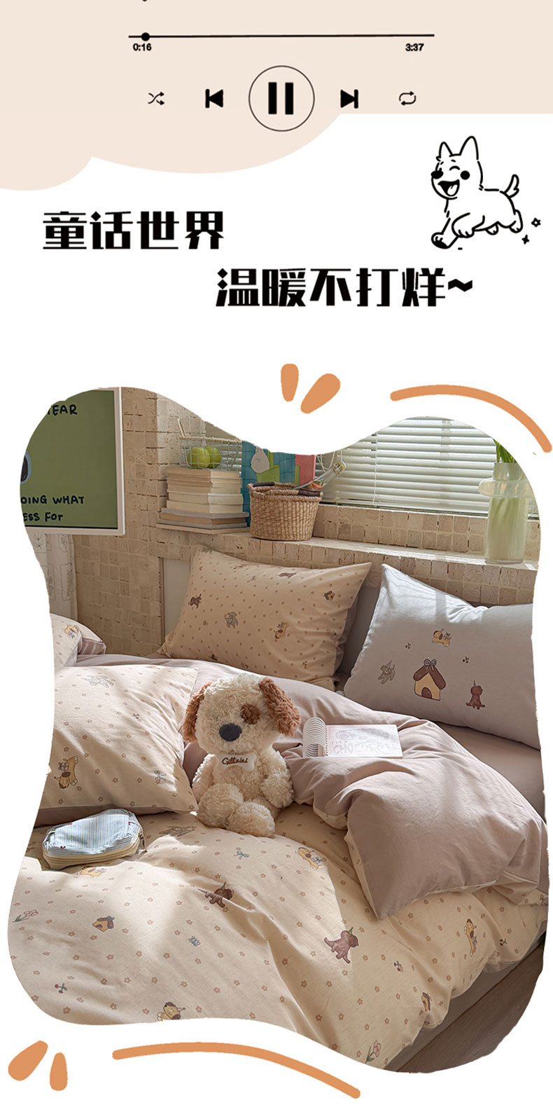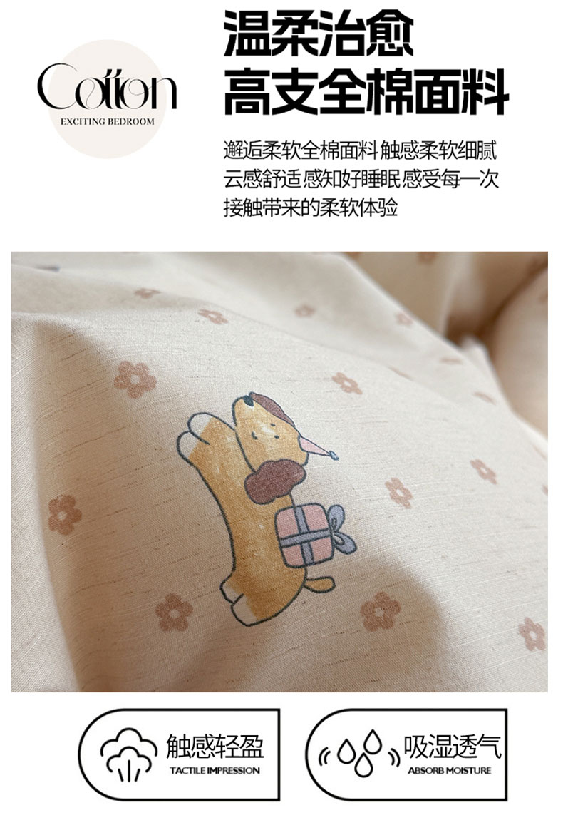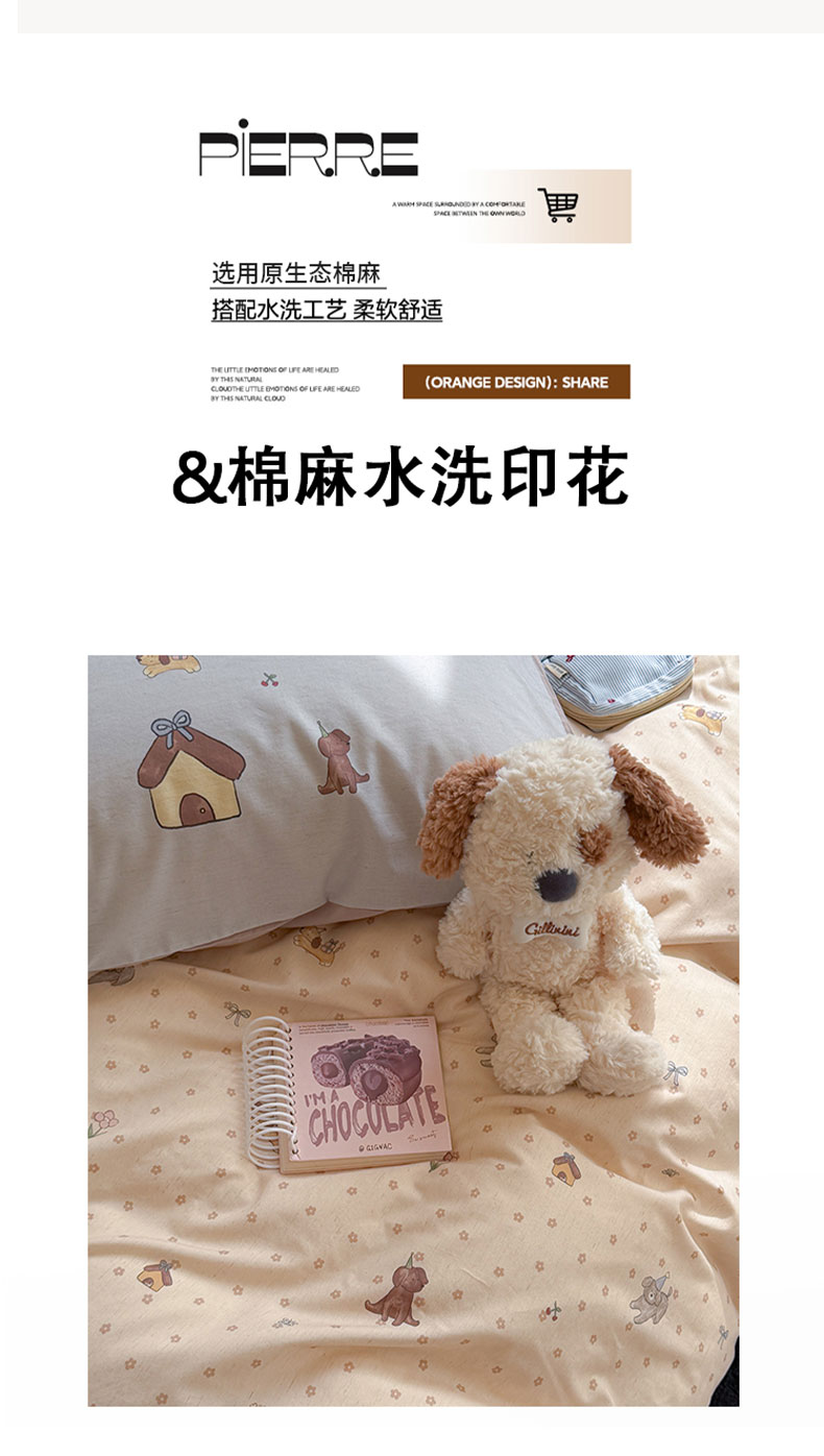 当前位置: 91家纺网 > 商品网购 > 床品套件 > 四件套 > 其它四件套 > 桃子家居 2026A类纯棉水洗原生态棉麻数码印花大版枕套混搭卡通小清新韩国小布袋系列四件套 棉麻混搭-奶芙小狗屋
