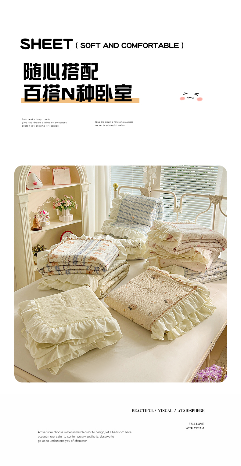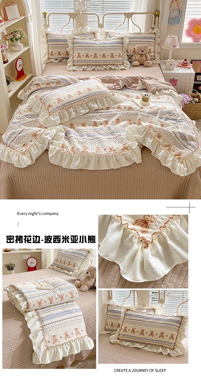 当前位置: 91家纺网 > 商品网购 > 床品套件 > 四件套 > 夏被四件套 > 富米莱(原臻工厂) 2026新款超温柔高弹线密拷花边款泡芙双层纱夏凉被床盖床裙四件套 密拷花边-彩点小熊