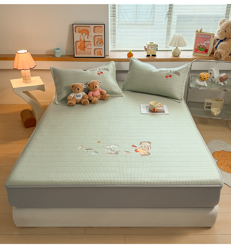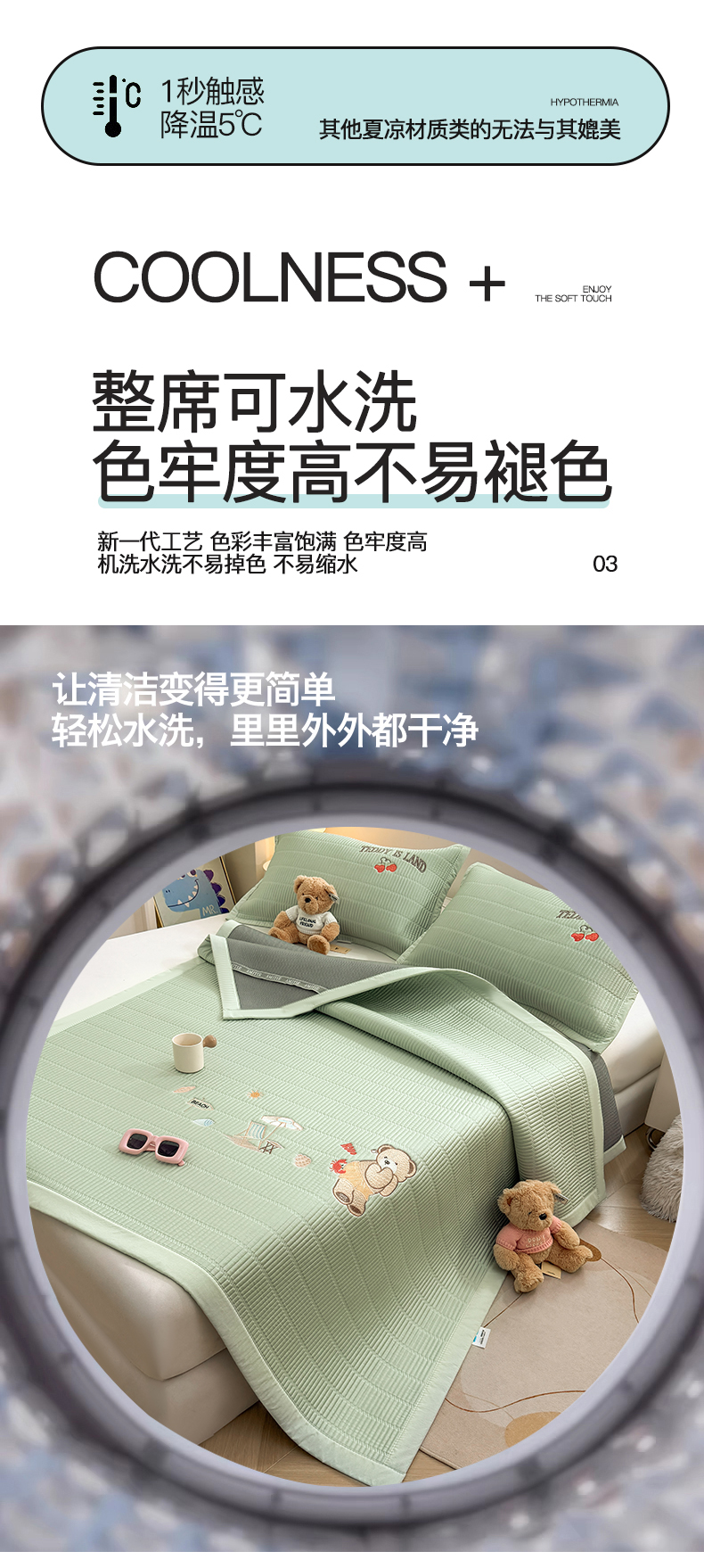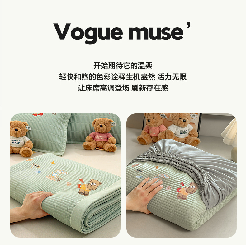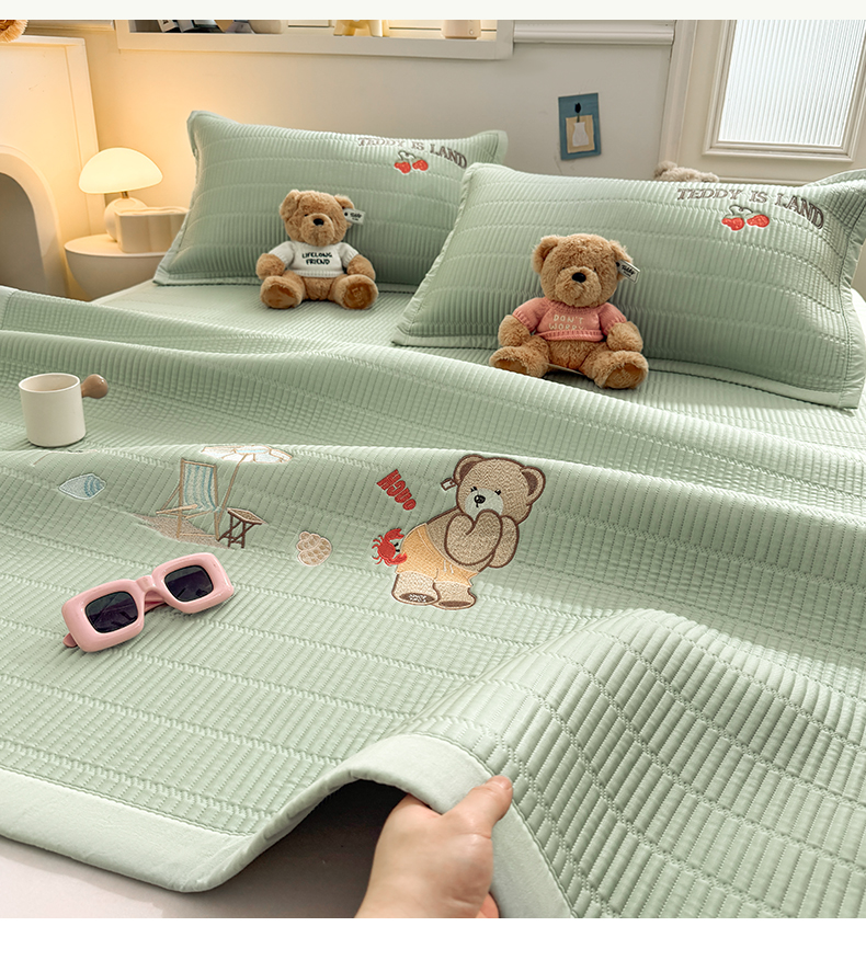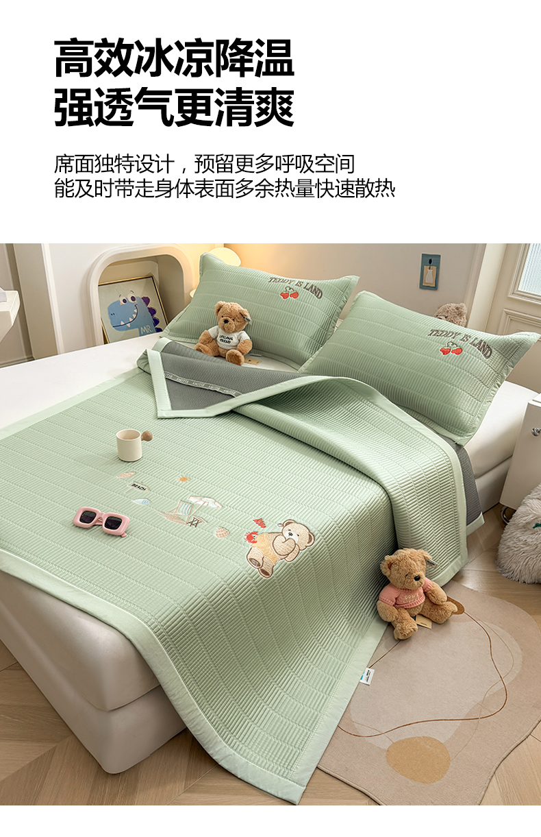 当前位置: 91家纺网 > 商品网购 > 床上用品 > 凉席 > 凉席套件 > 慕木家纺 2026新款A类高端刺绣pe乙纶冰豆豆席爱兰系列正版授权(提供买家秀) 青屿熊语-绿床席款