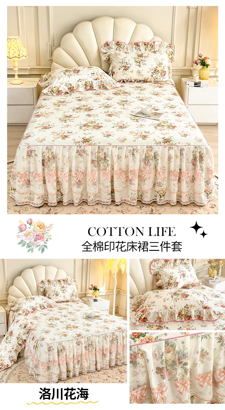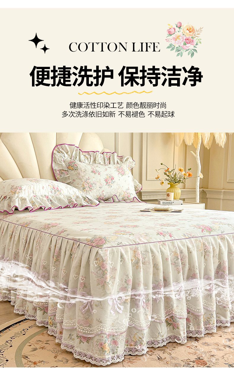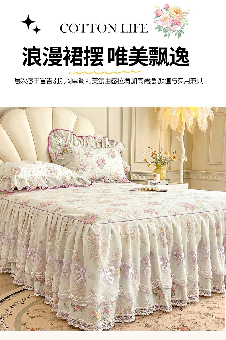 当前位置: 91家纺网 > 商品网购 > 床品套件 > 三件套 > 宜凡家纺 2026新款全棉公主风单层床裙三件套 朝花心悦