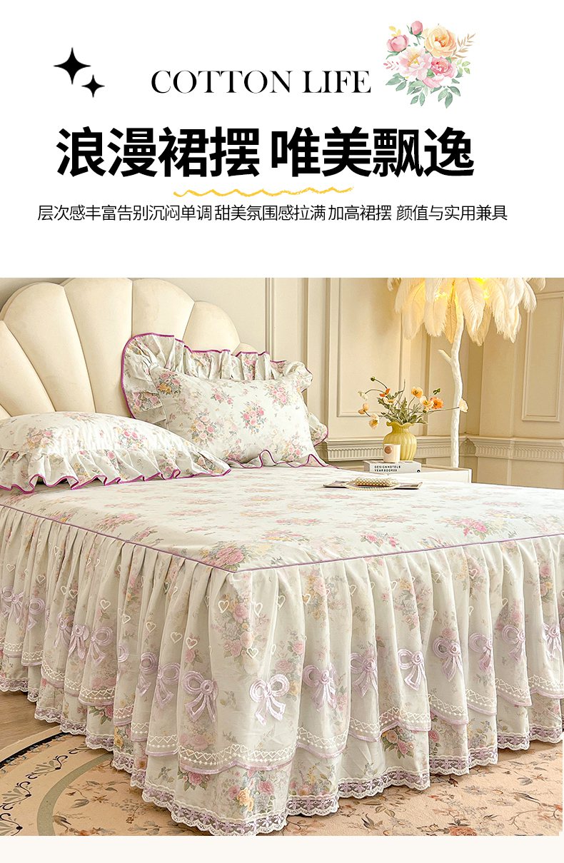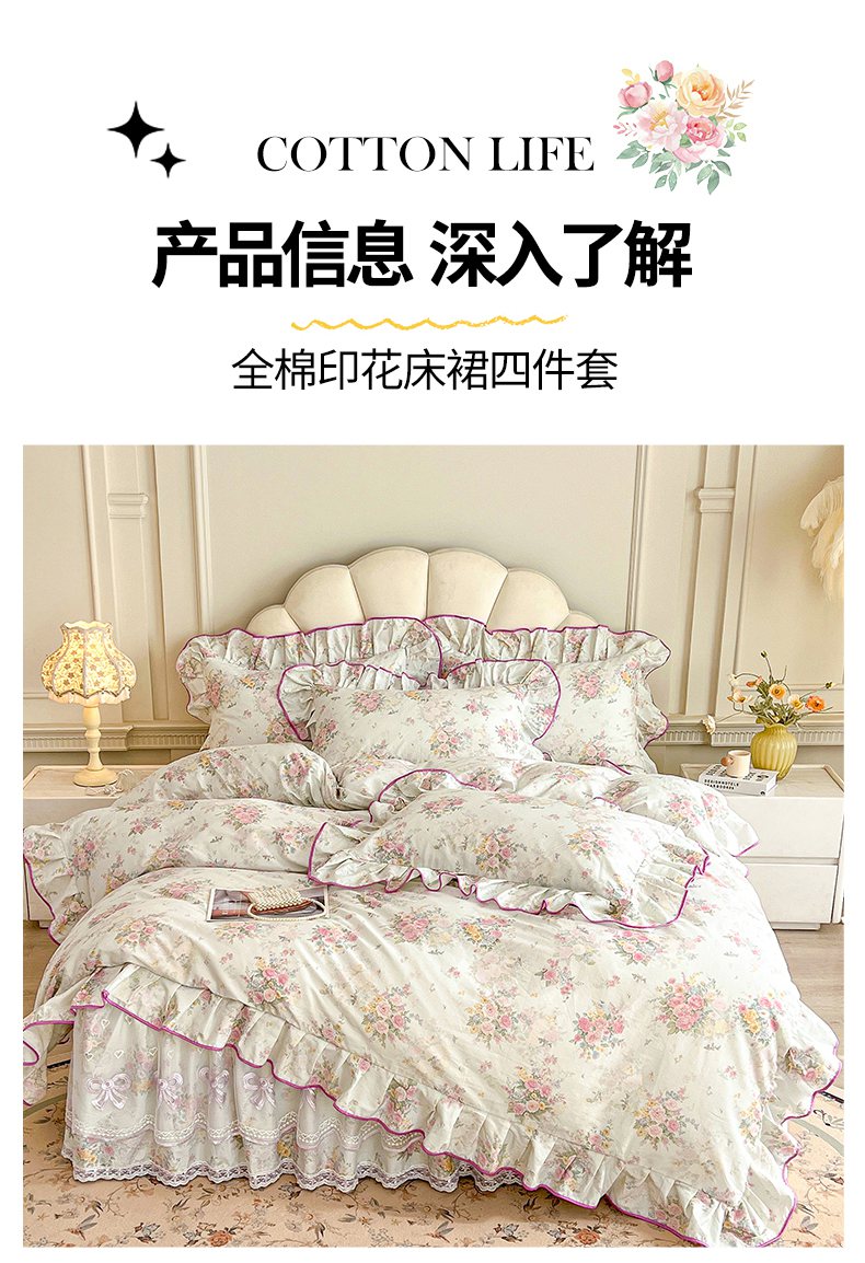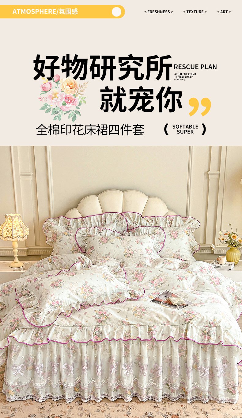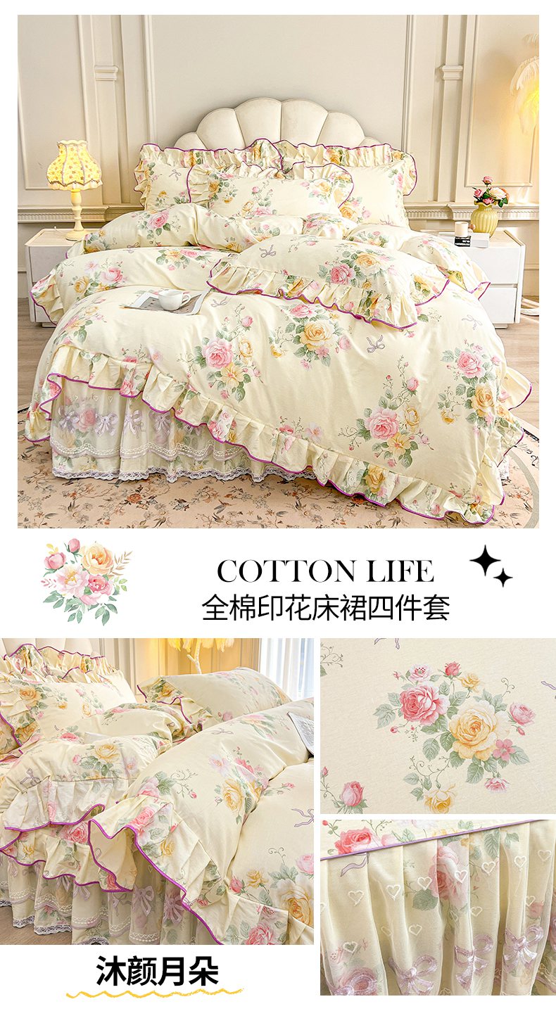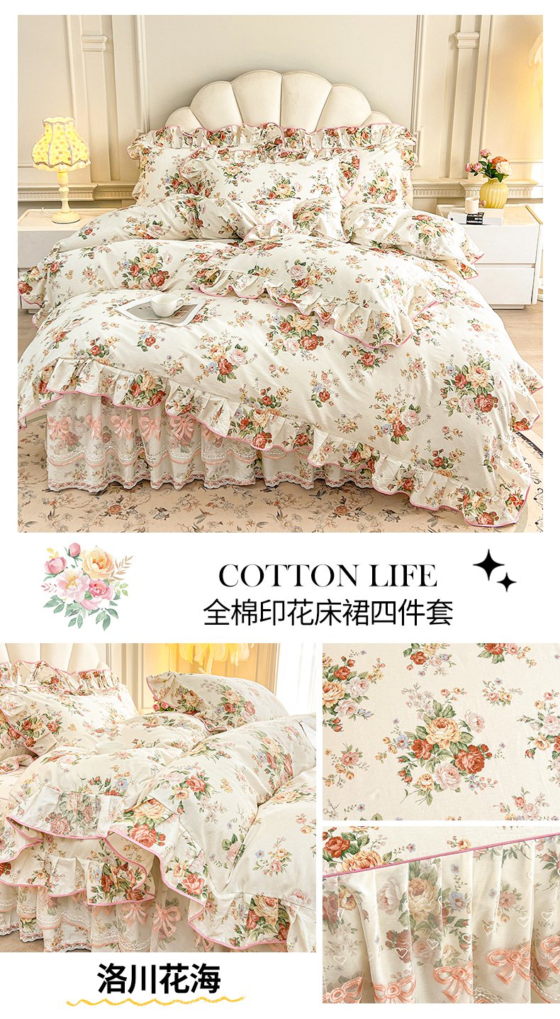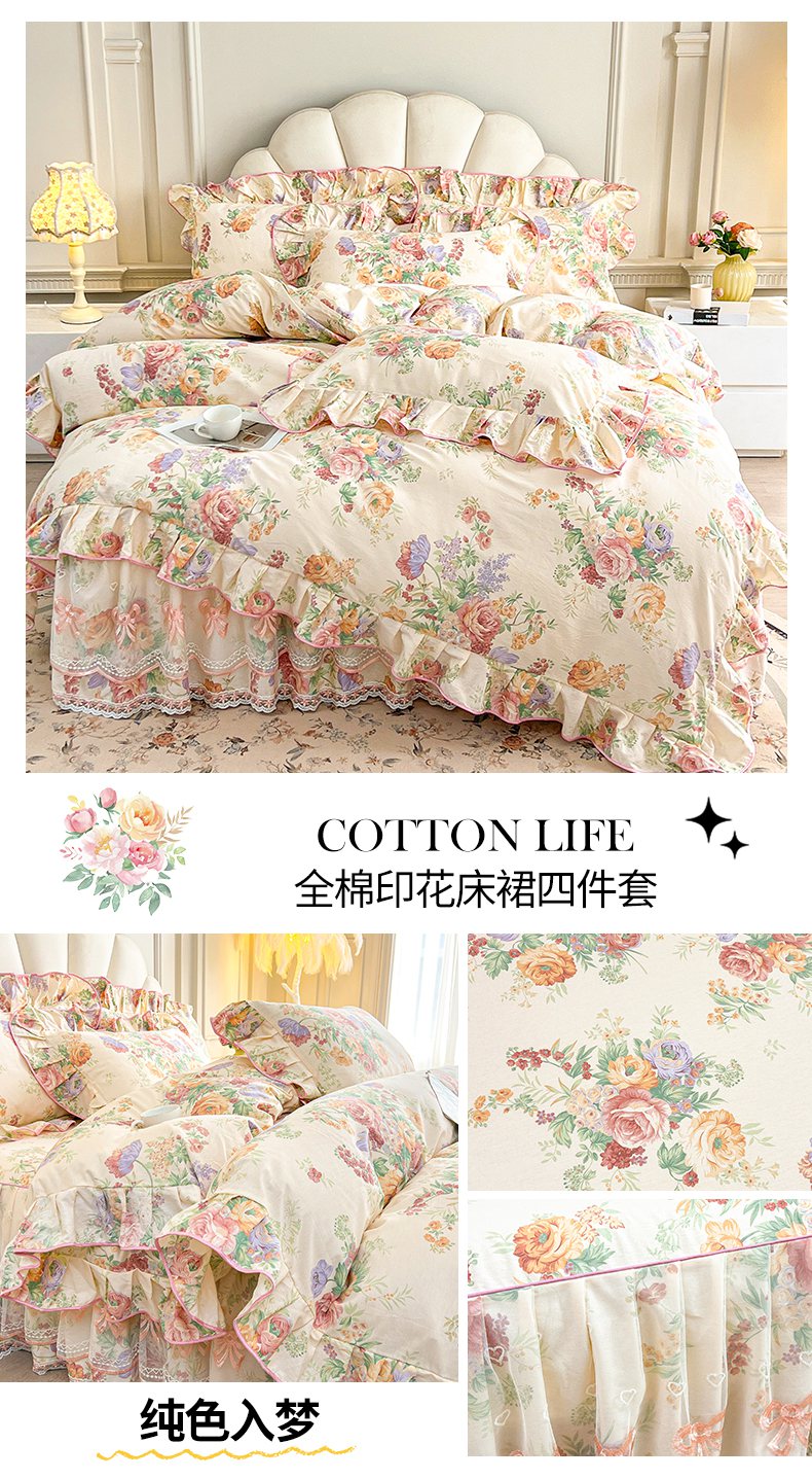 当前位置: 91家纺网 > 商品网购 > 床品套件 > 四件套 > 全棉普通四件套 > 宜凡家纺 2026新款全棉印花公主风单层床裙四件套 朝花心悦