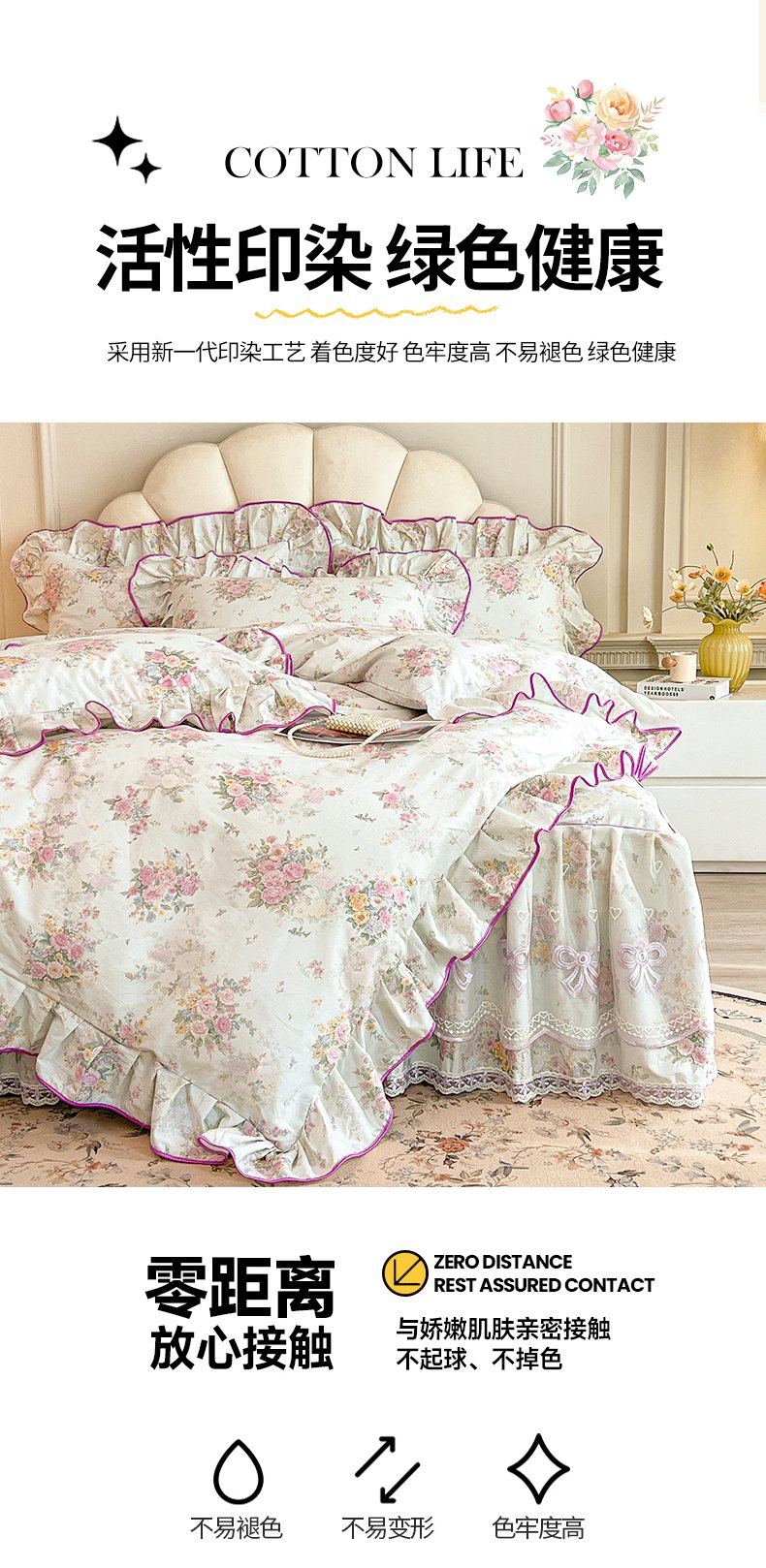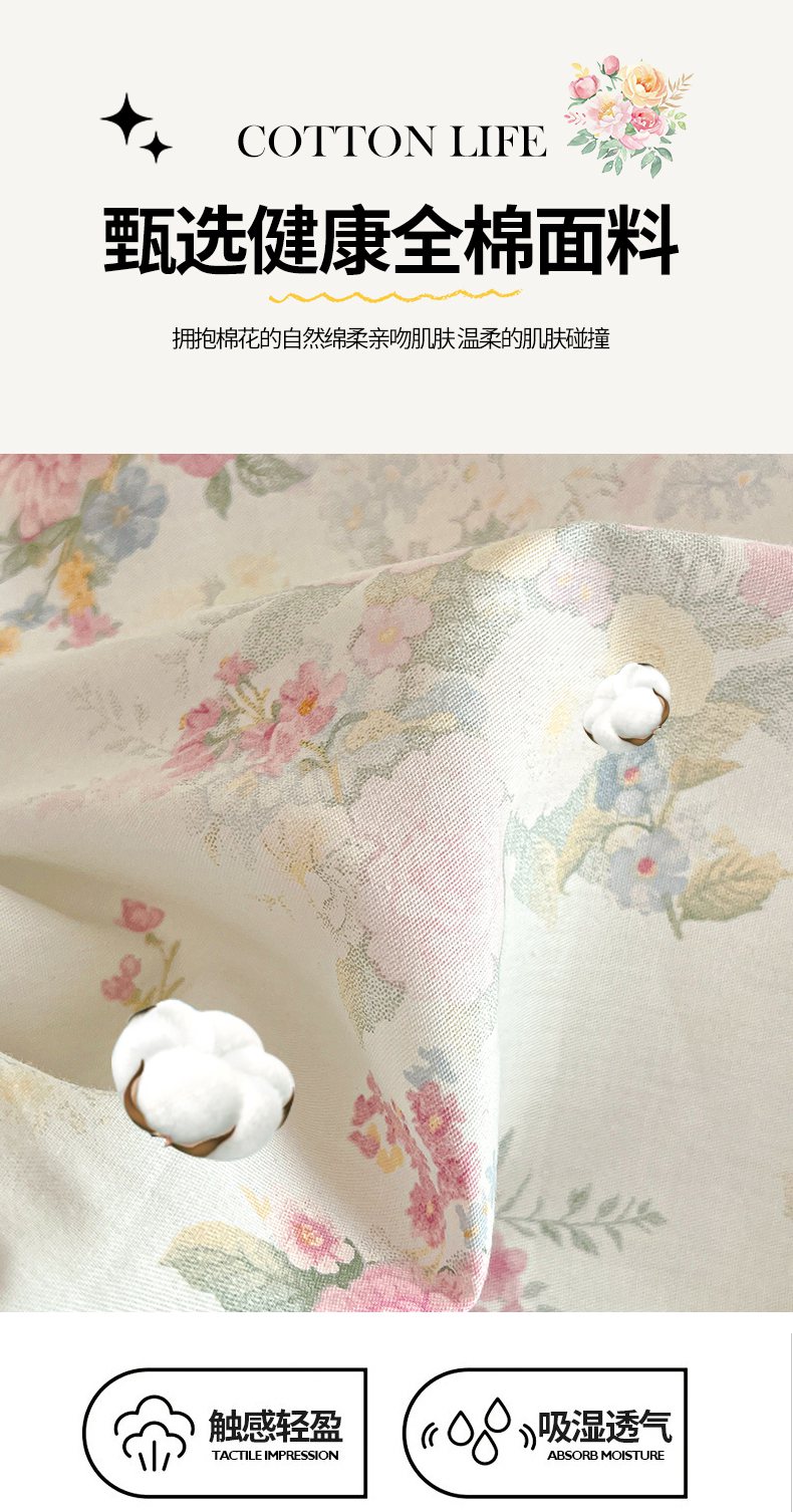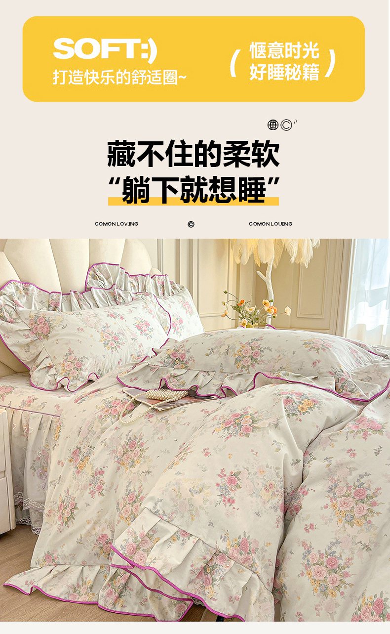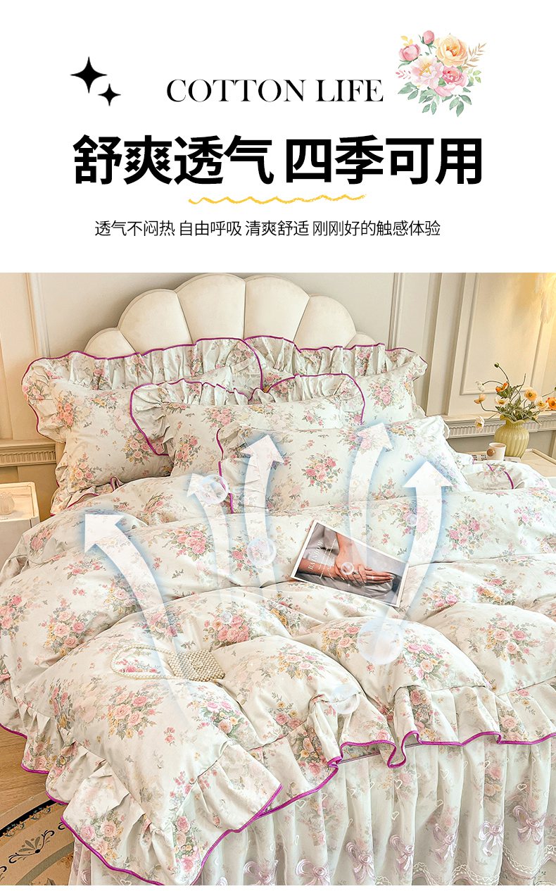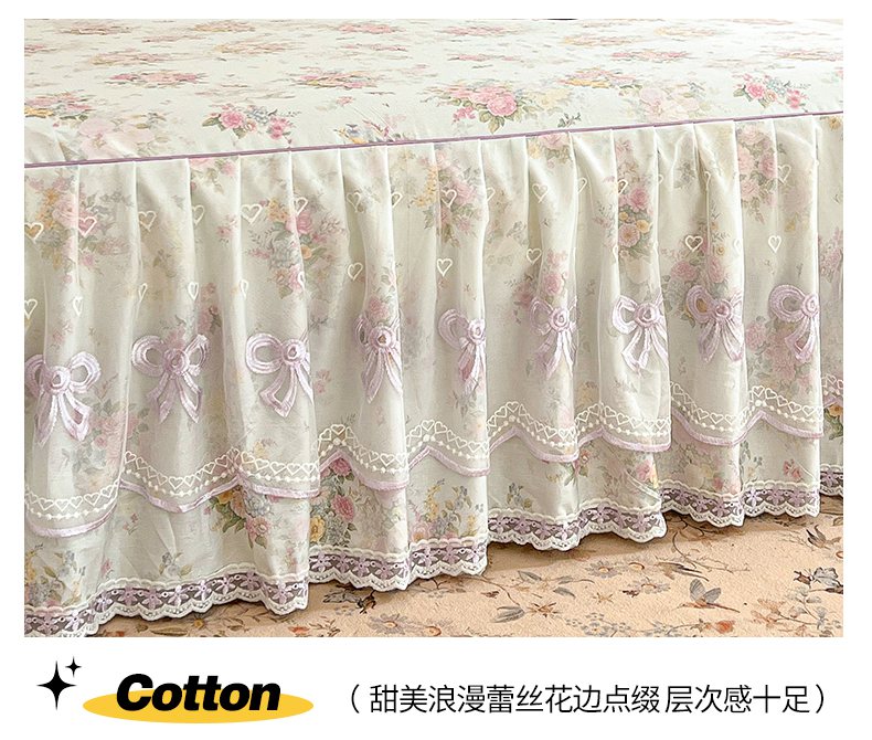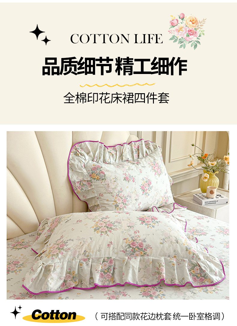 当前位置: 91家纺网 > 商品网购 > 床品套件 > 四件套 > 全棉普通四件套 > 宜凡家纺 2026新款全棉印花公主风单层床裙四件套 朝花心悦
