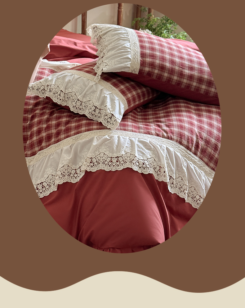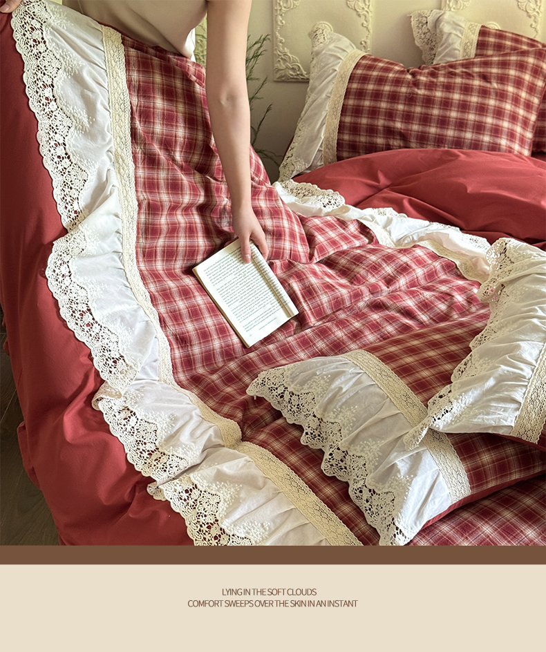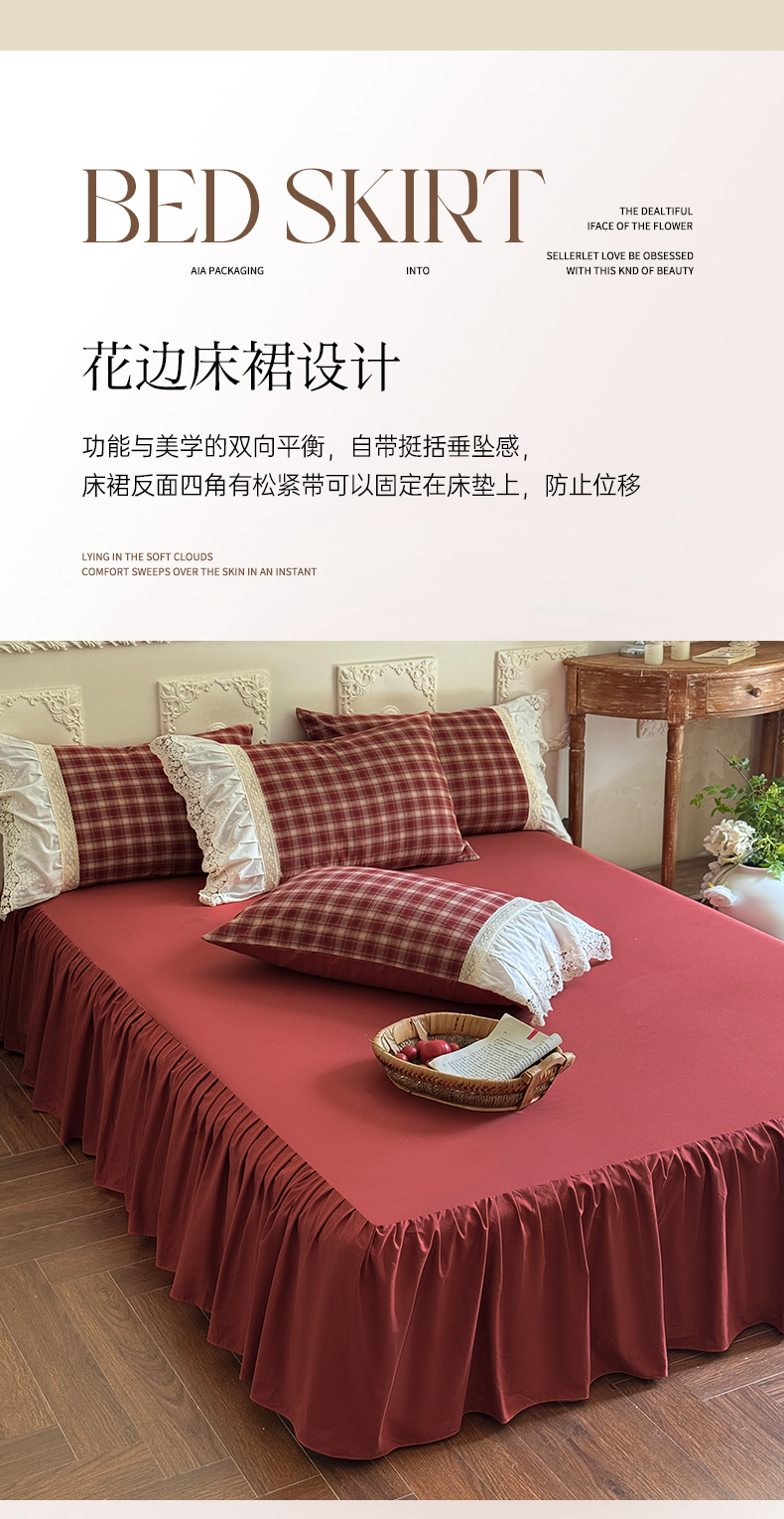 (总)花香四季家纺 2026全棉色织水洗棉法式公主风花边床单款床笠款四件套,初见咖,高智黑,米兰红,南初咖,云漫黑