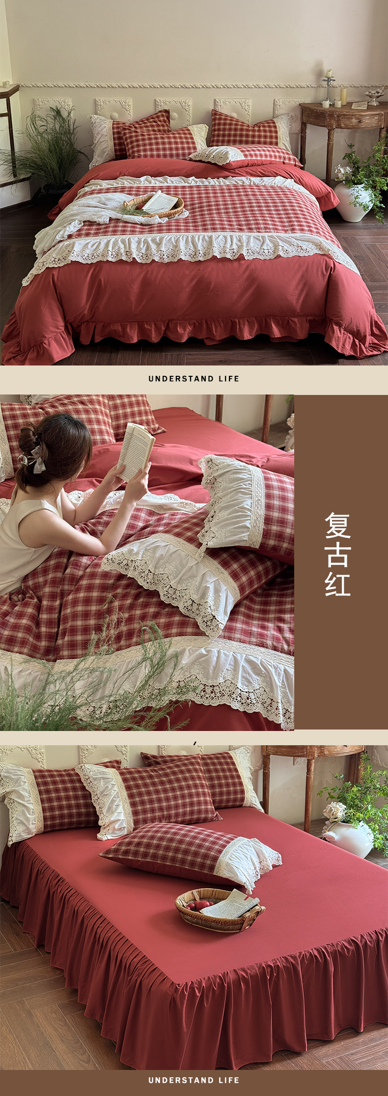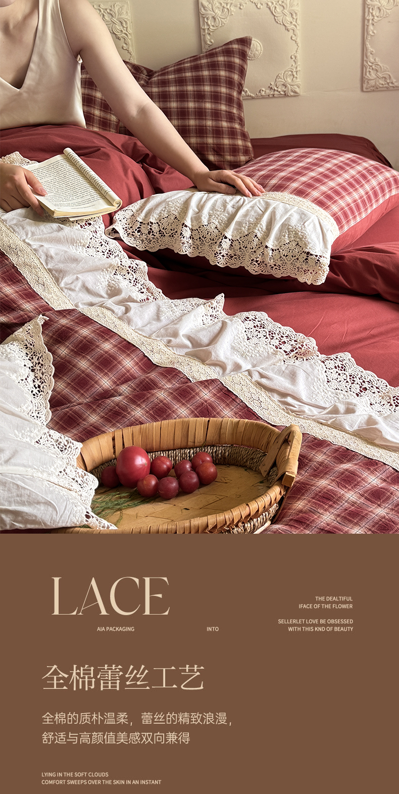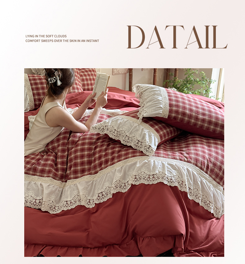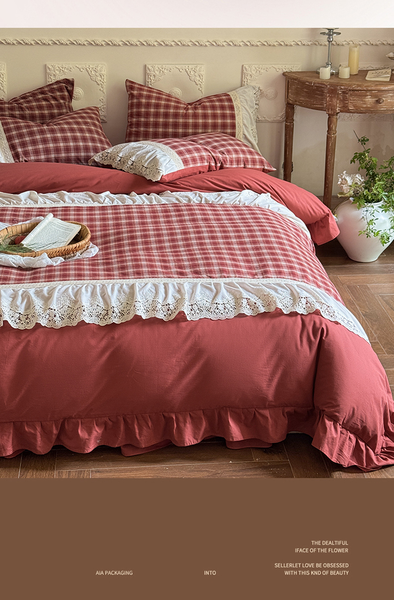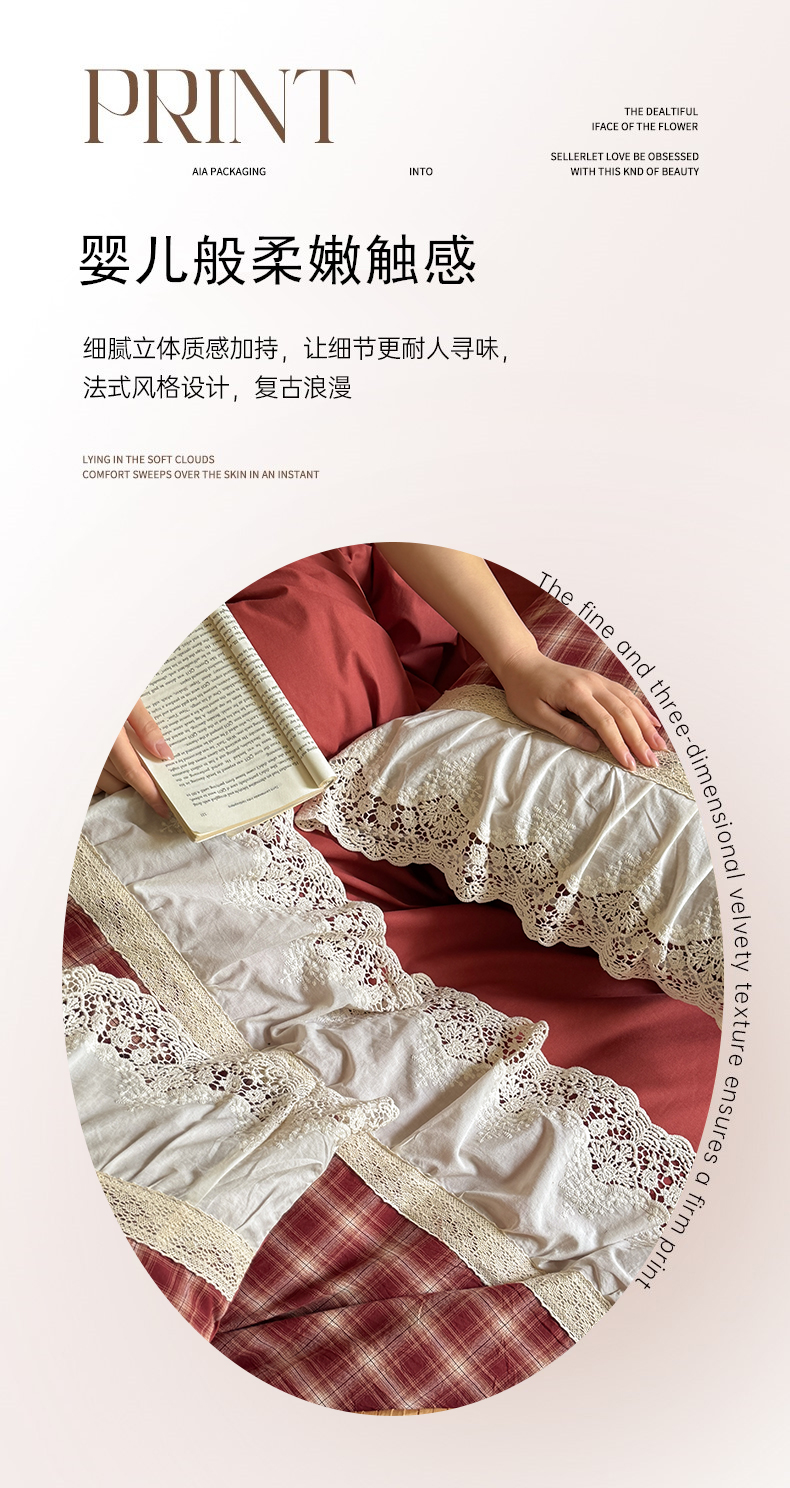 • 91家纺网 家纺一手货源 找家纺 (总)花香四季家纺 2026全棉色织水洗棉法式公主风花边床单款床笠款四件套,初见咖,高智黑,米兰红,南初咖,云漫黑