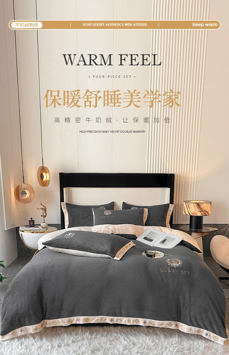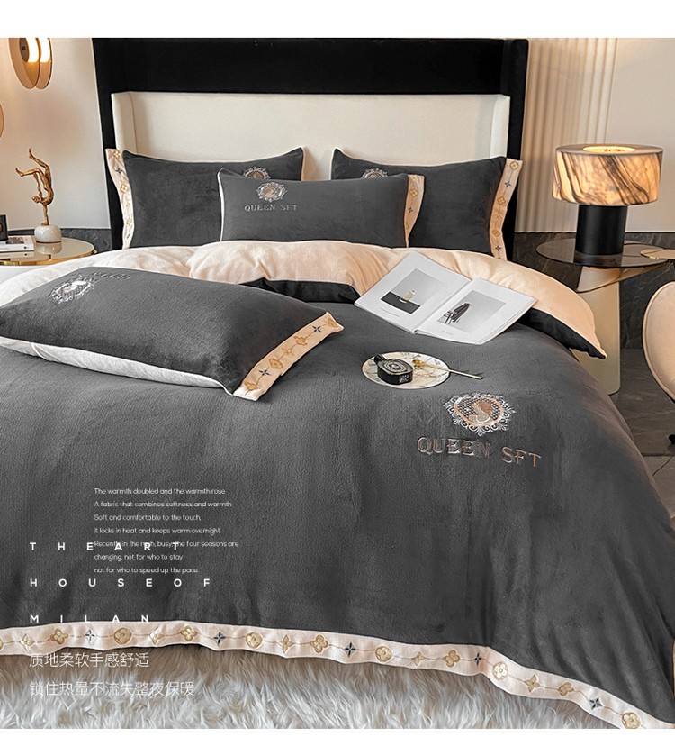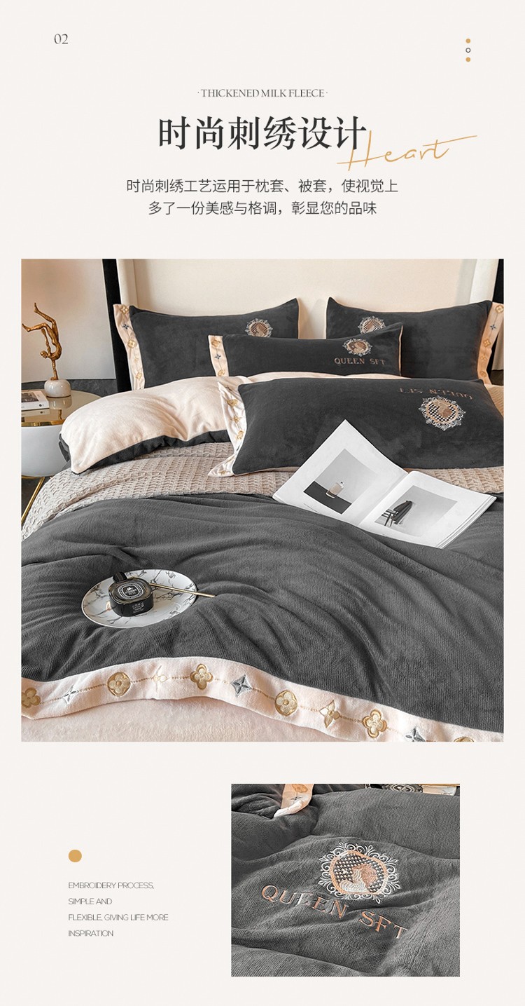 索飞特2021新款牛奶绒刺绣工艺款四件套 漫渡莎-魅力灰