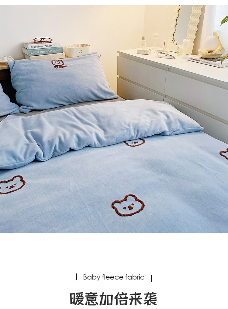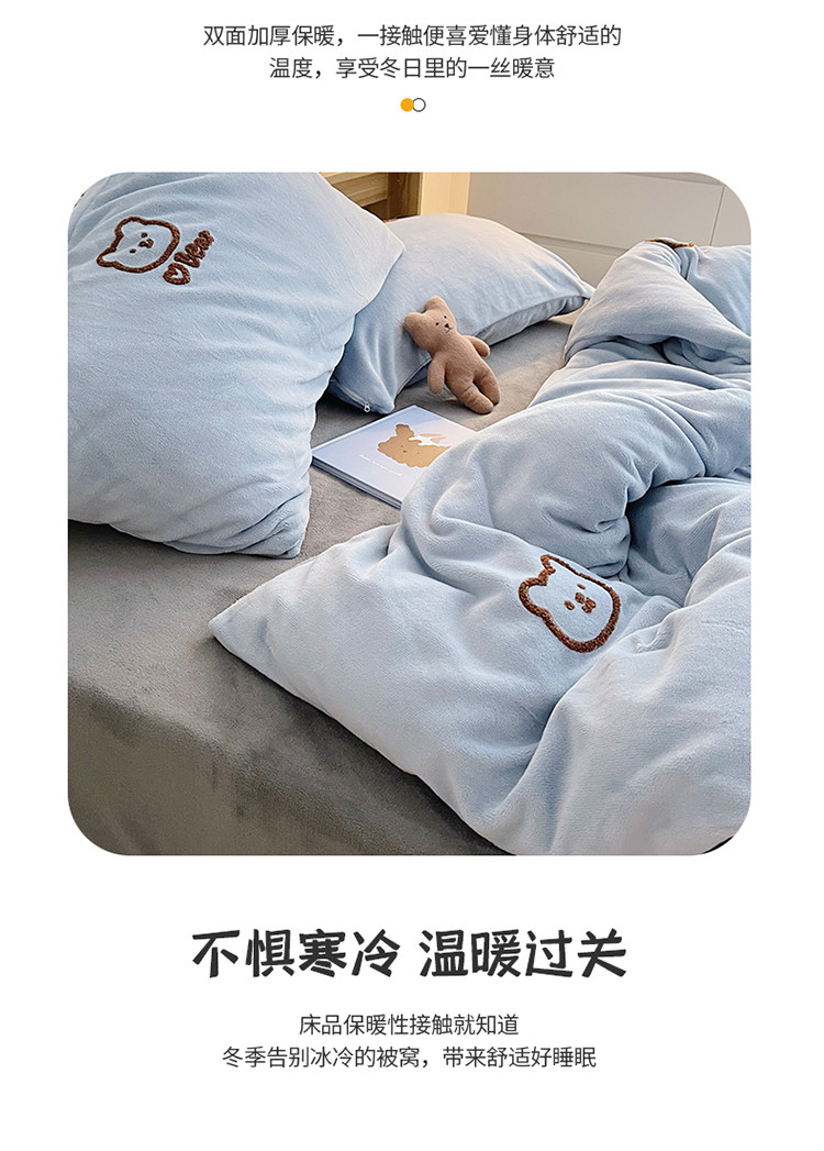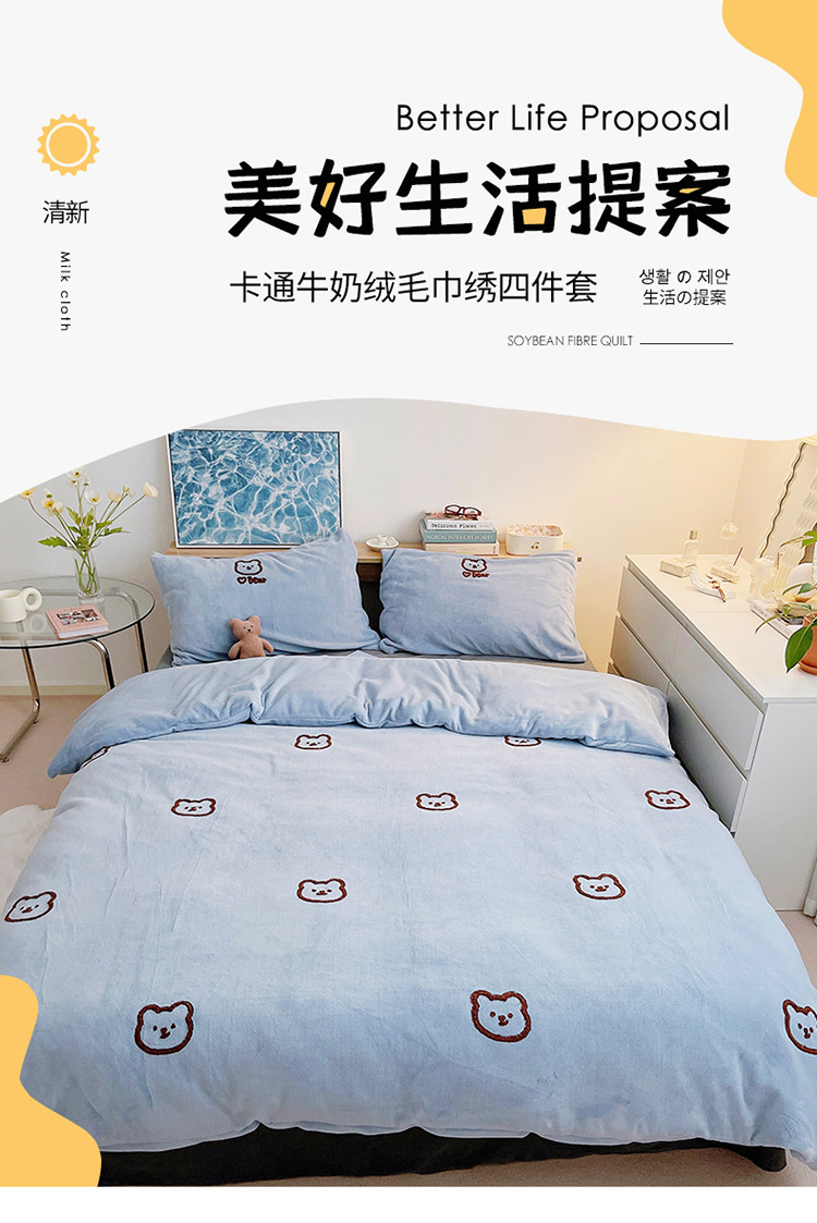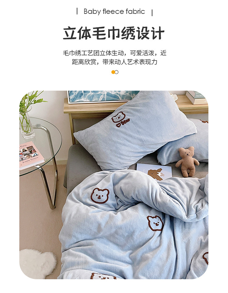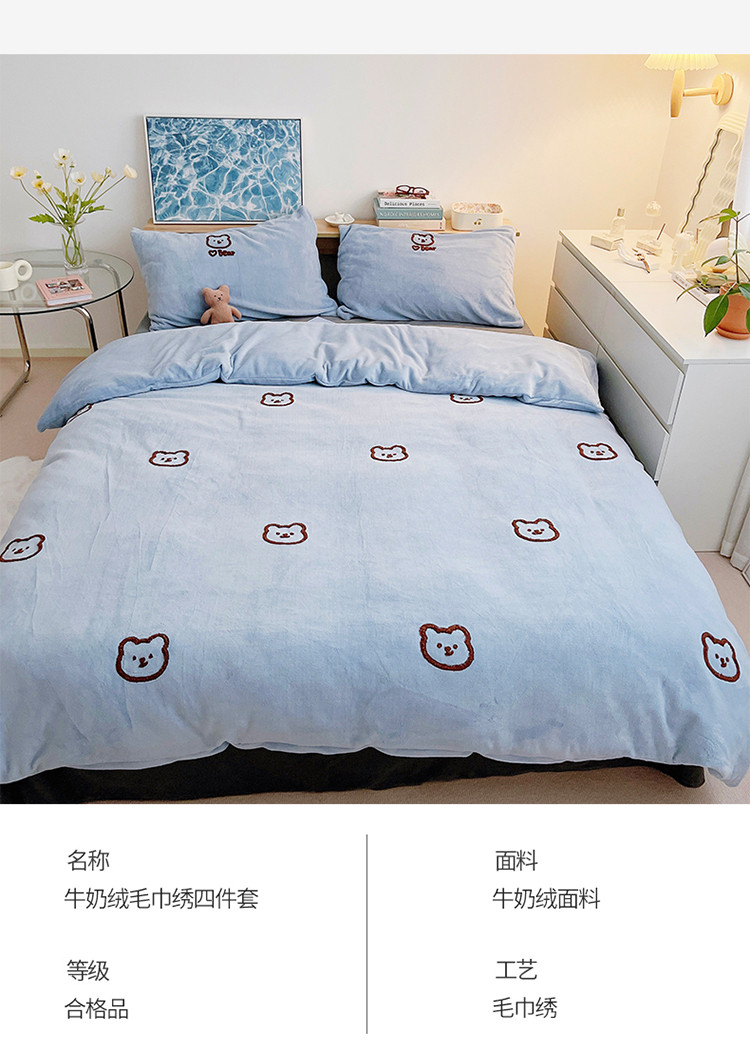 商品名称:雅居纺 2022新款牛奶绒毛巾绣四件套拍摄风格1 可爱熊-蓝灰