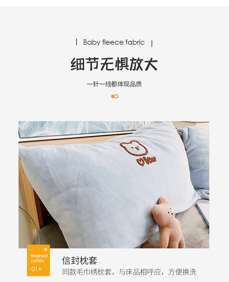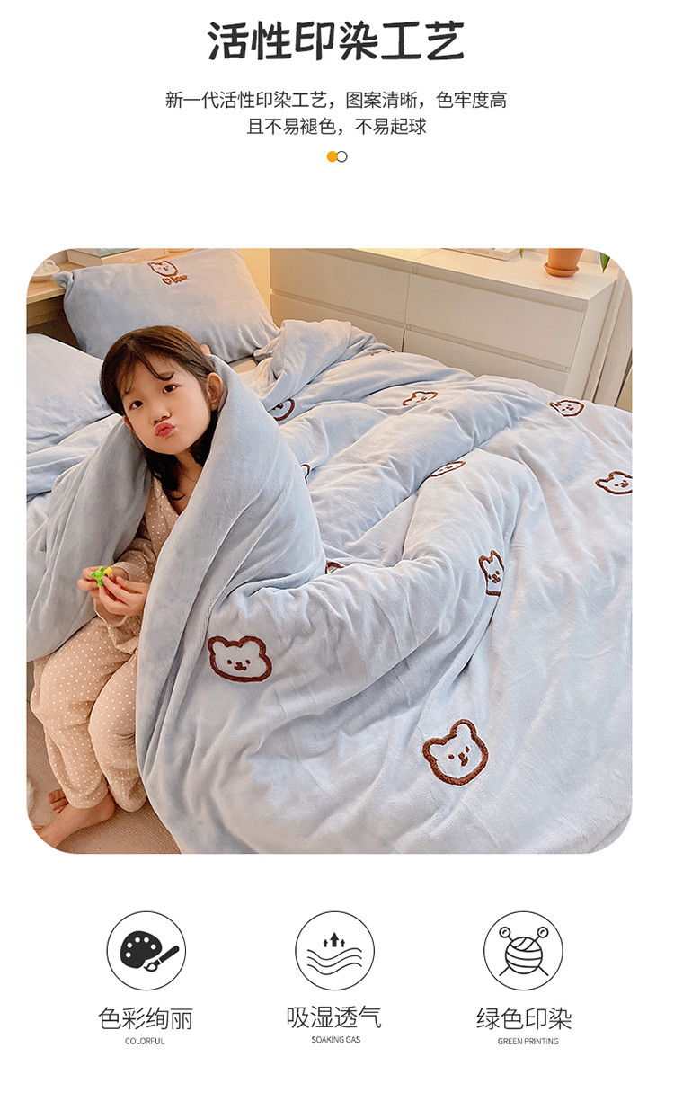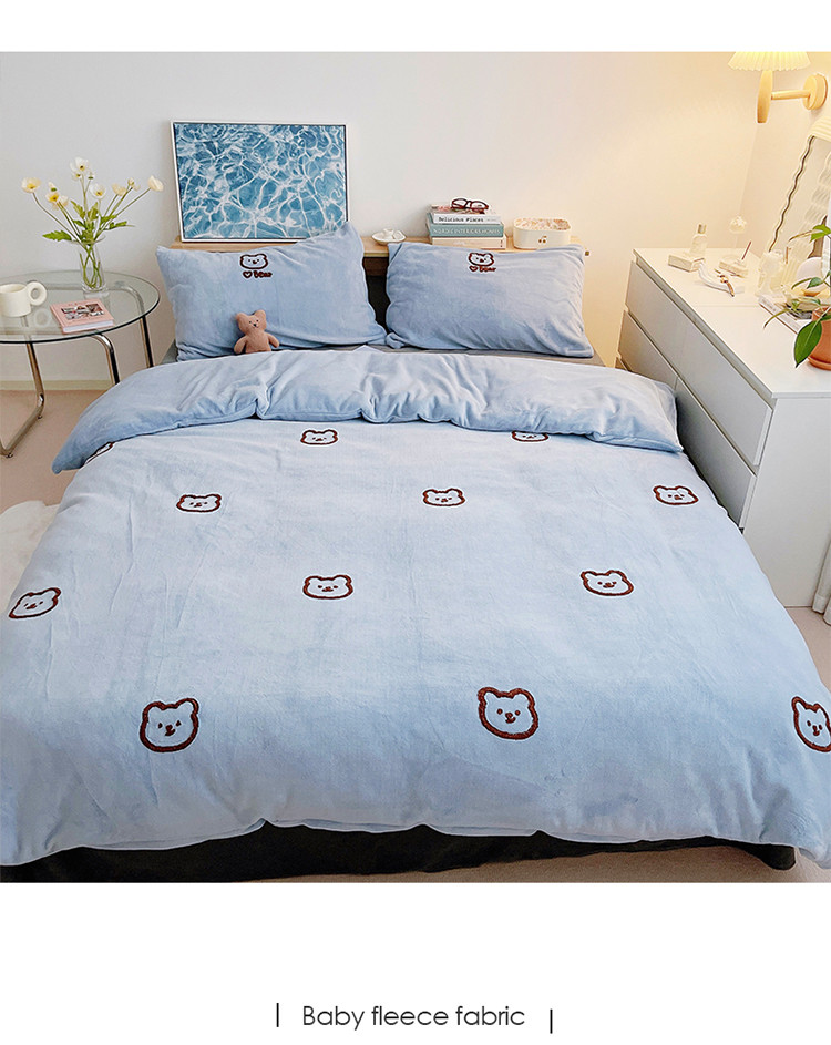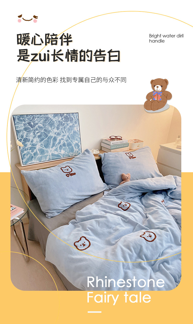 商品名称:雅居纺 2022新款牛奶绒毛巾绣四件套拍摄风格1 可爱熊-蓝灰